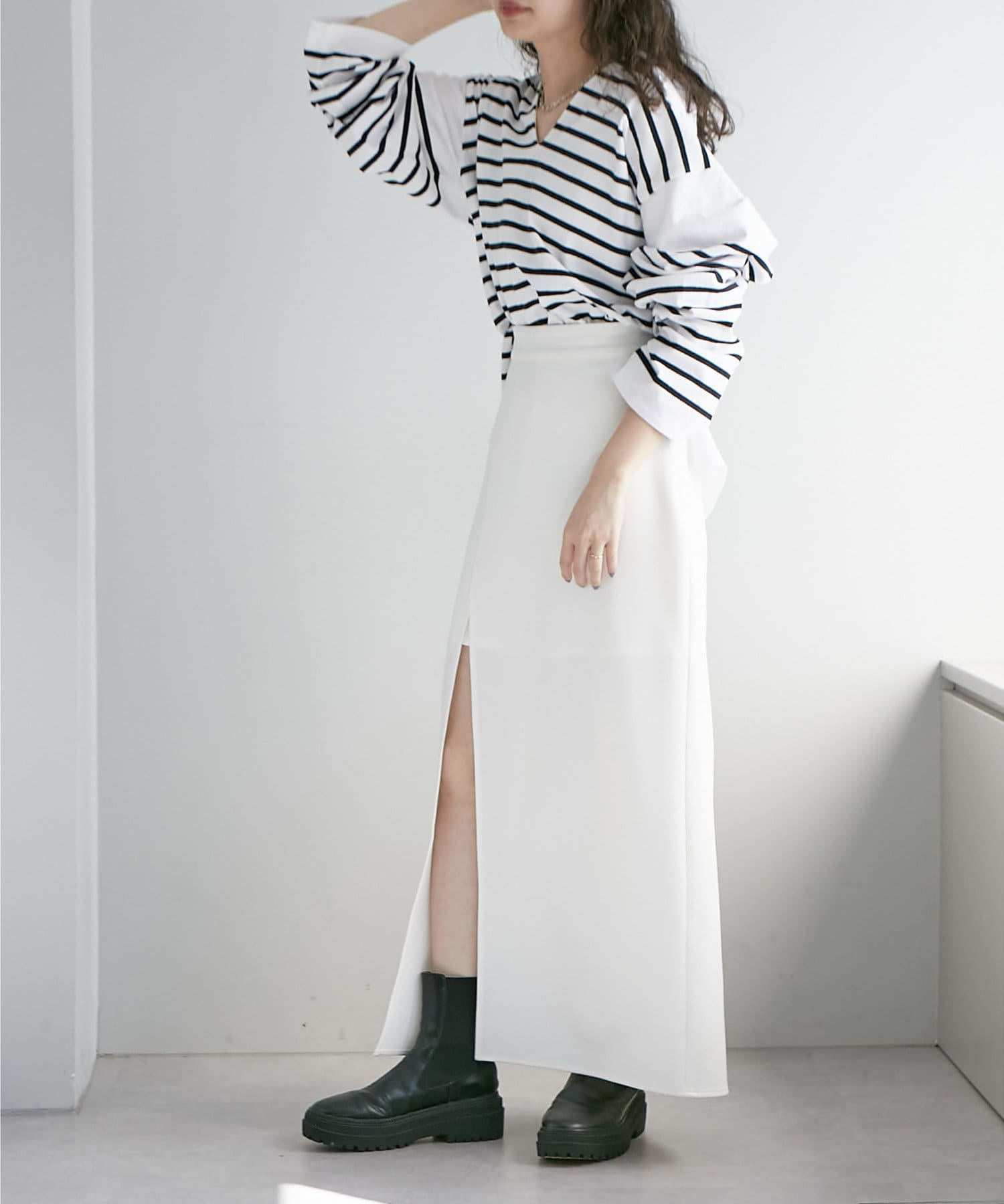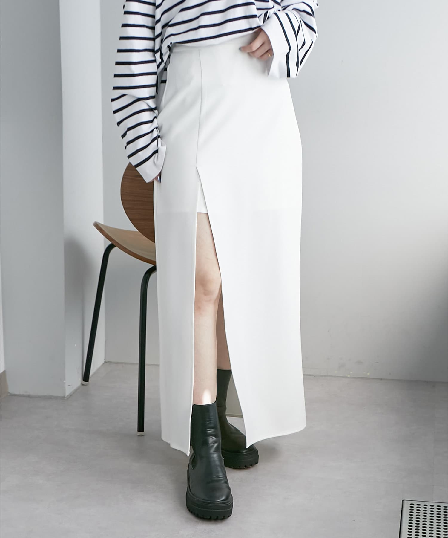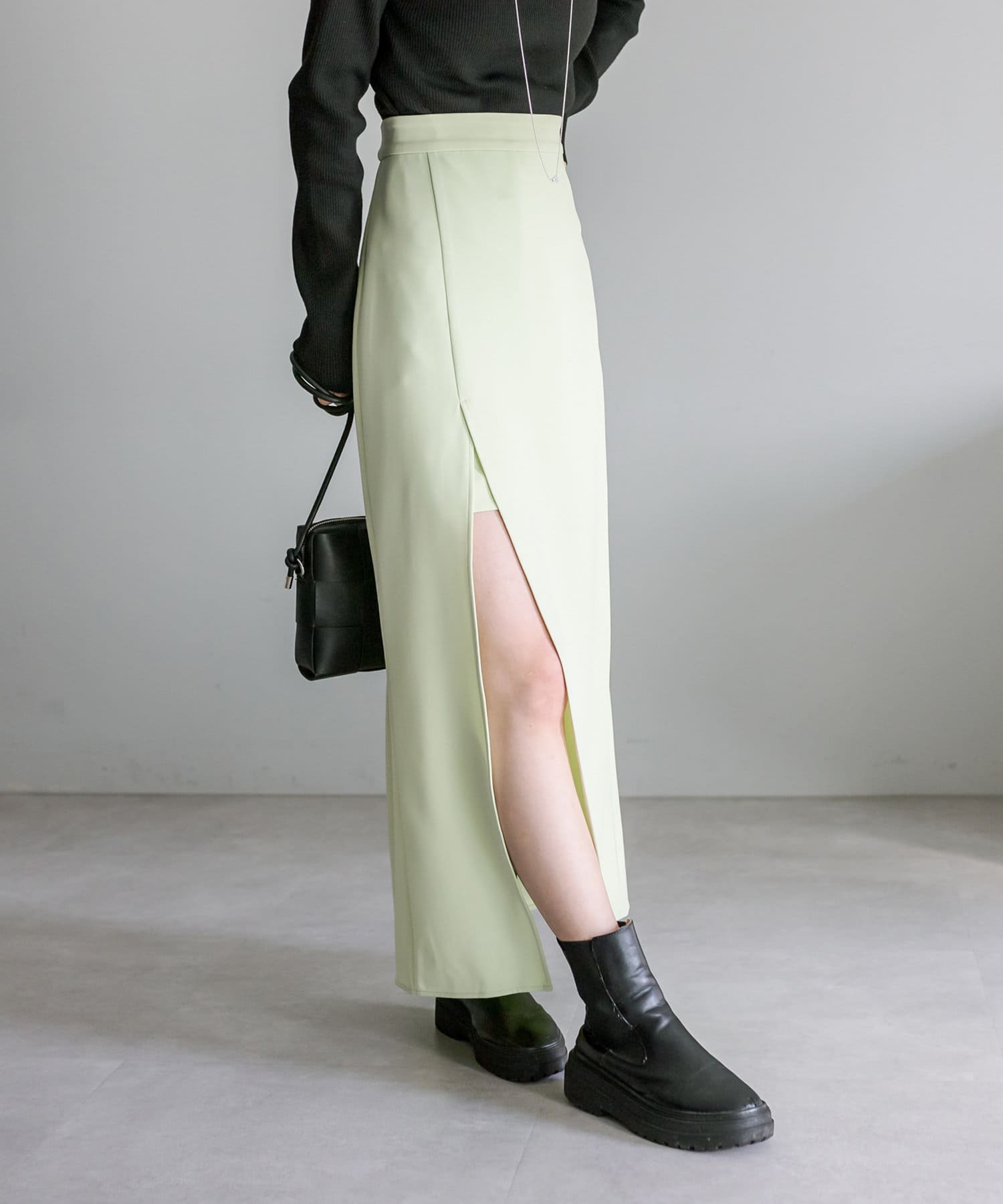 ・スリットから見える足元が程よい抜け感をプラスしてくれます。
