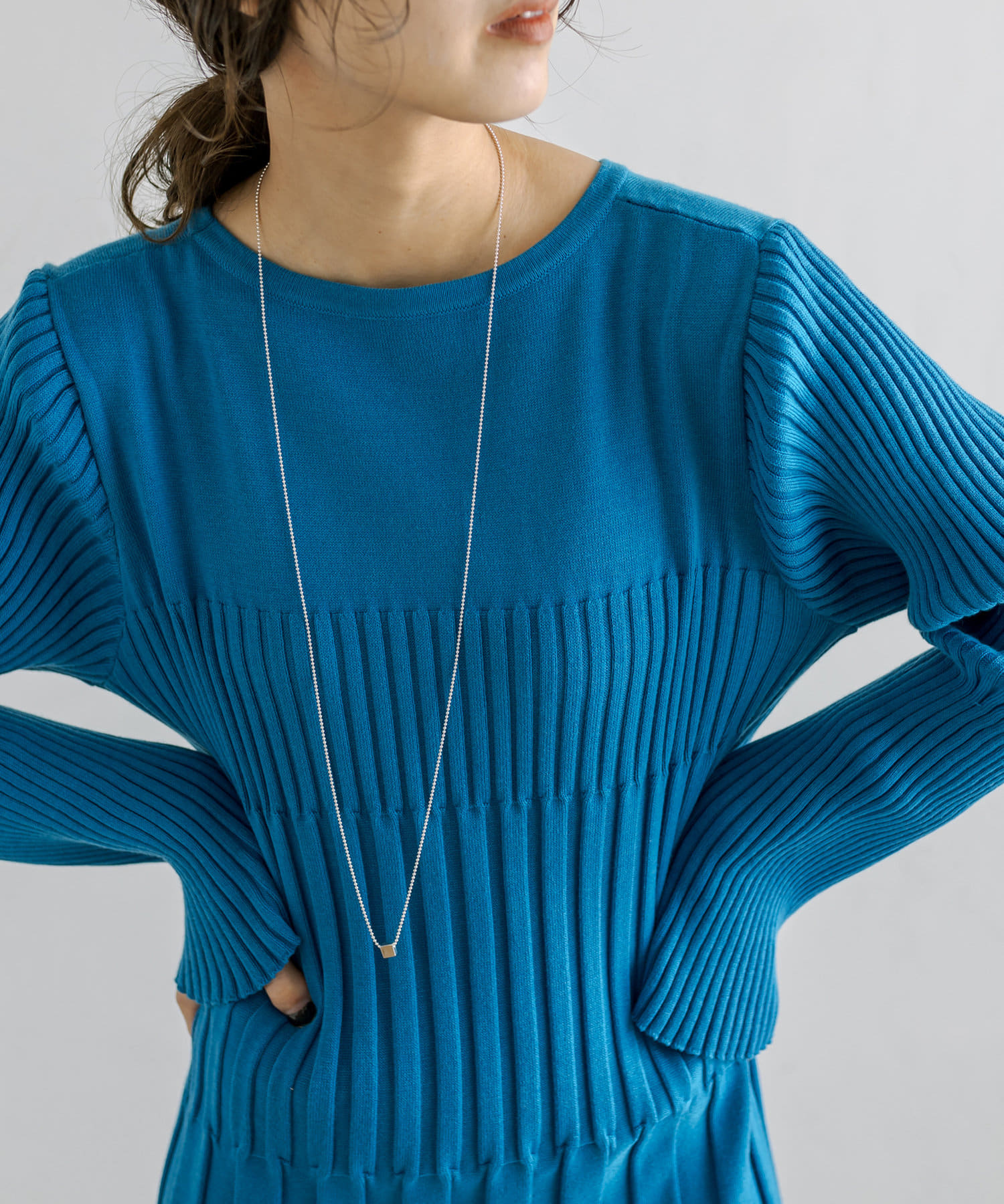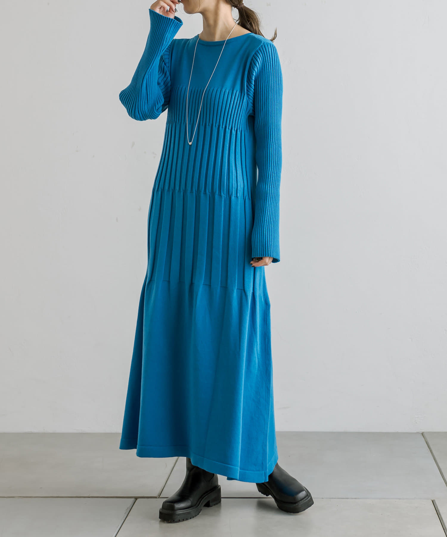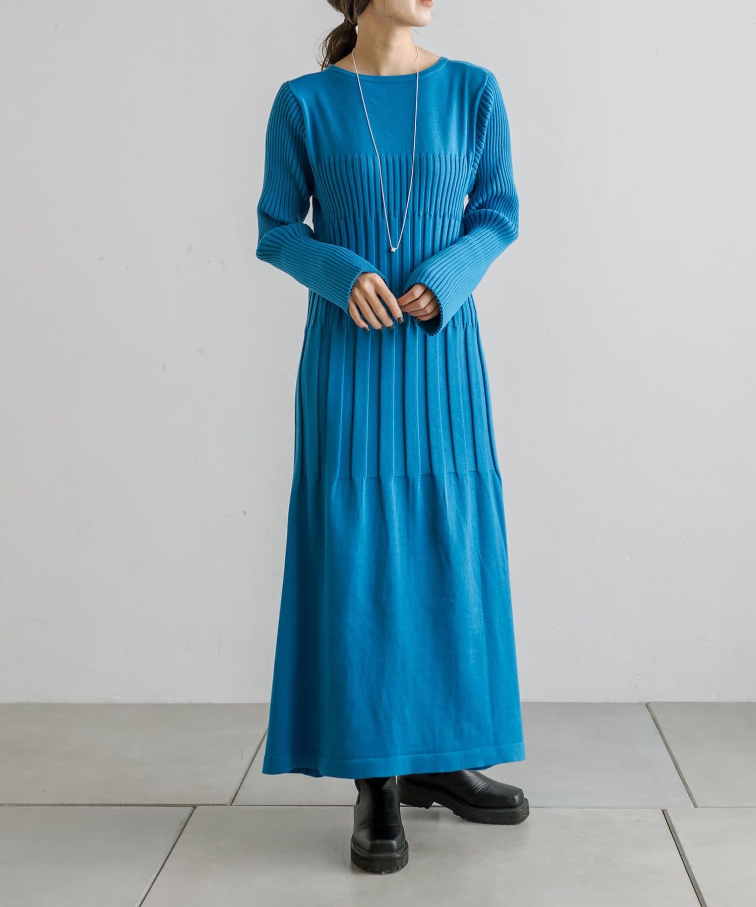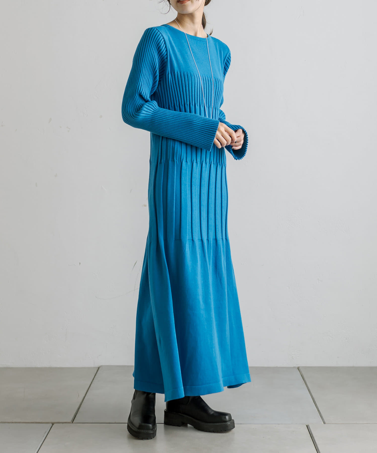 鮮やかなブルーで目を引くワンピースだと思います。