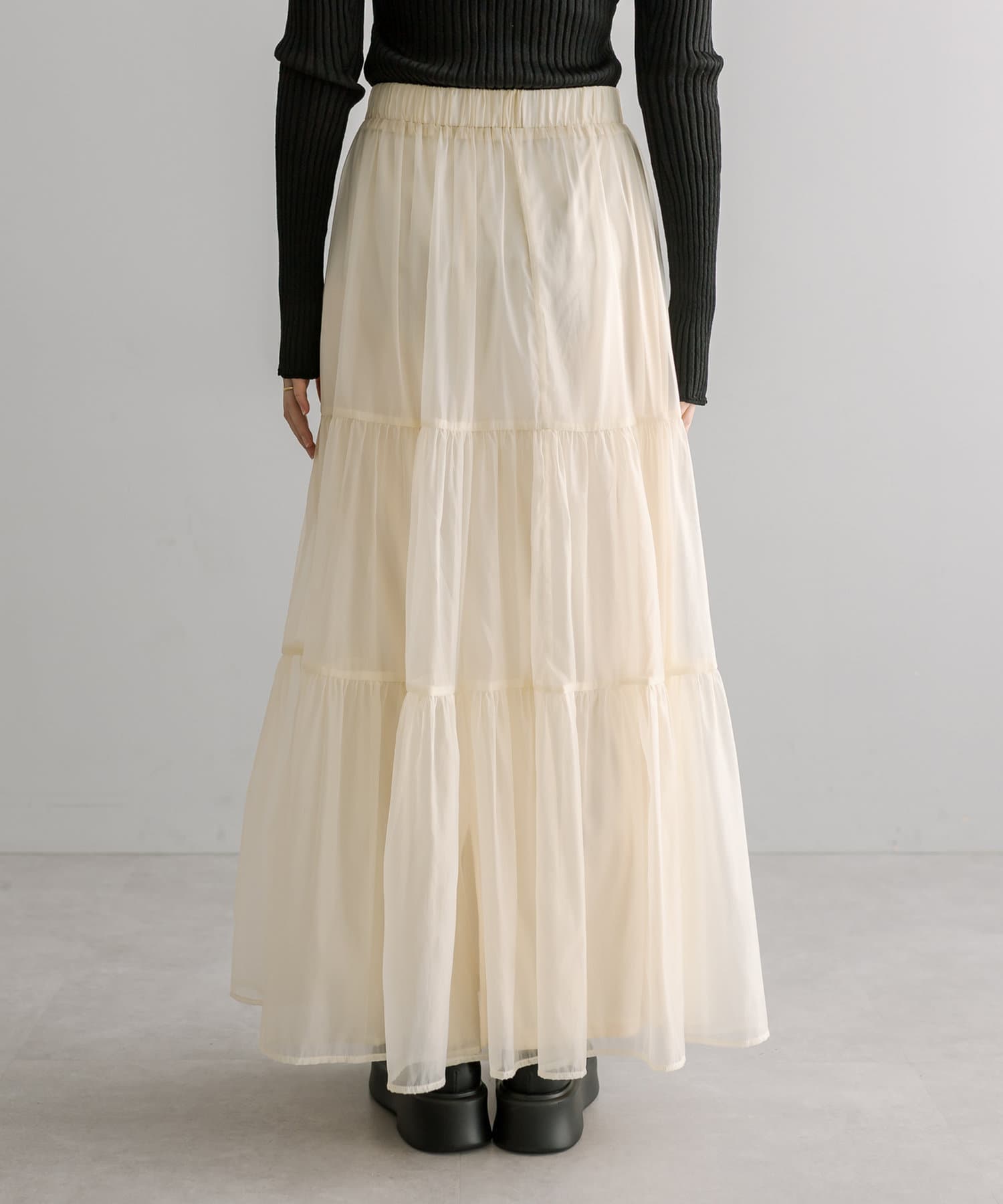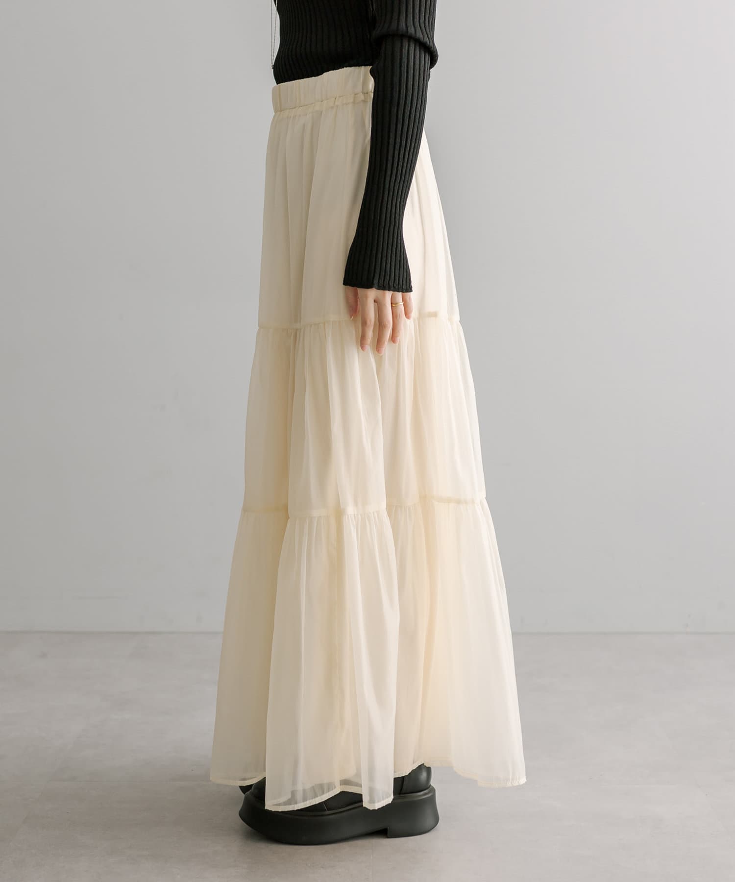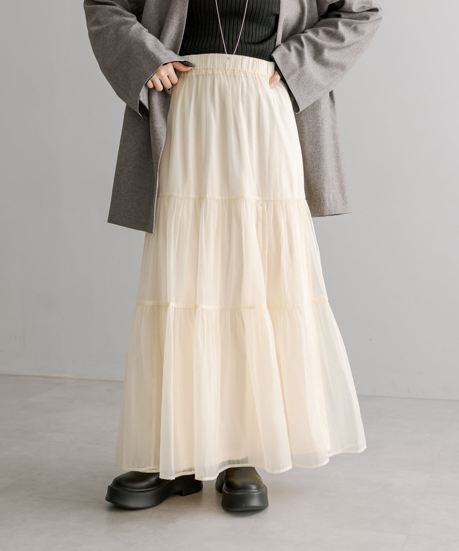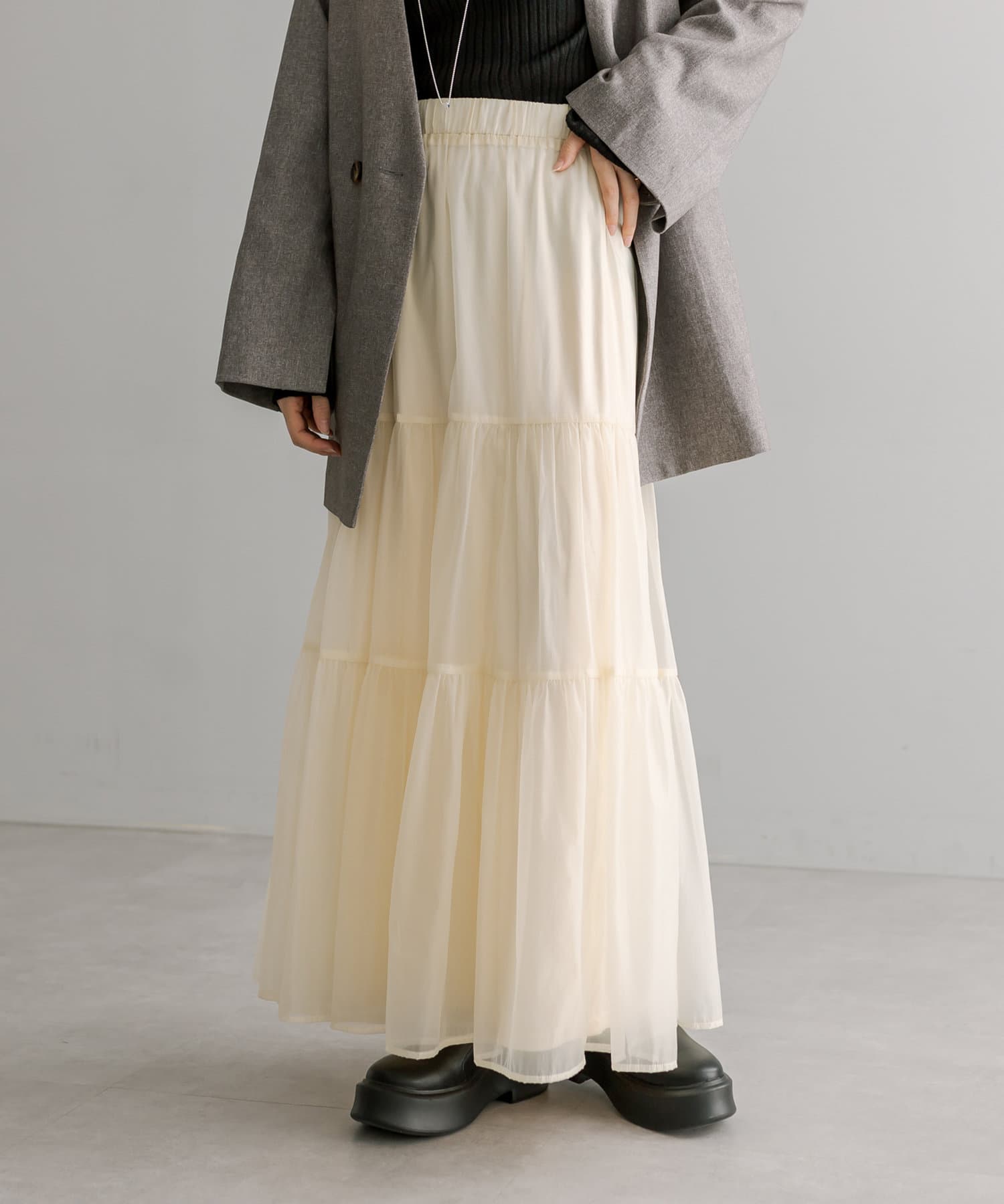 ・春らしいシアー素材で女性らしく決まるティアードスカート。
