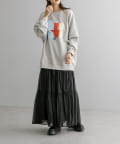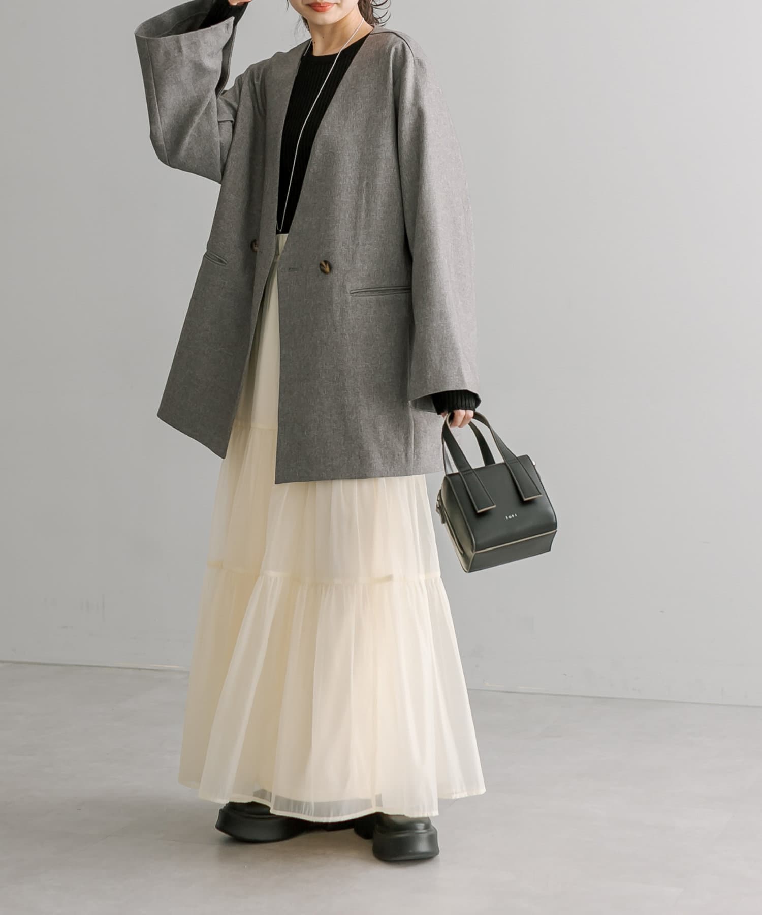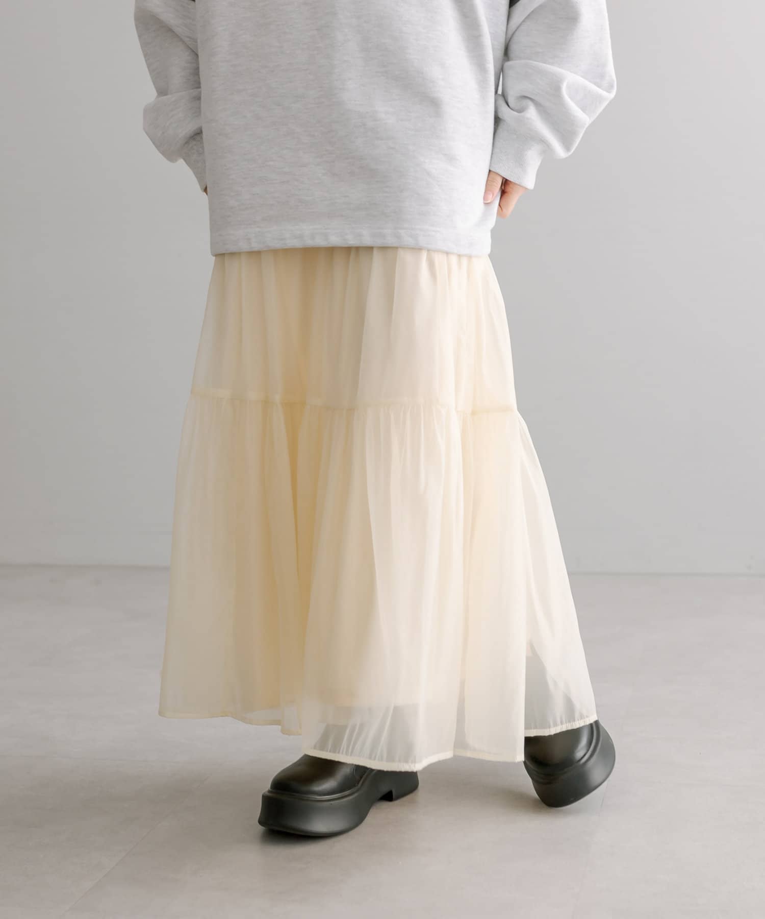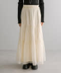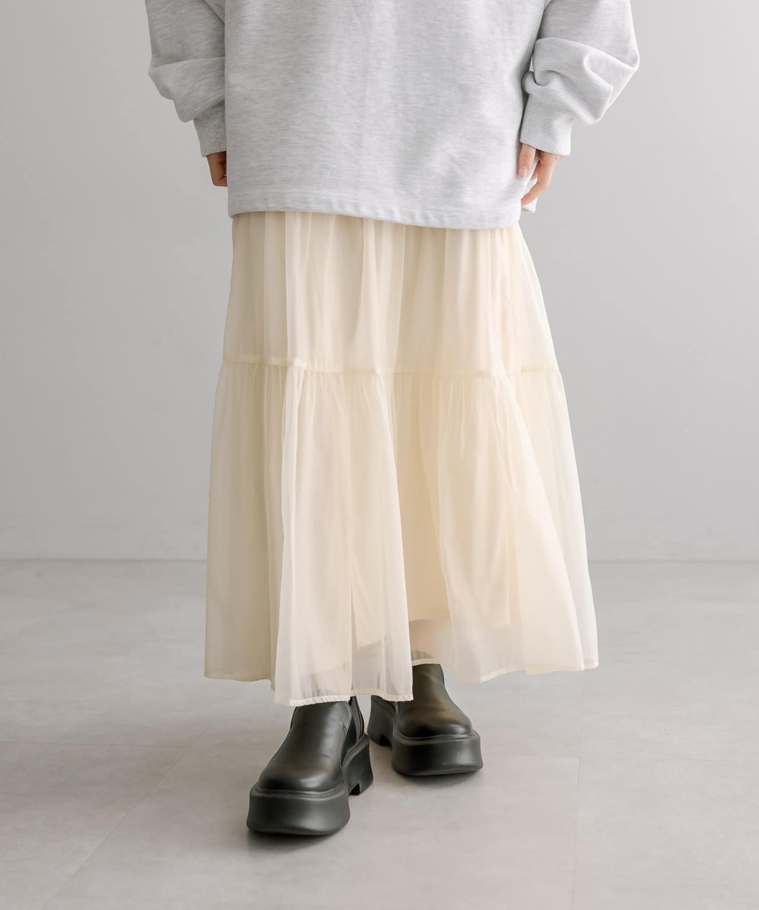 ・春らしいシアー素材で女性らしく決まるティアードスカート。