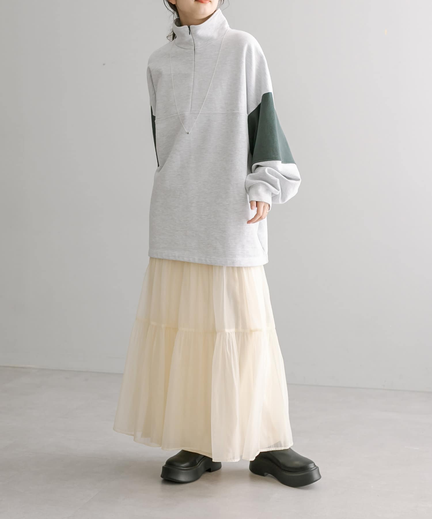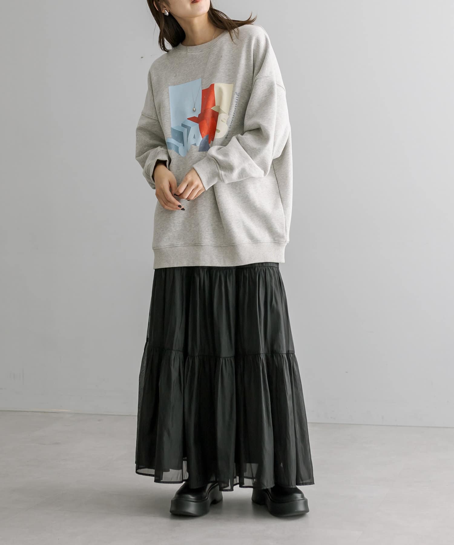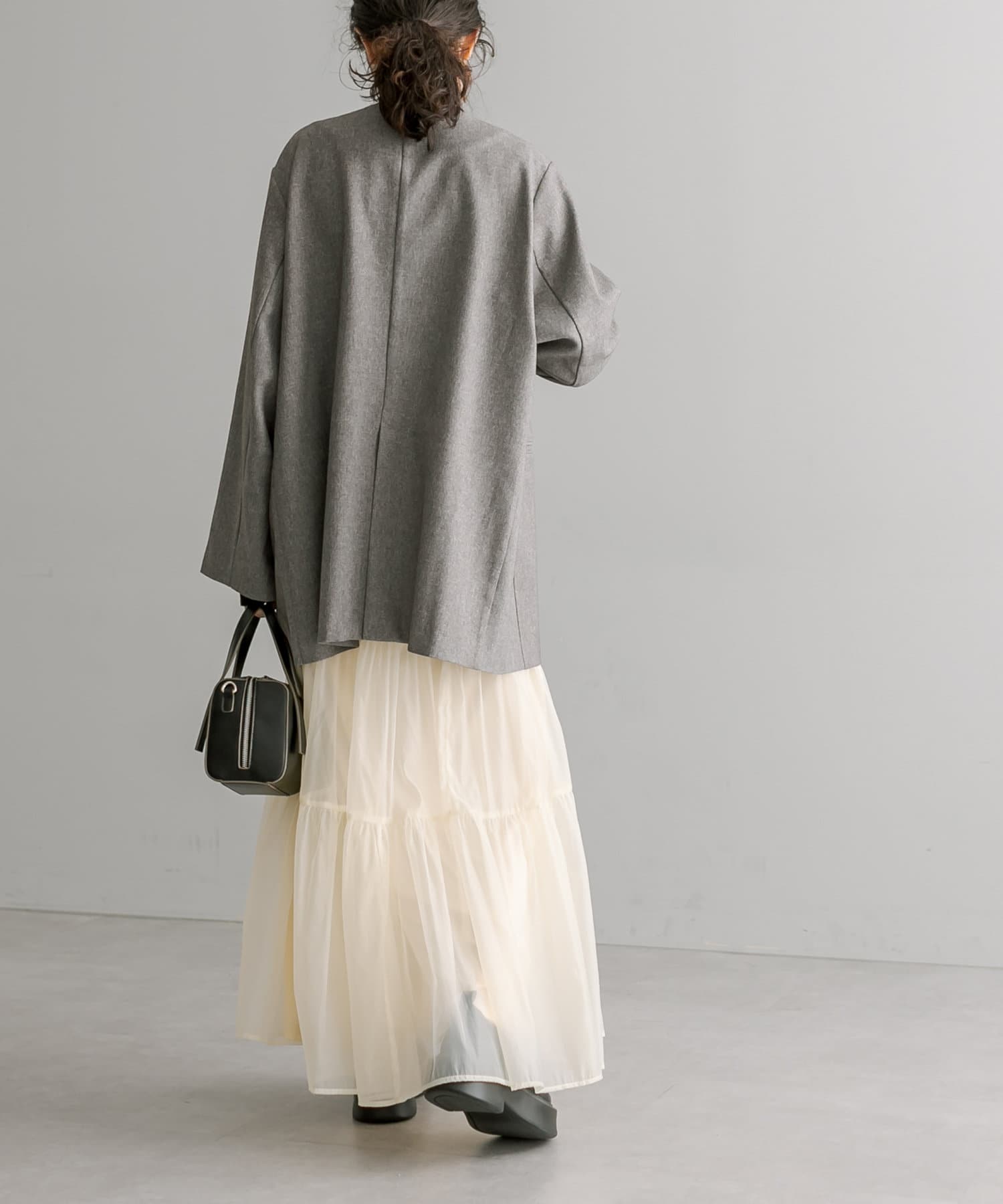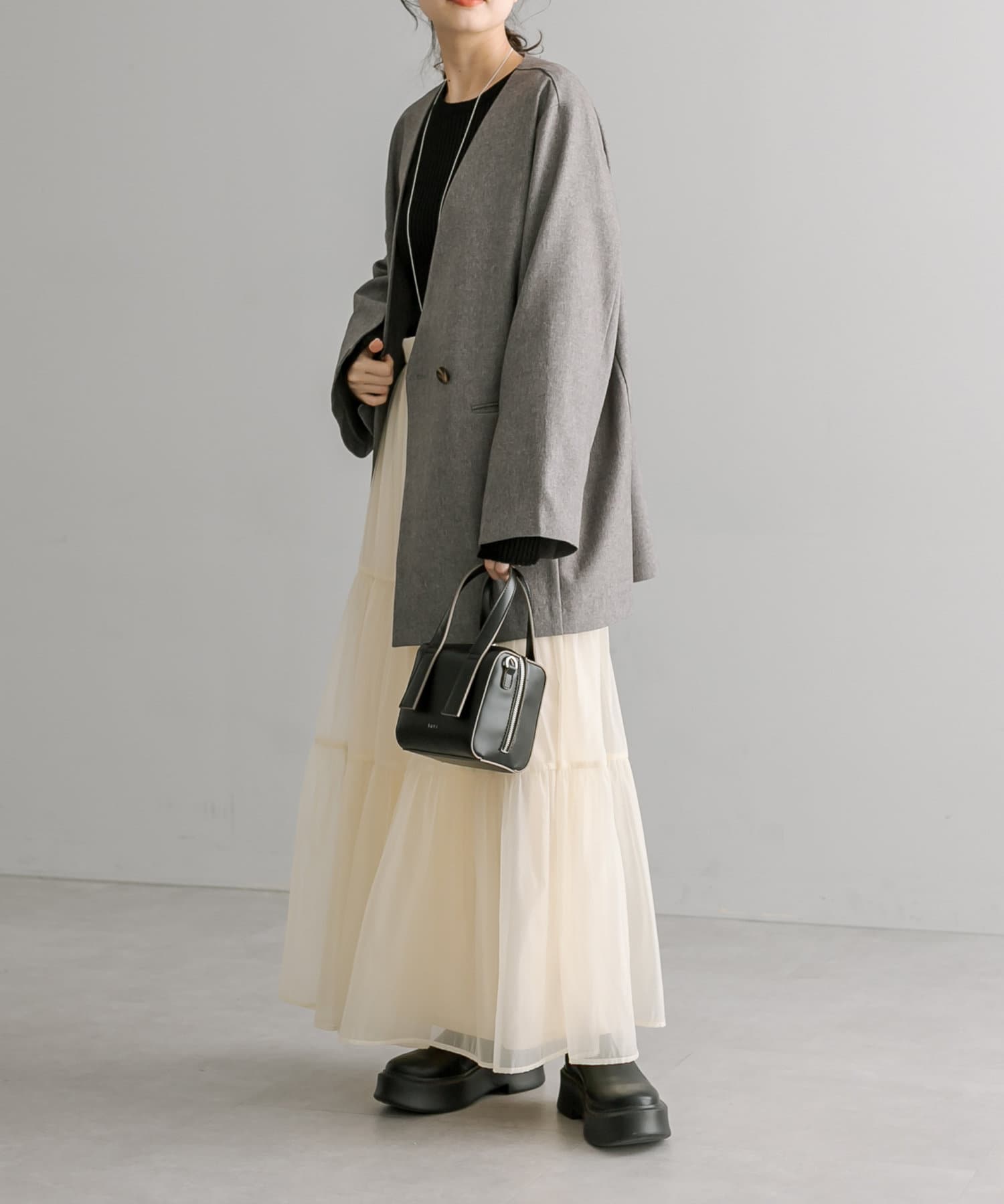 ・春らしいシアー素材で女性らしく決まるティアードスカート。