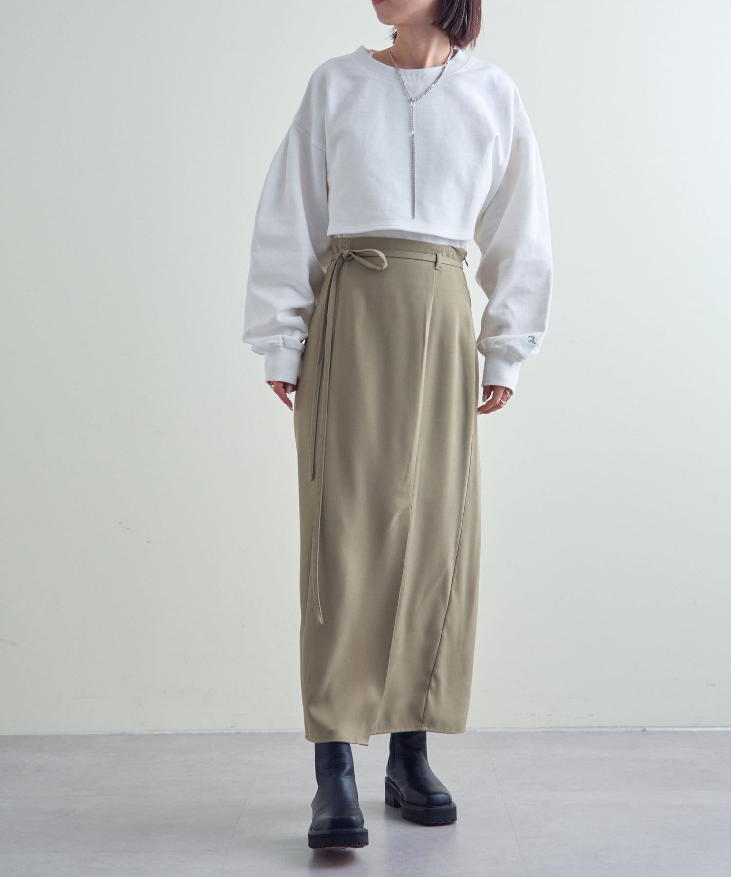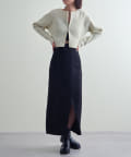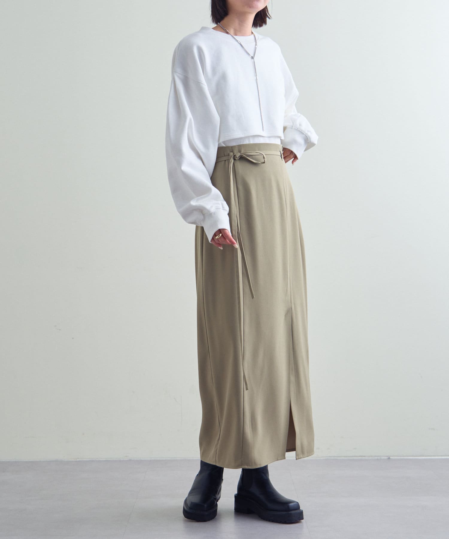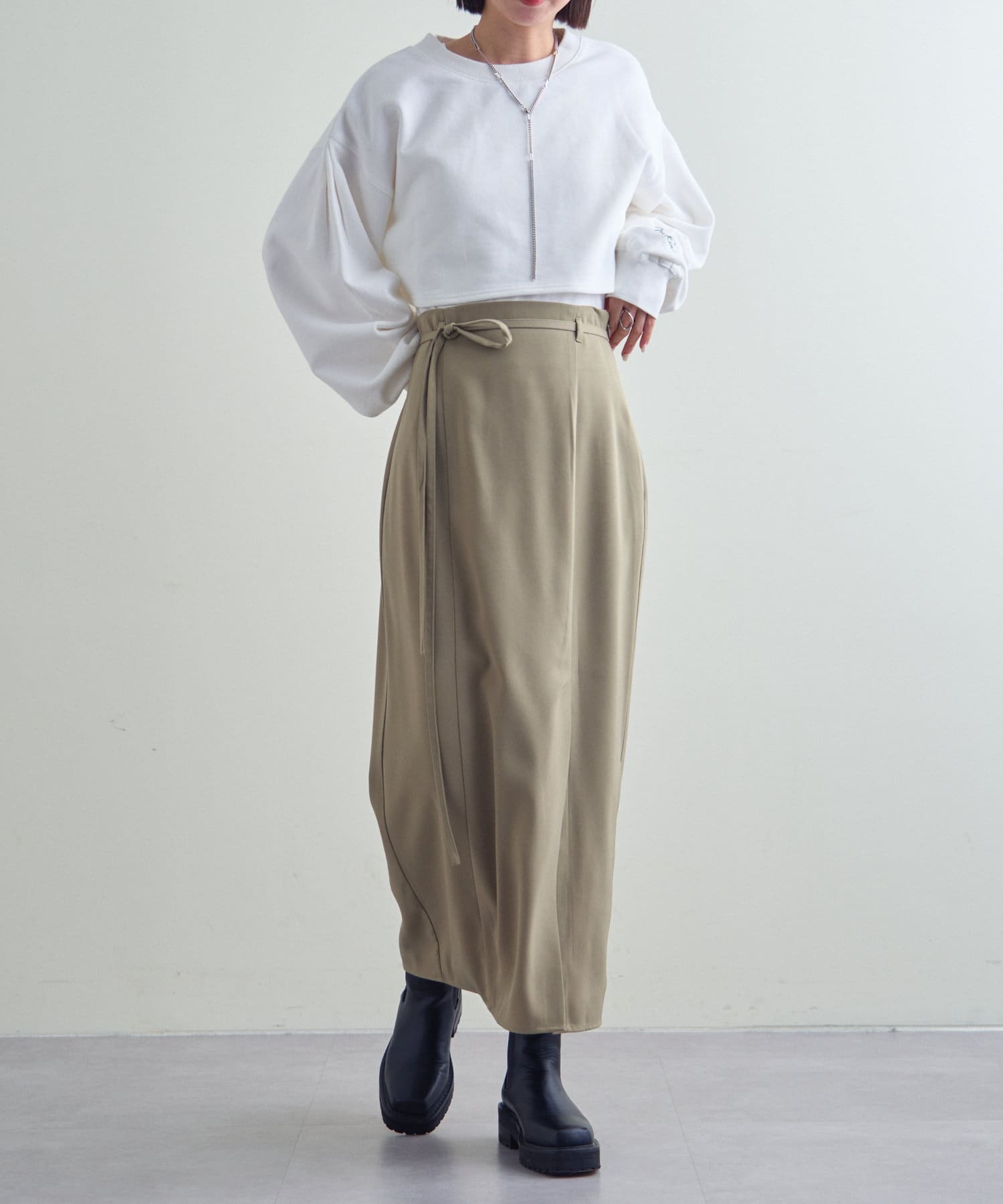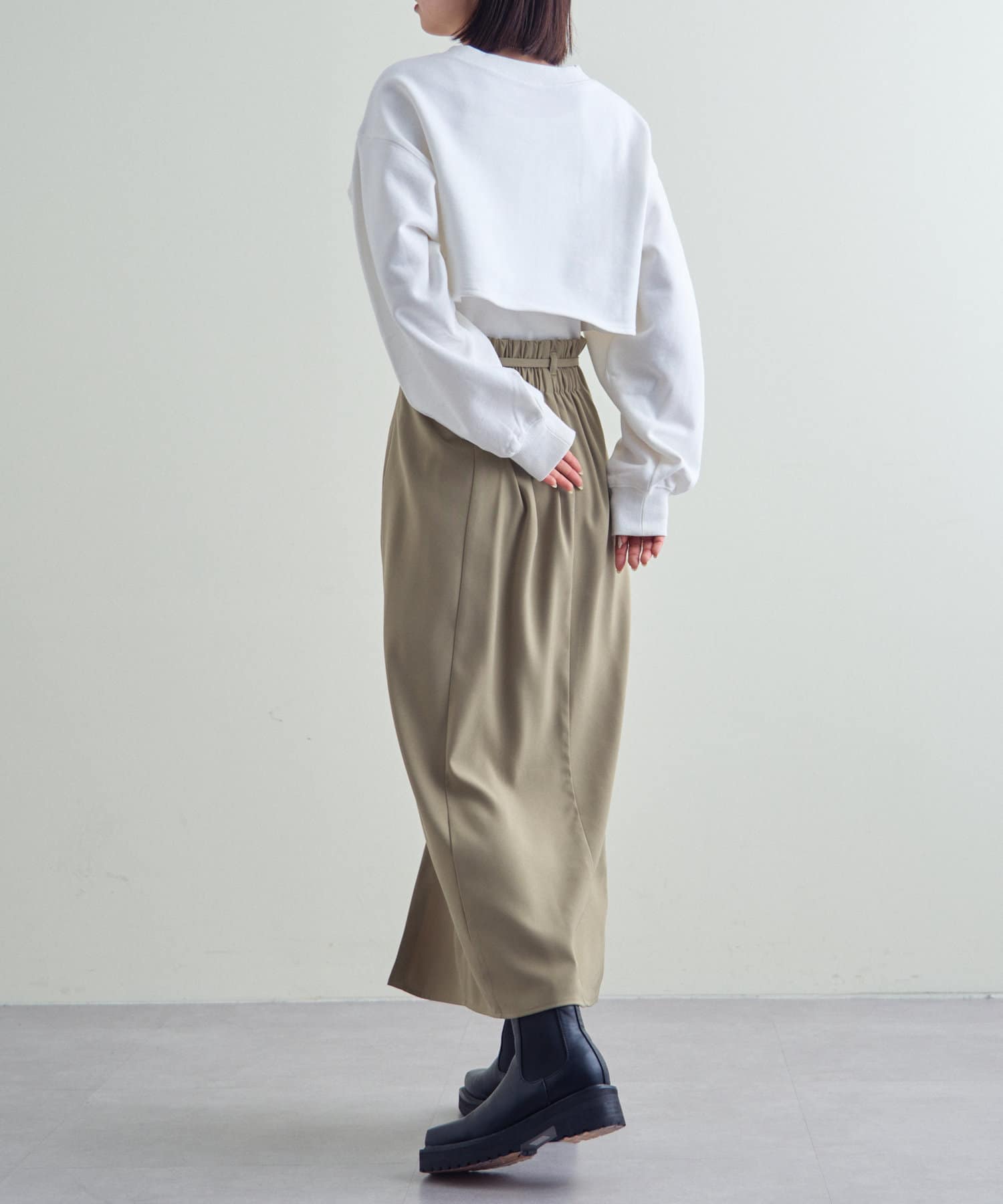 ・綺麗見えする素材感なのでショートニットやシアーのアイテムと合わせるとバランスよく着て頂けます。