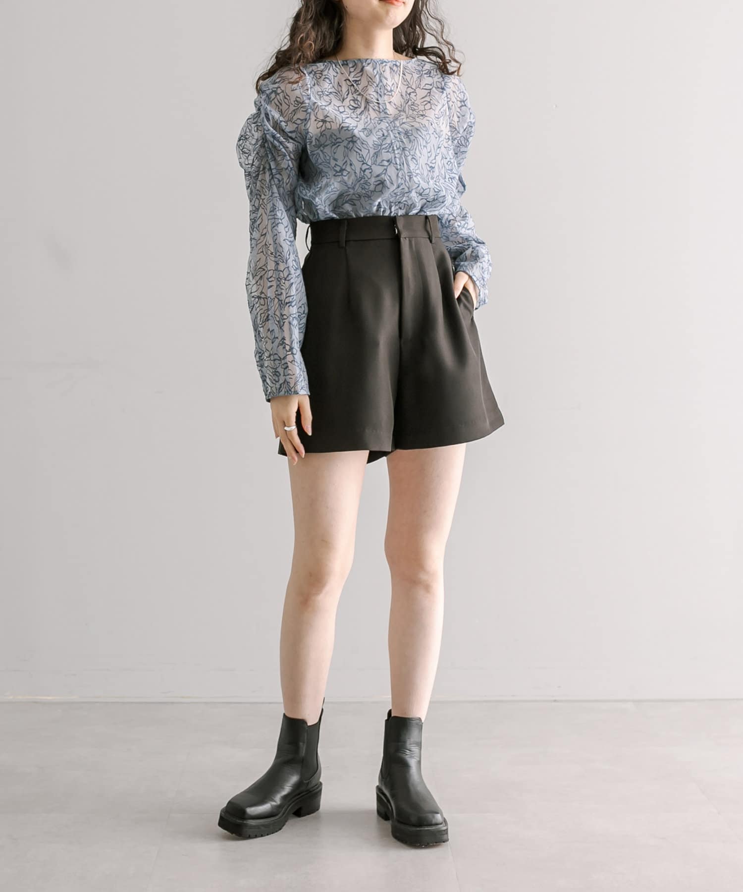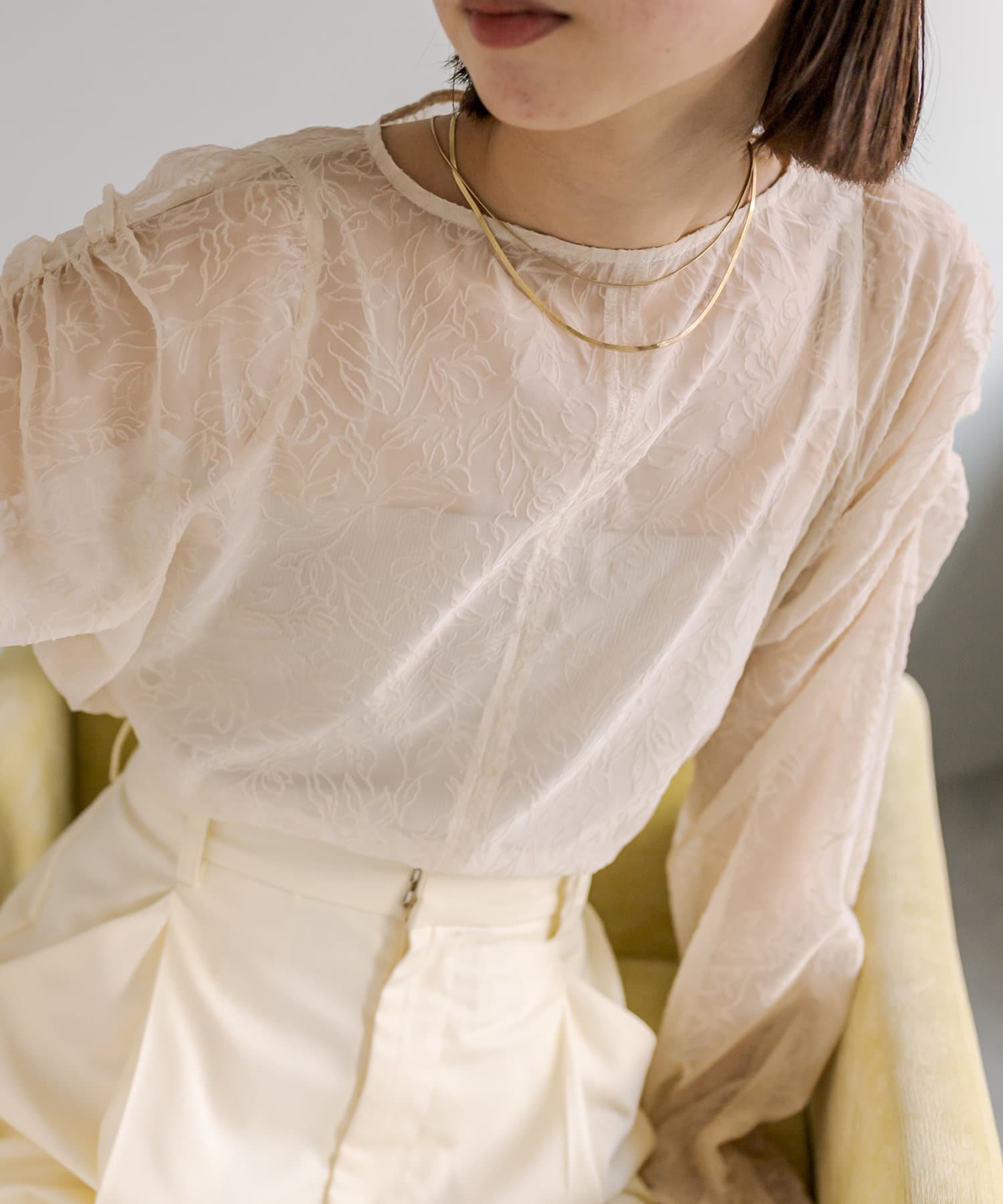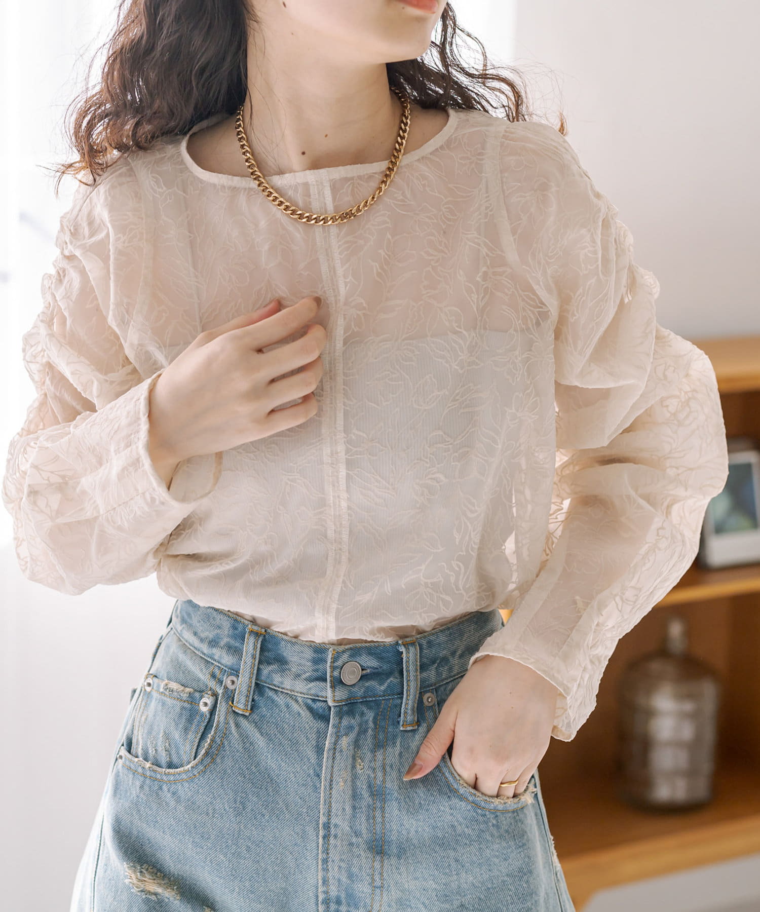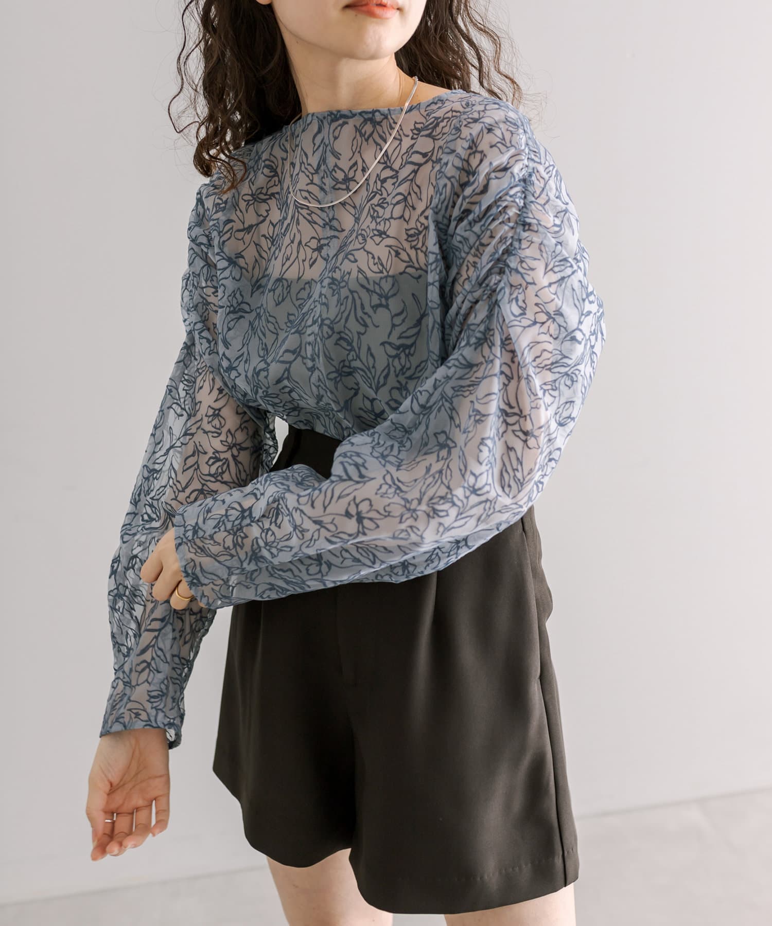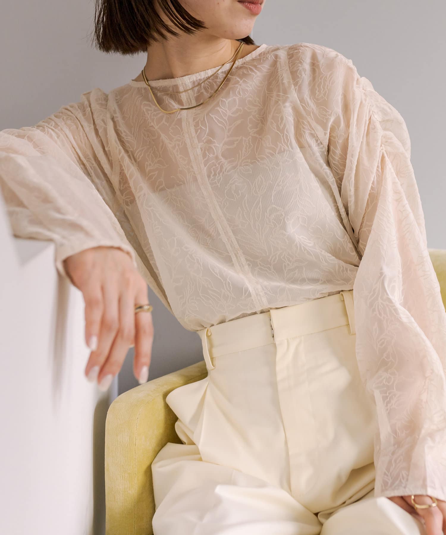 無地・柄の4色展開!パワショルデザインが目を惹くシアーブラウス。