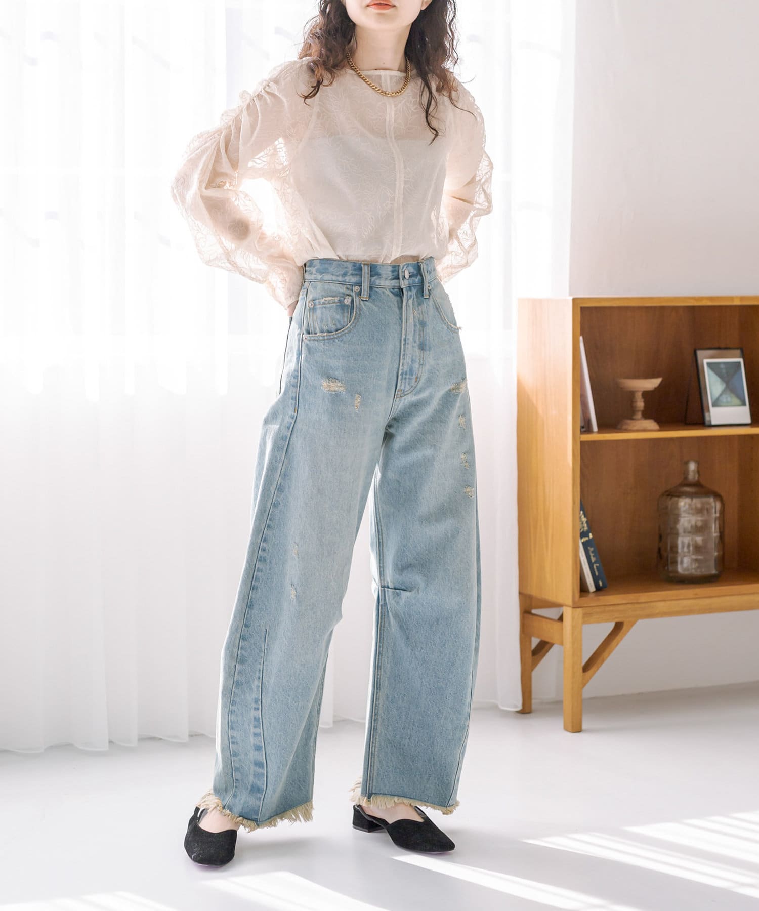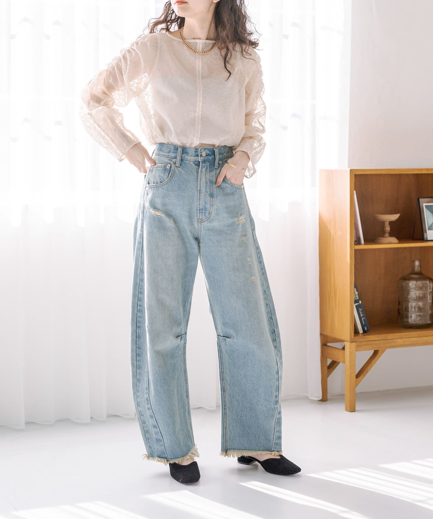 購入場所:パルクローゼット春らしくデニムとの相性がめっちゃ可愛かったです!腕のくしゅくしゅが私の二の腕のお肉を
