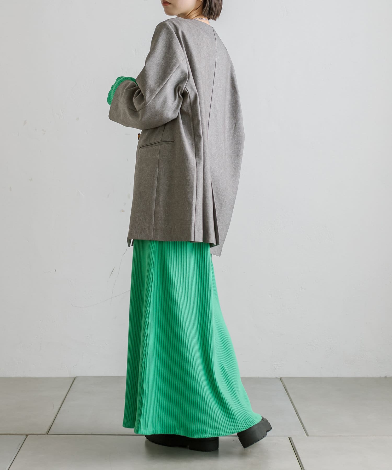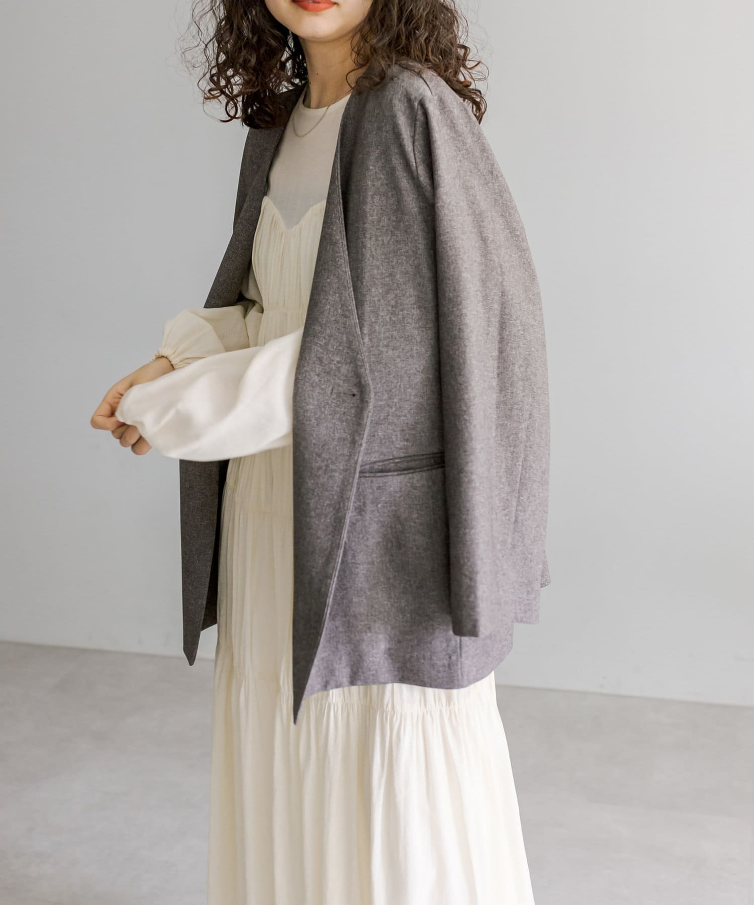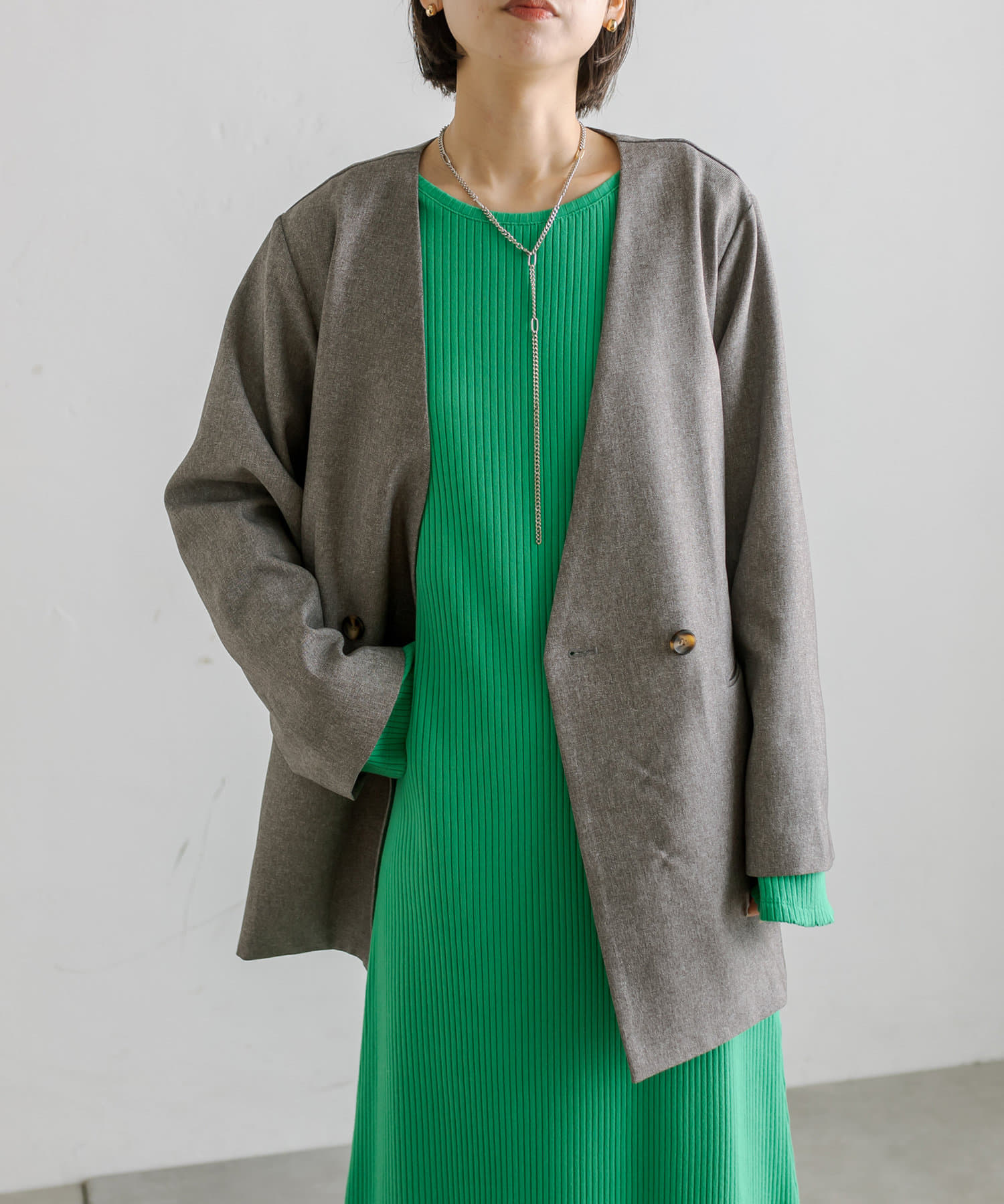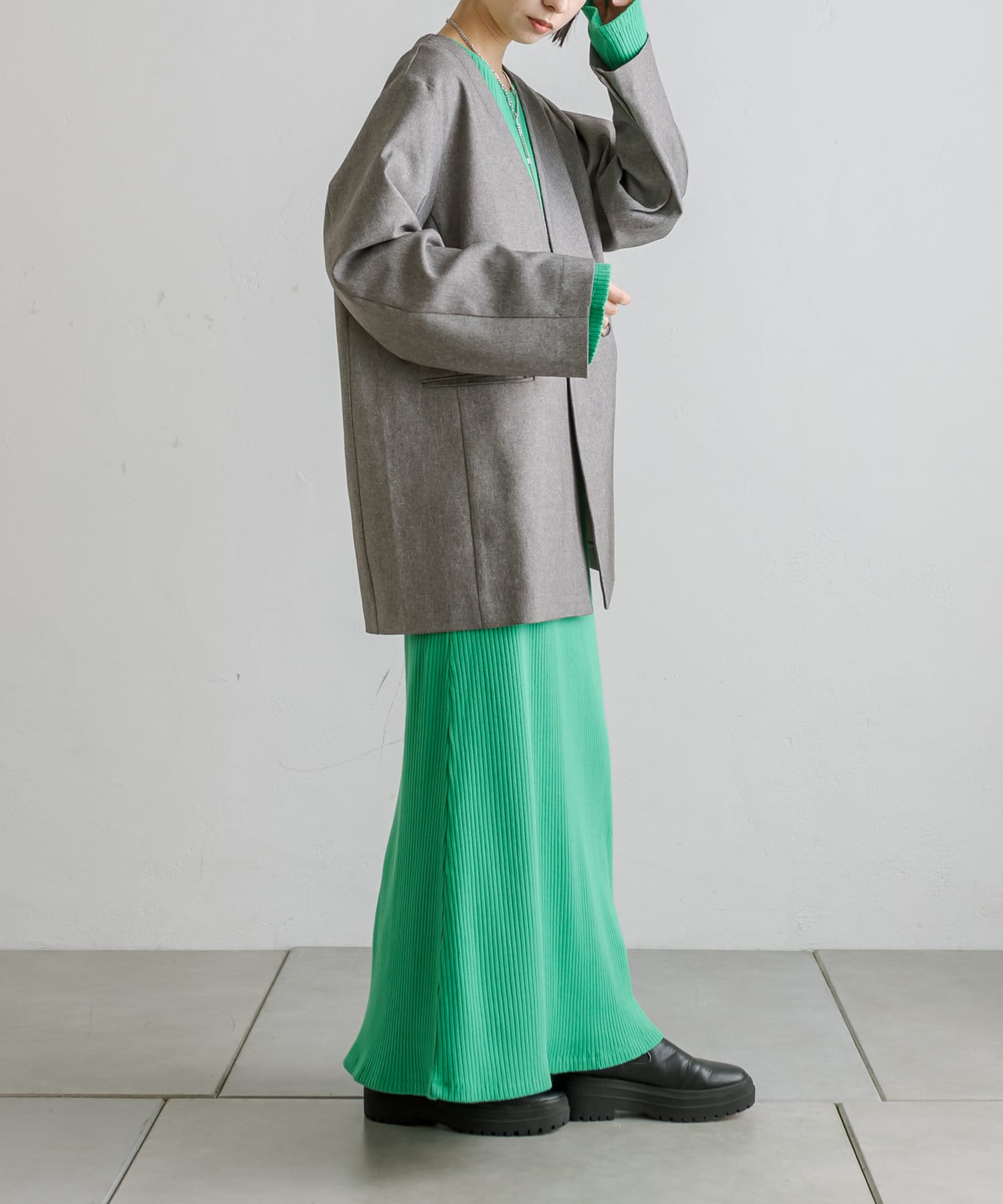 普段ジャケット着るとスーツみたいになったり着られてる感出るから似合わなかったけど、これはノーカラーだからそんなことなくてきやすい!