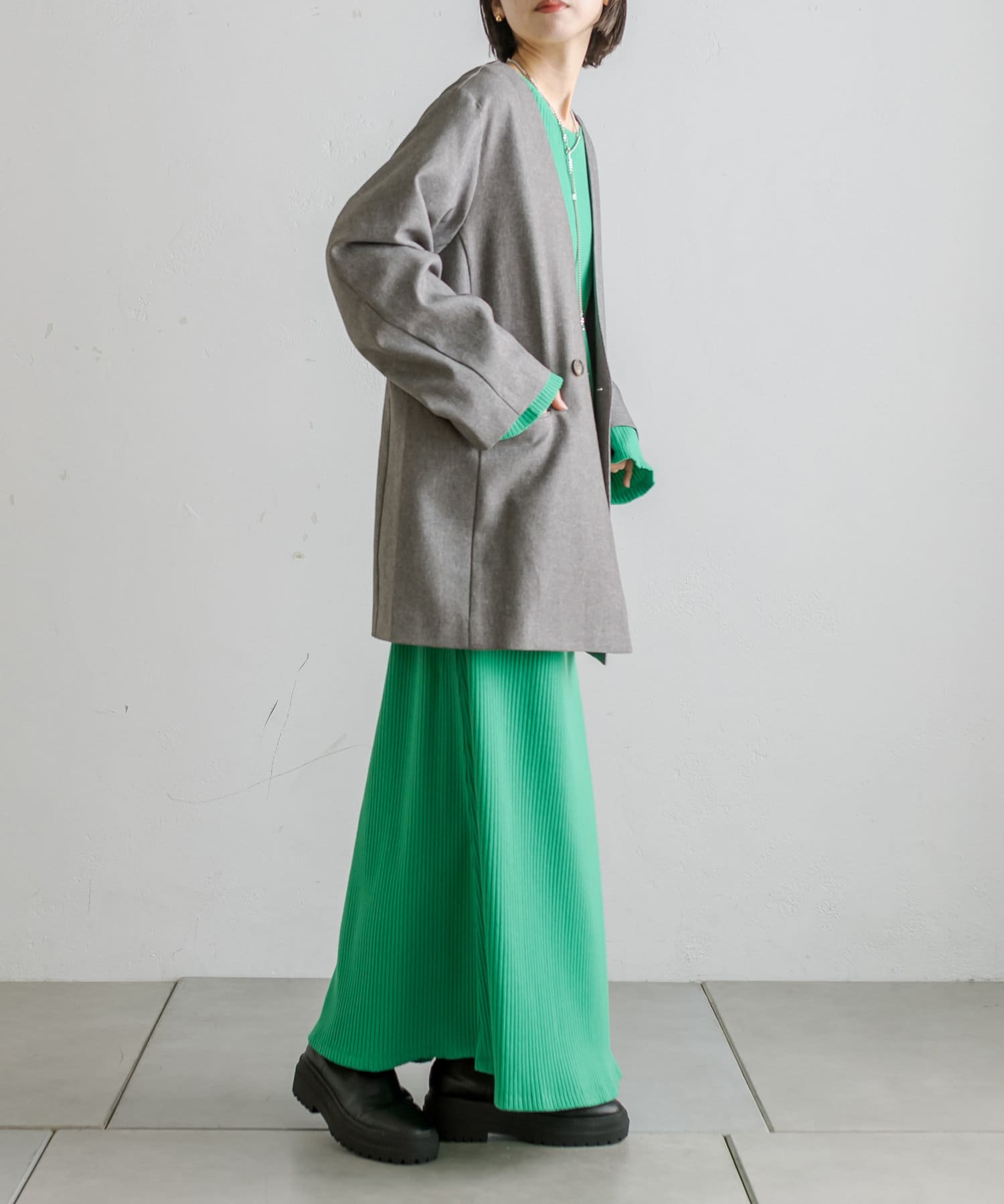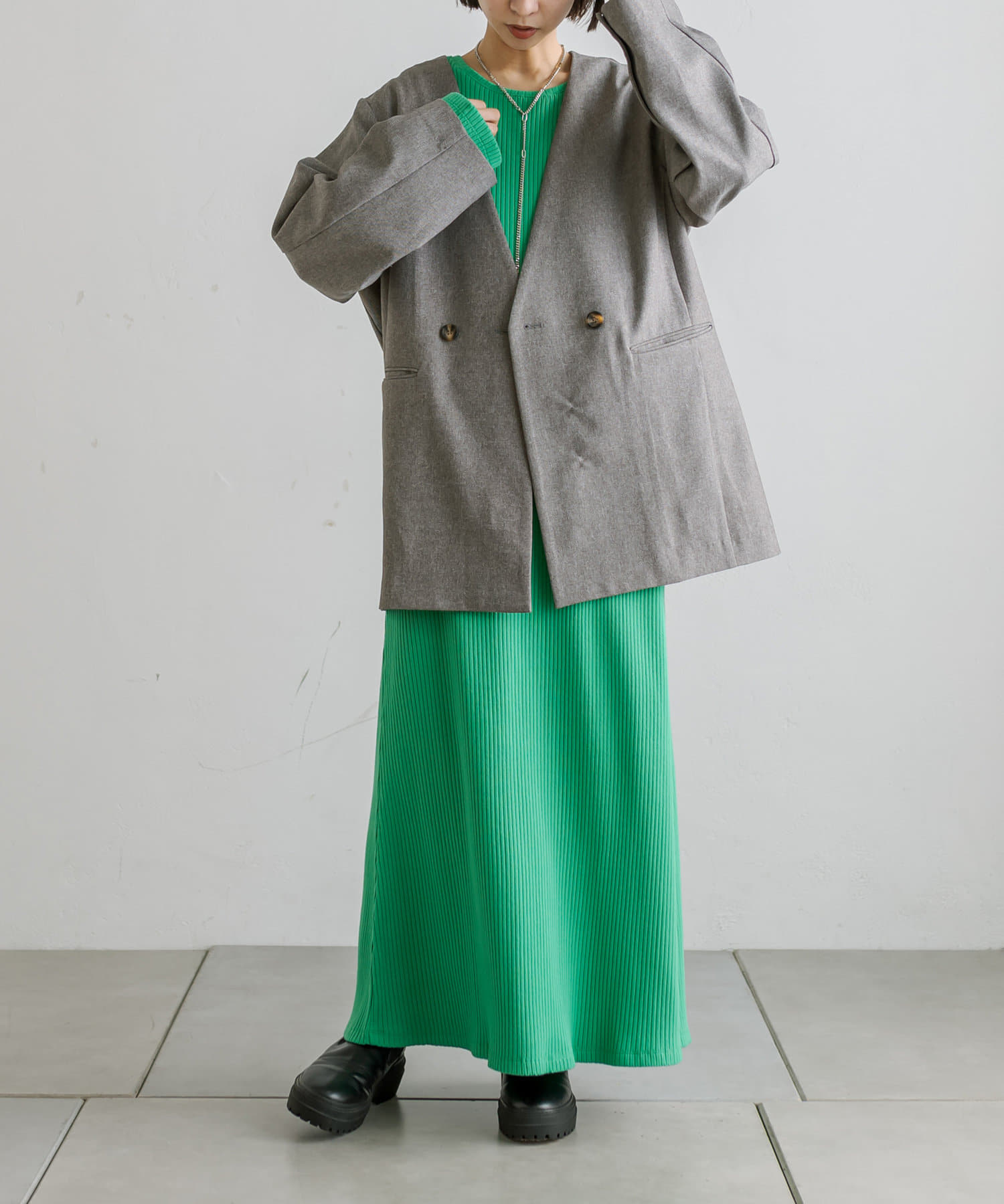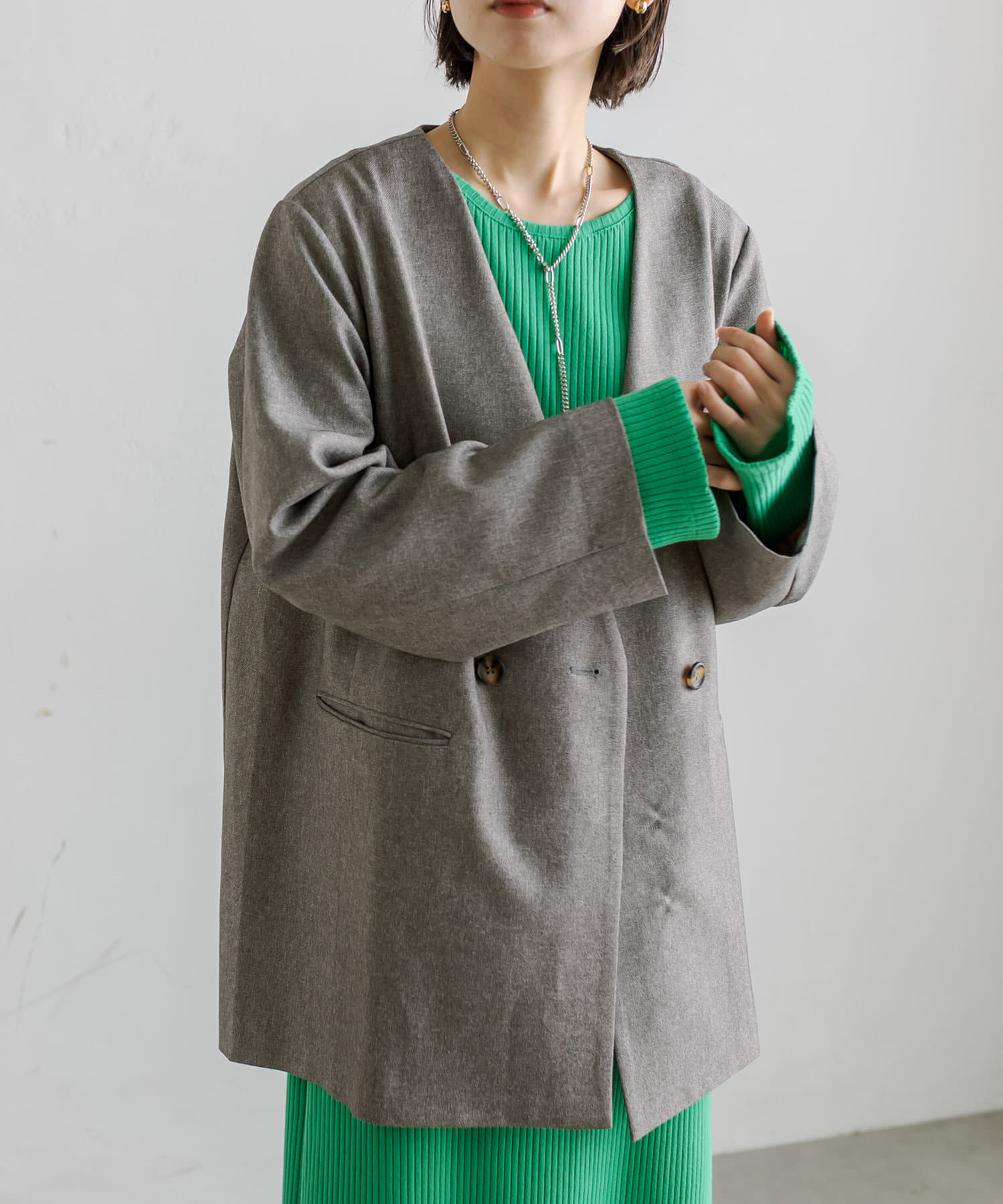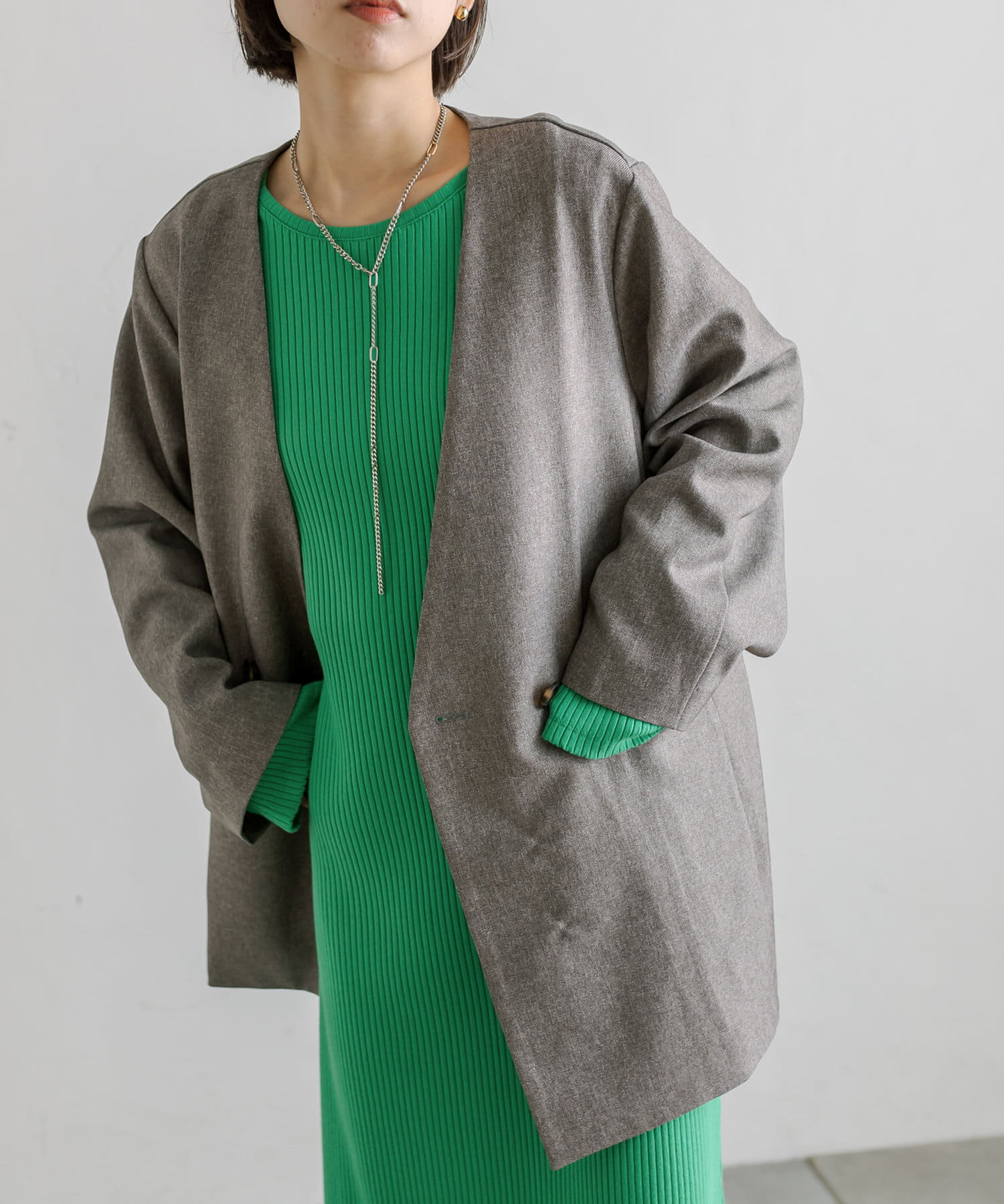 普段ジャケット着るとスーツみたいになったり着られてる感出るから似合わなかったけど、これはノーカラーだからそんなことなくてきやすい!