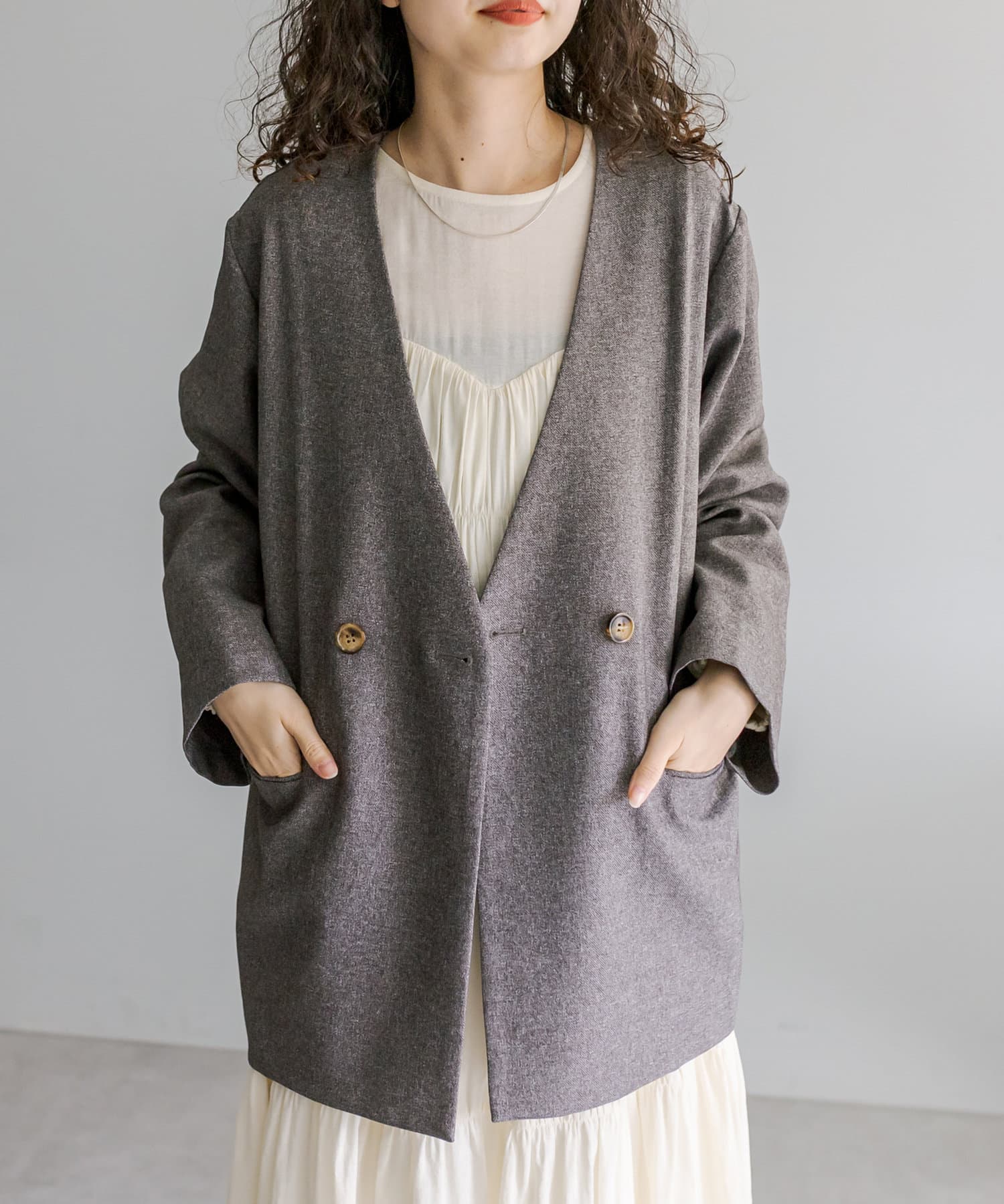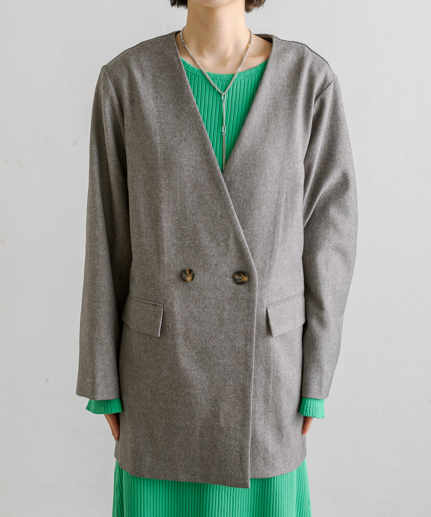 ・定番で使いやすいノーカラーデザインのジャケット。