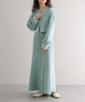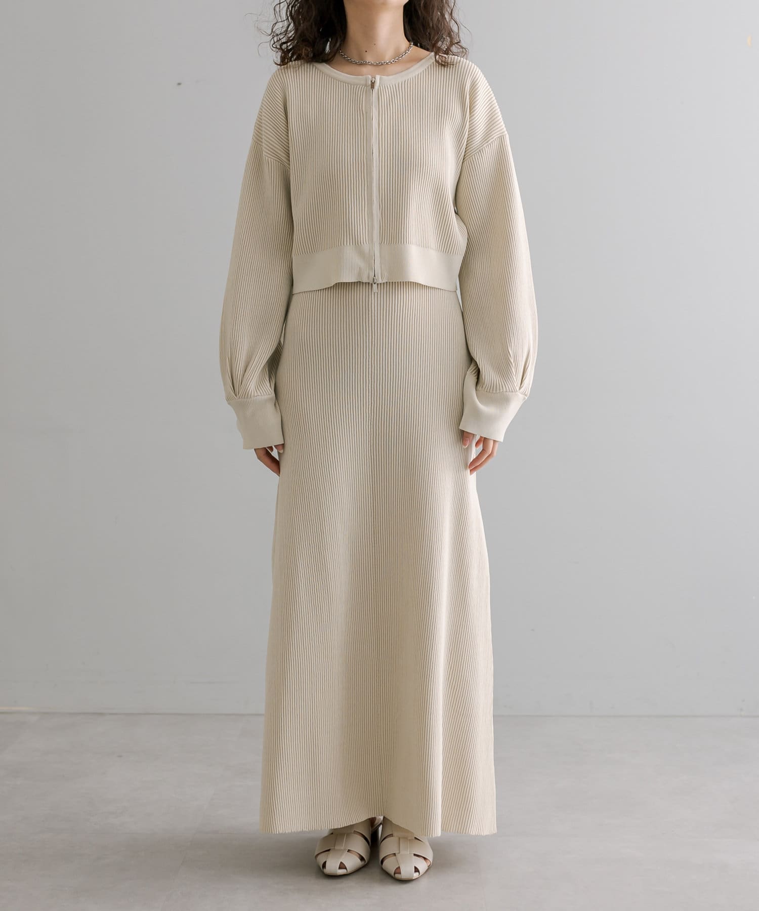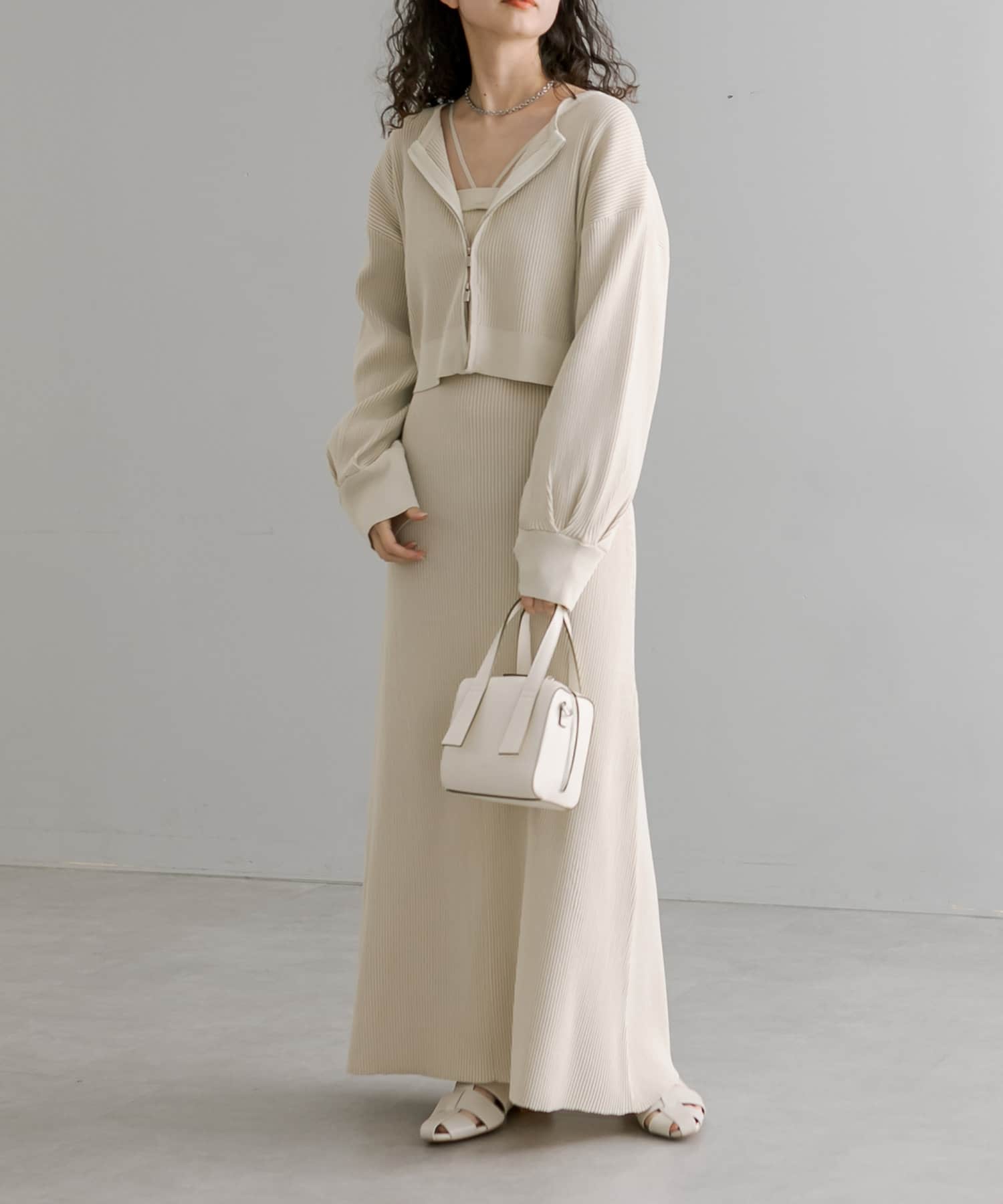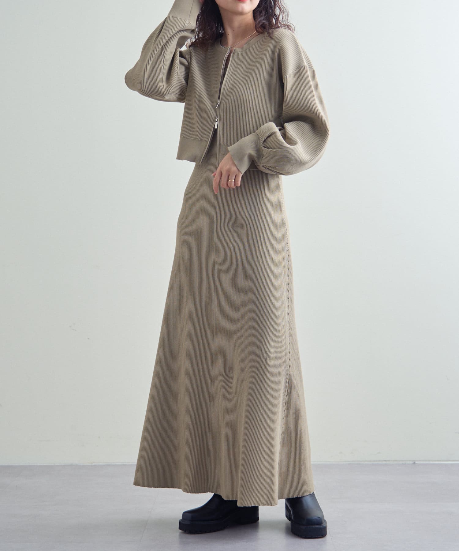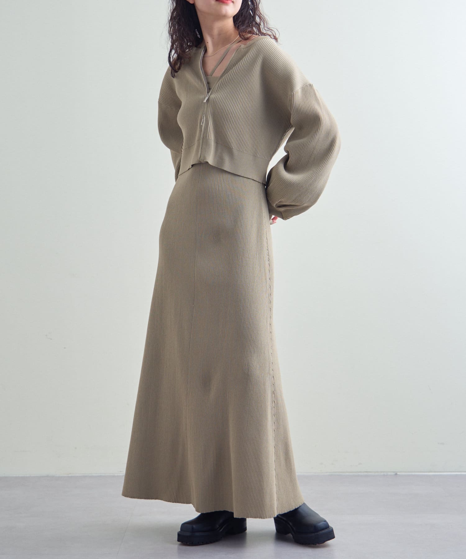 ・細身のリブデザインのロングワンピースとショートトップスがセットになったワンピース。