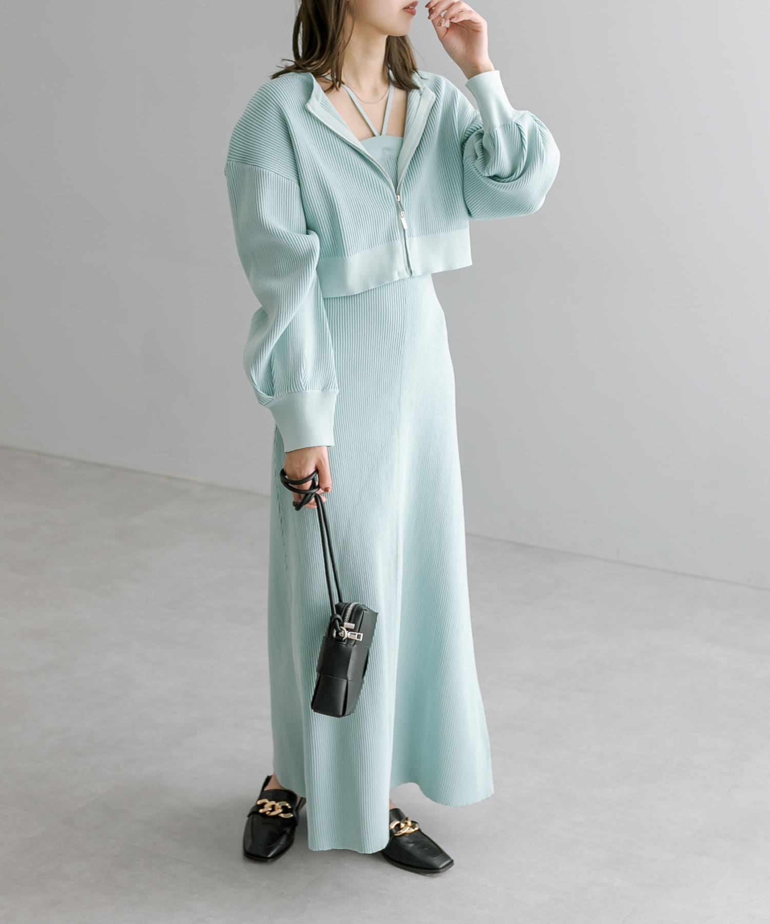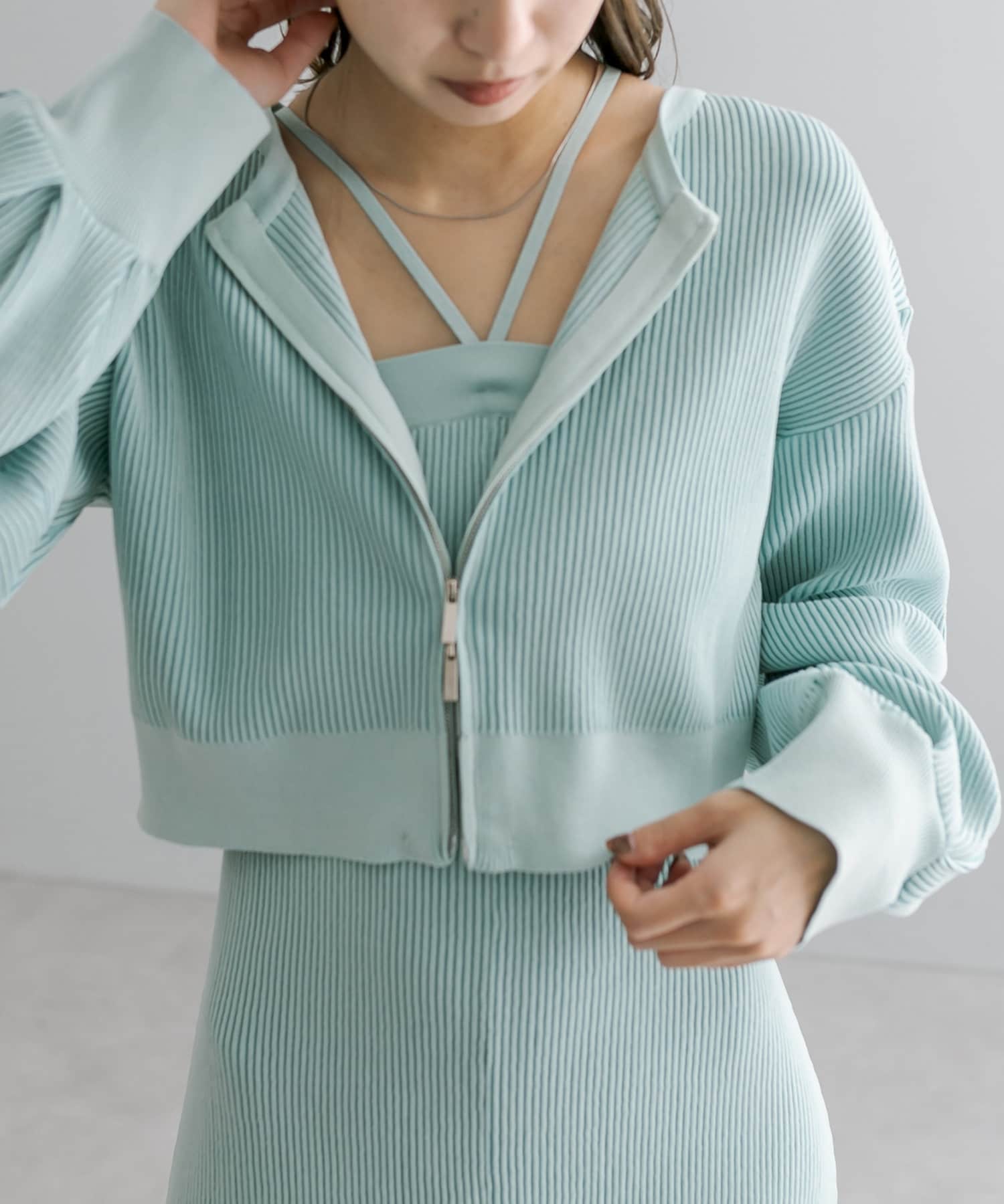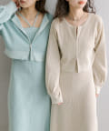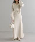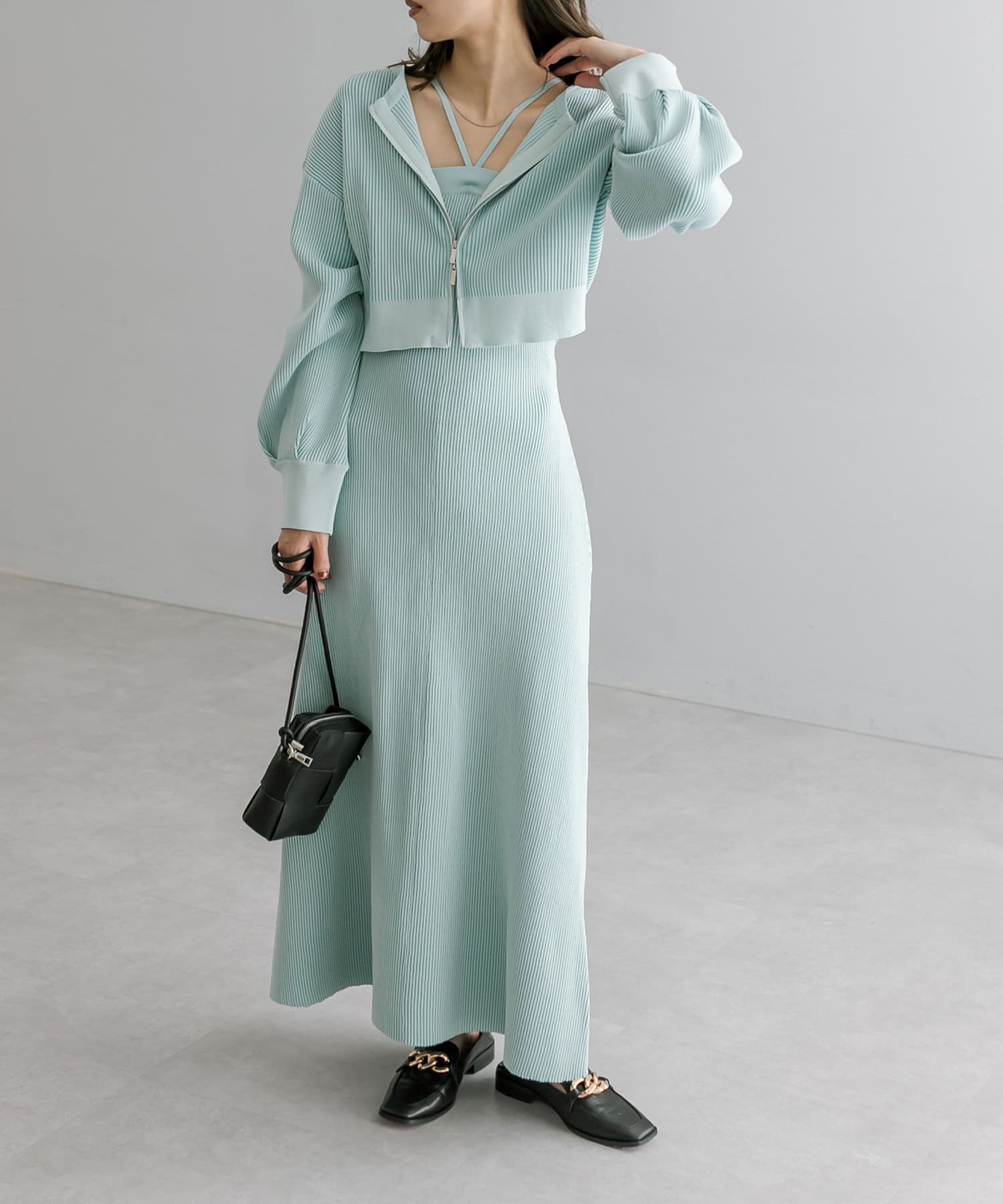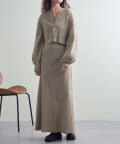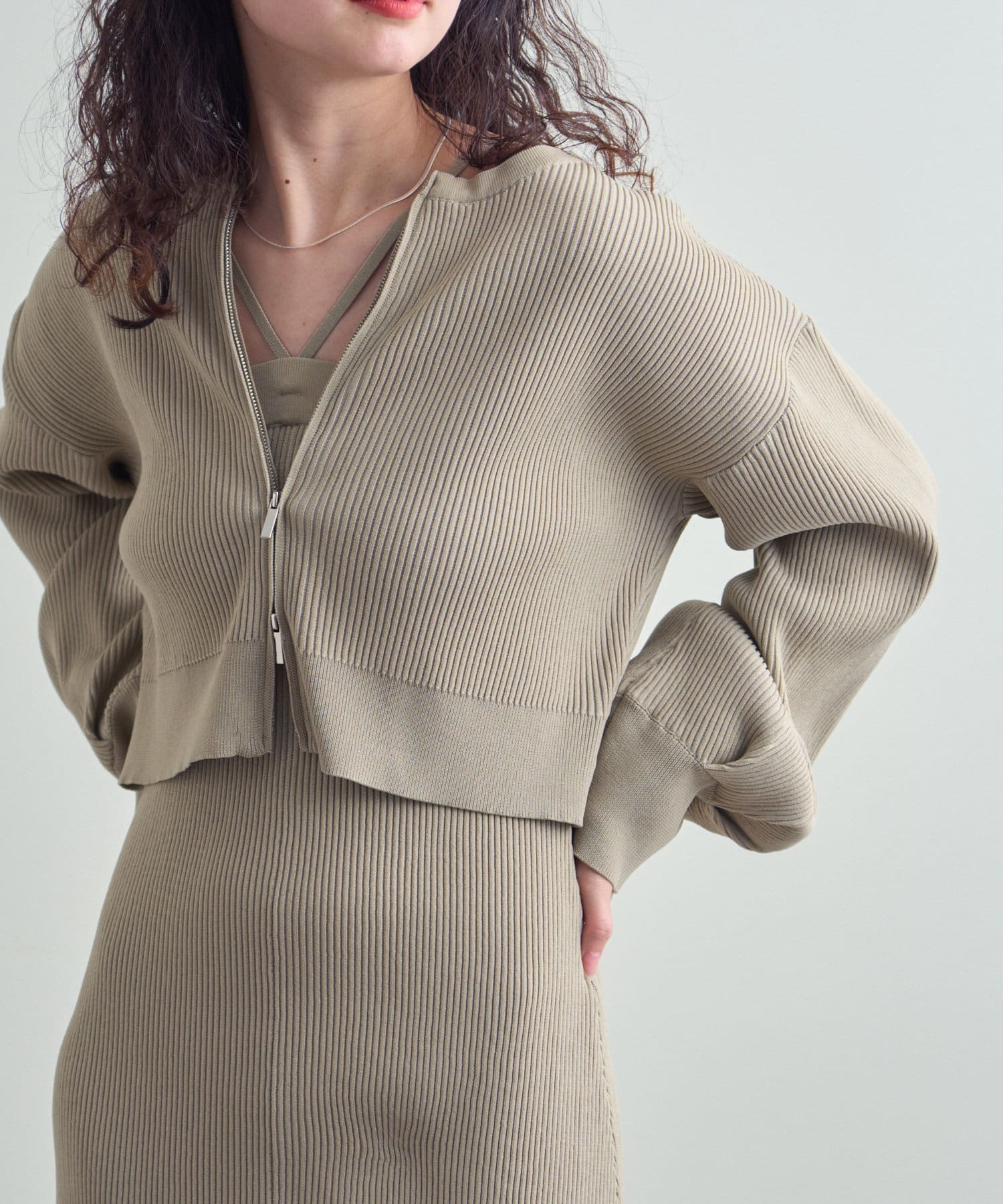・細身のリブデザインのロングワンピースとショートトップスがセットになったワンピース。