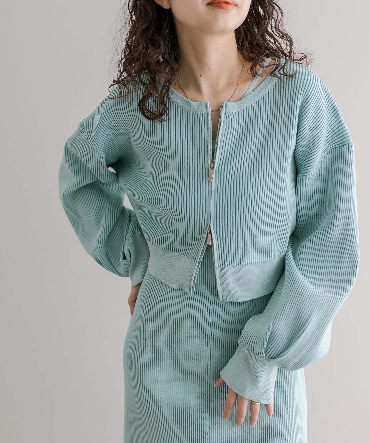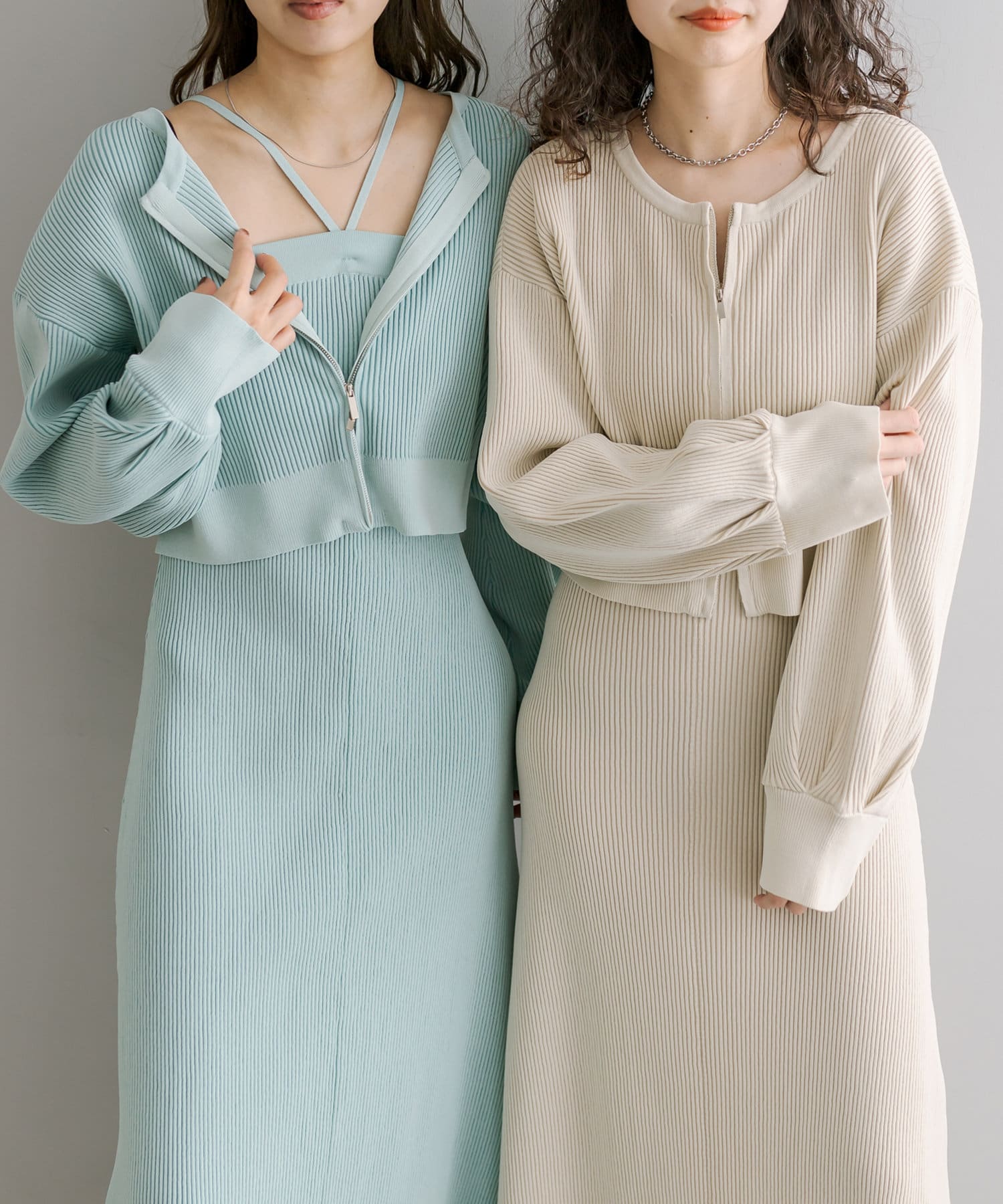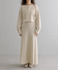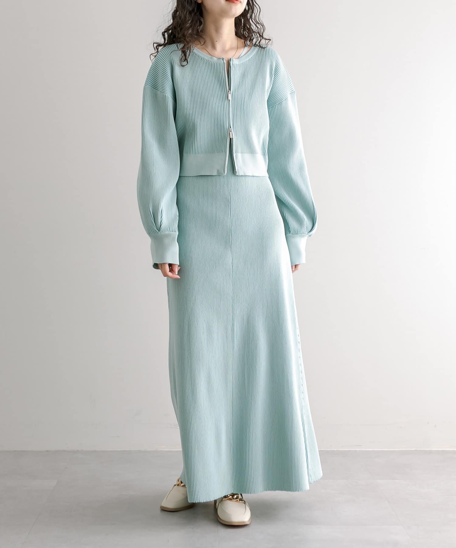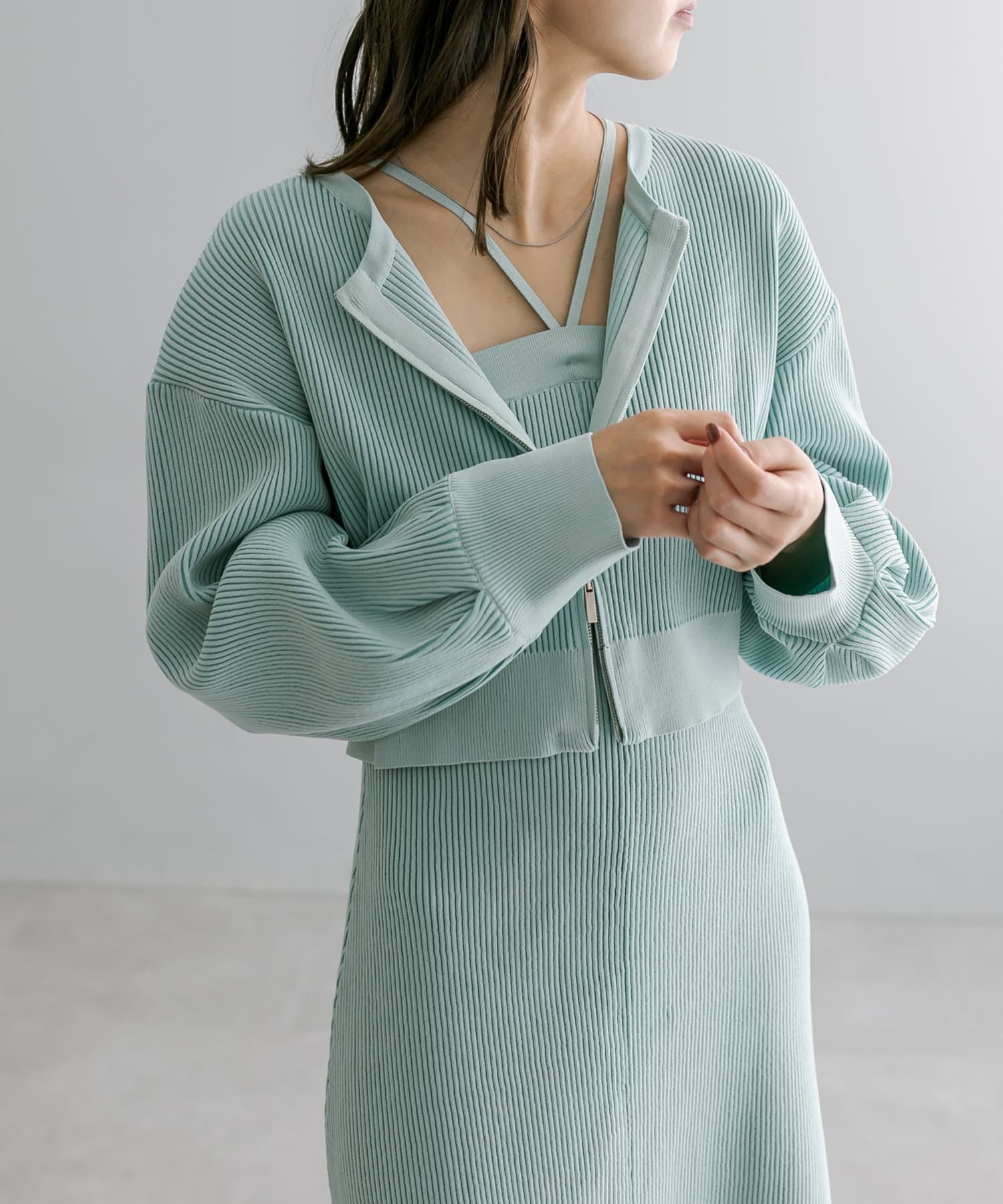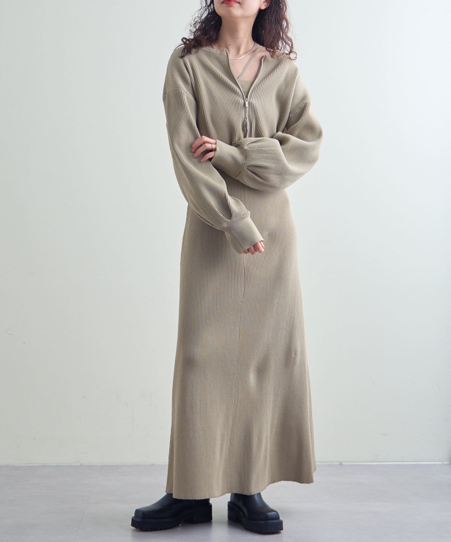 ・細身のリブデザインのロングワンピースとショートトップスがセットになったワンピース。