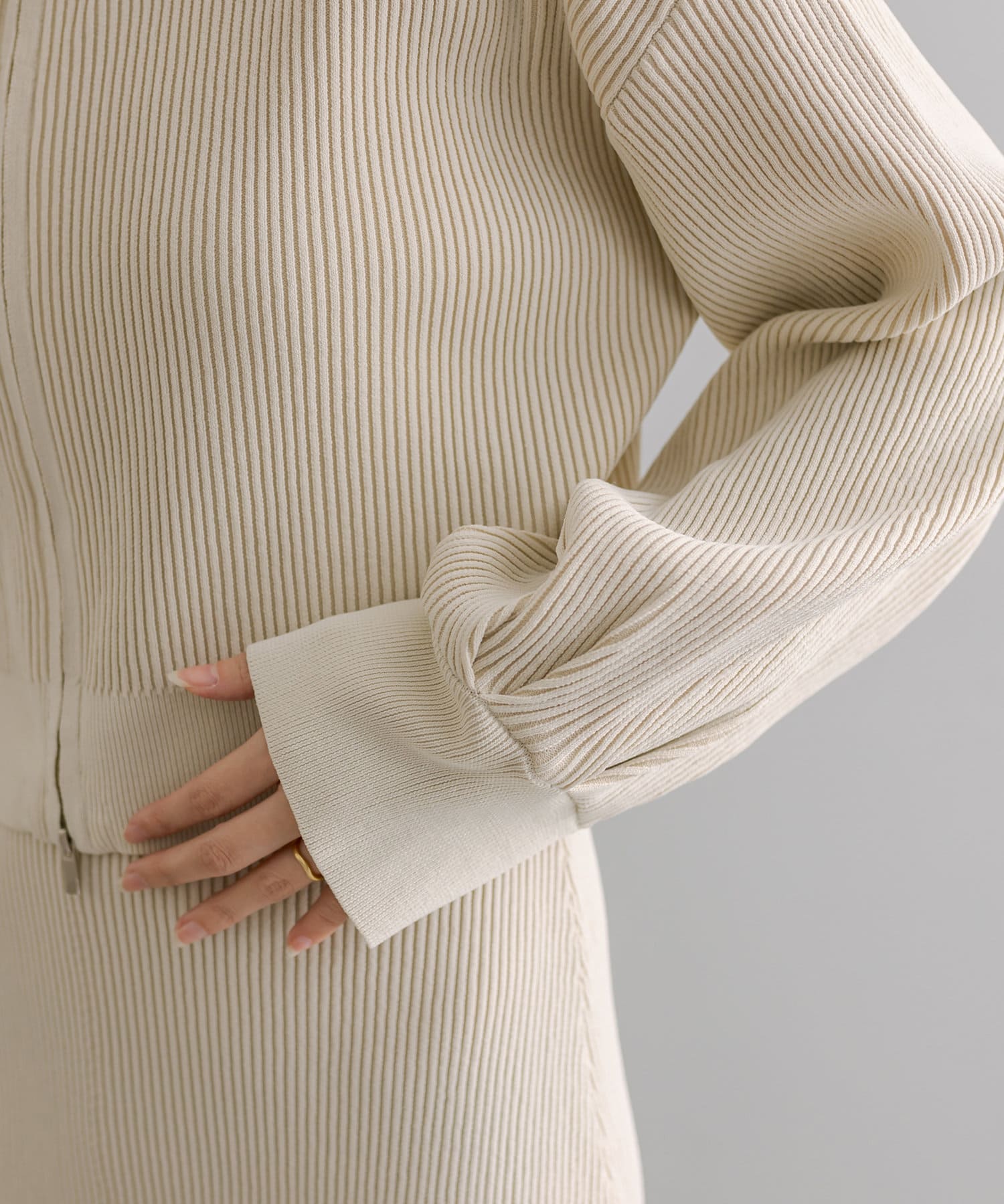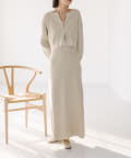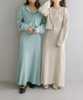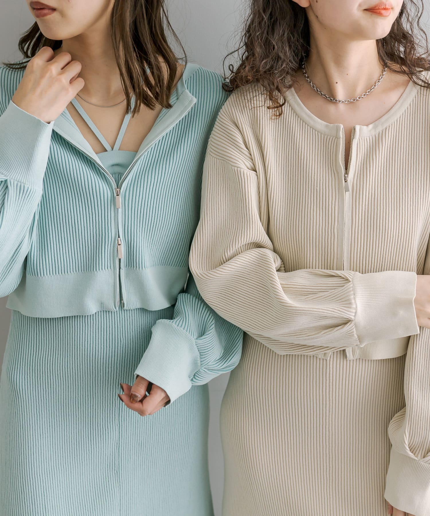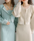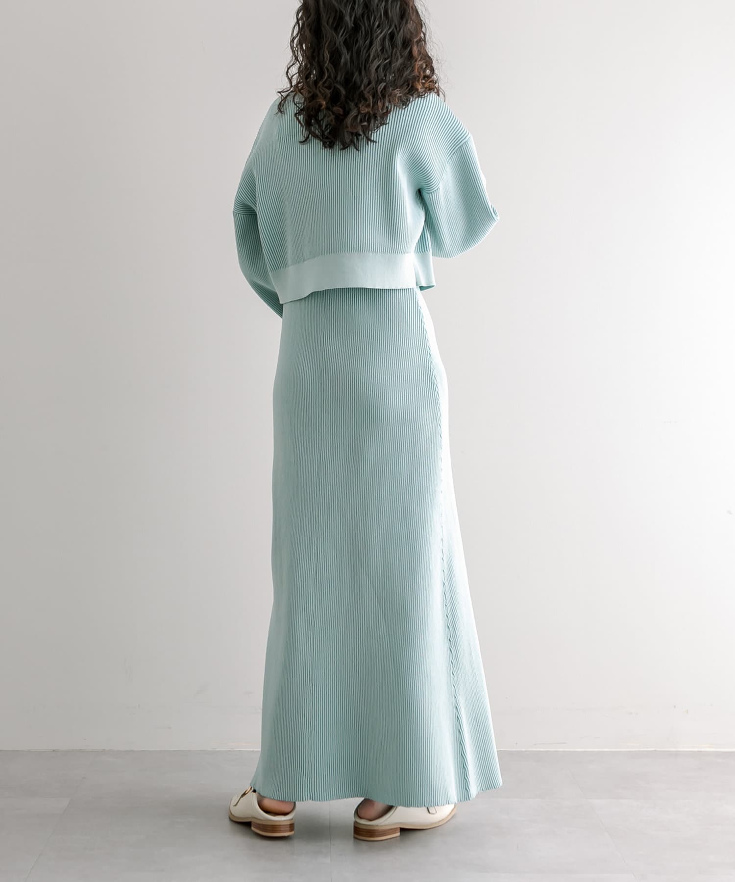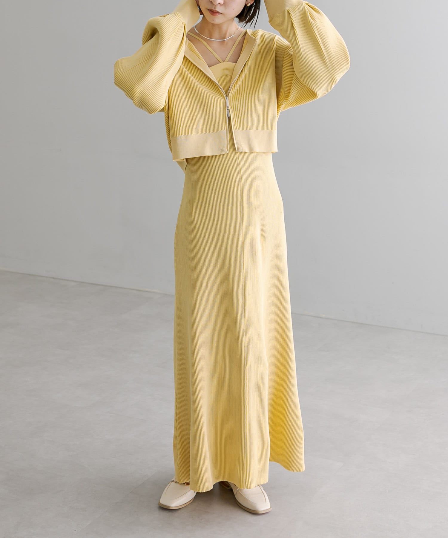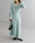 ・細身のリブデザインのロングワンピースとショートトップスがセットになったワンピース。