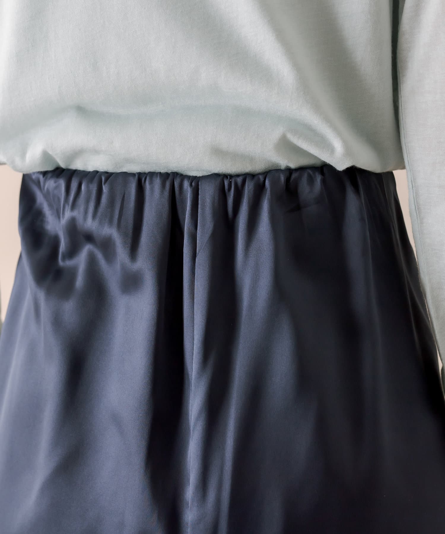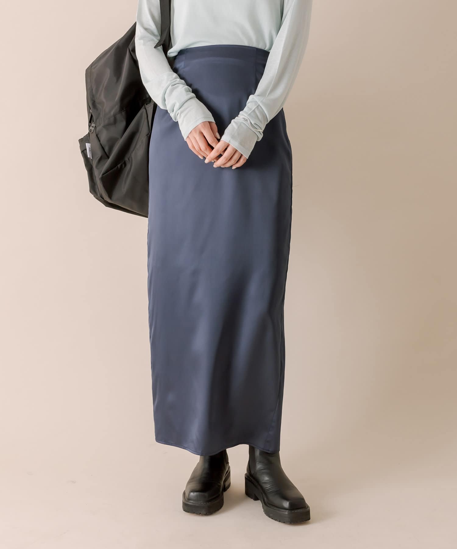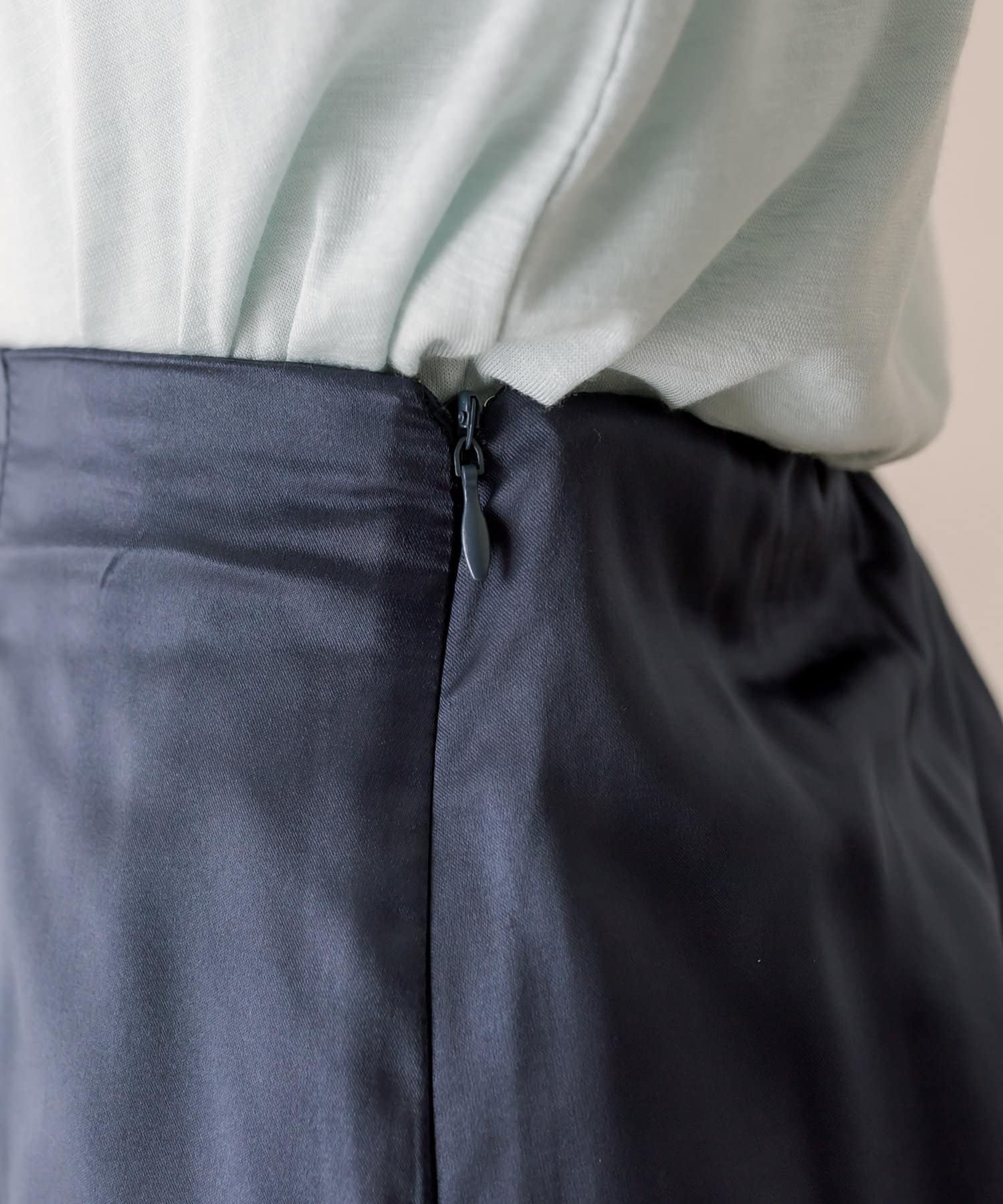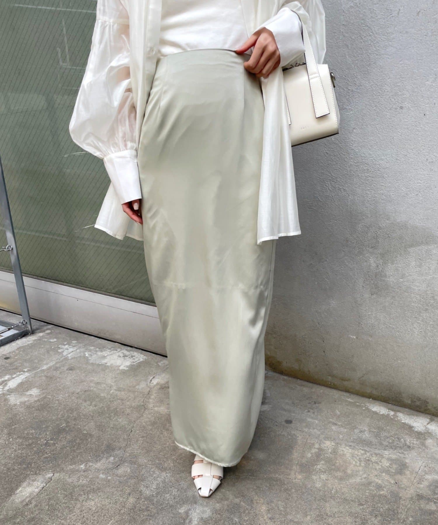 ・光沢のあるサテン素材のスカートはスタイリングに加わるだけで華やかな印象に。