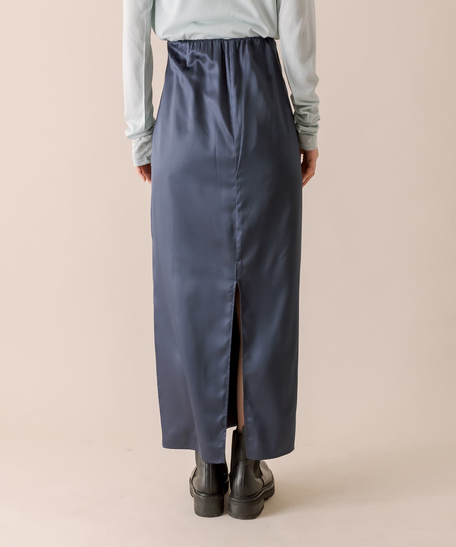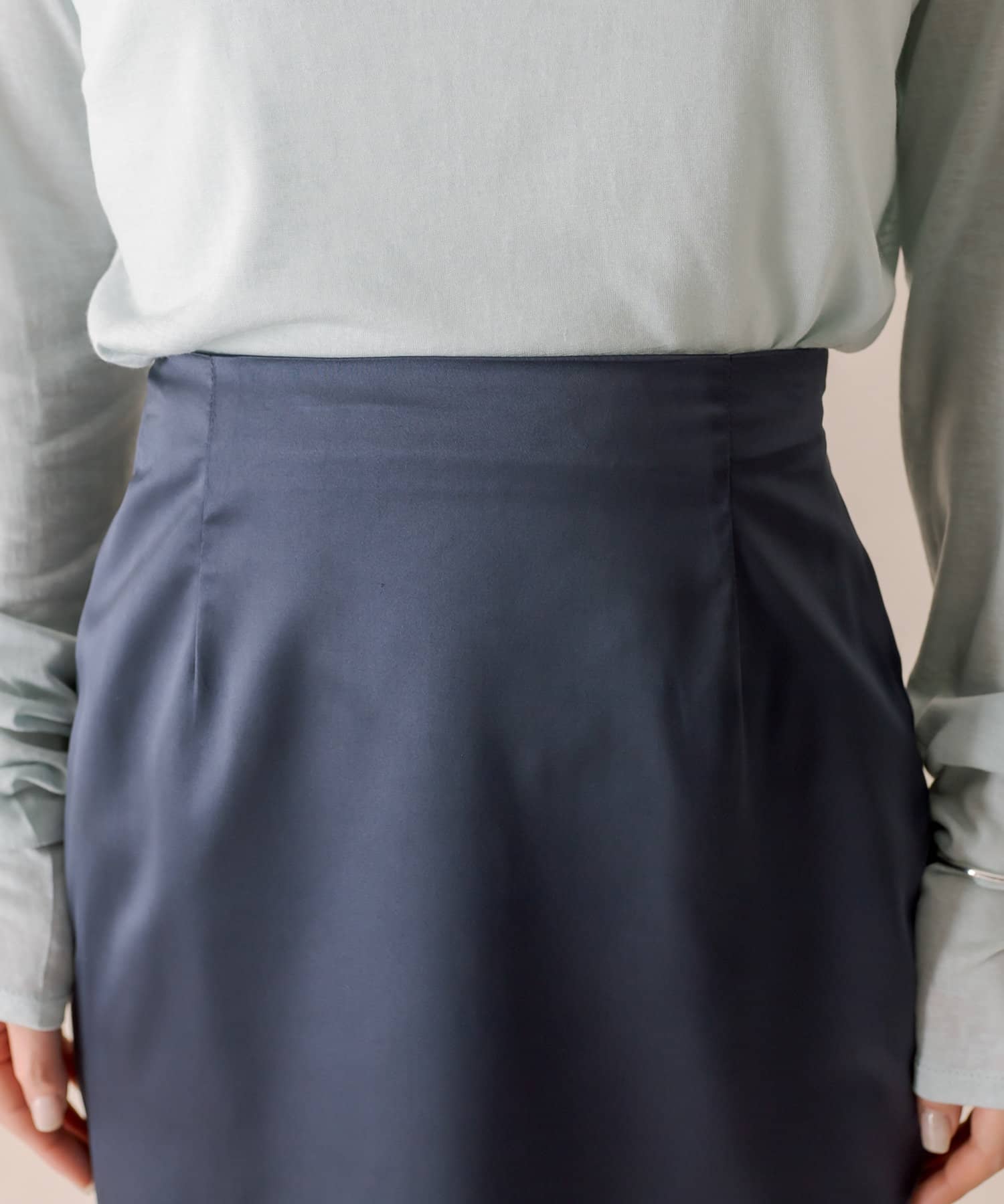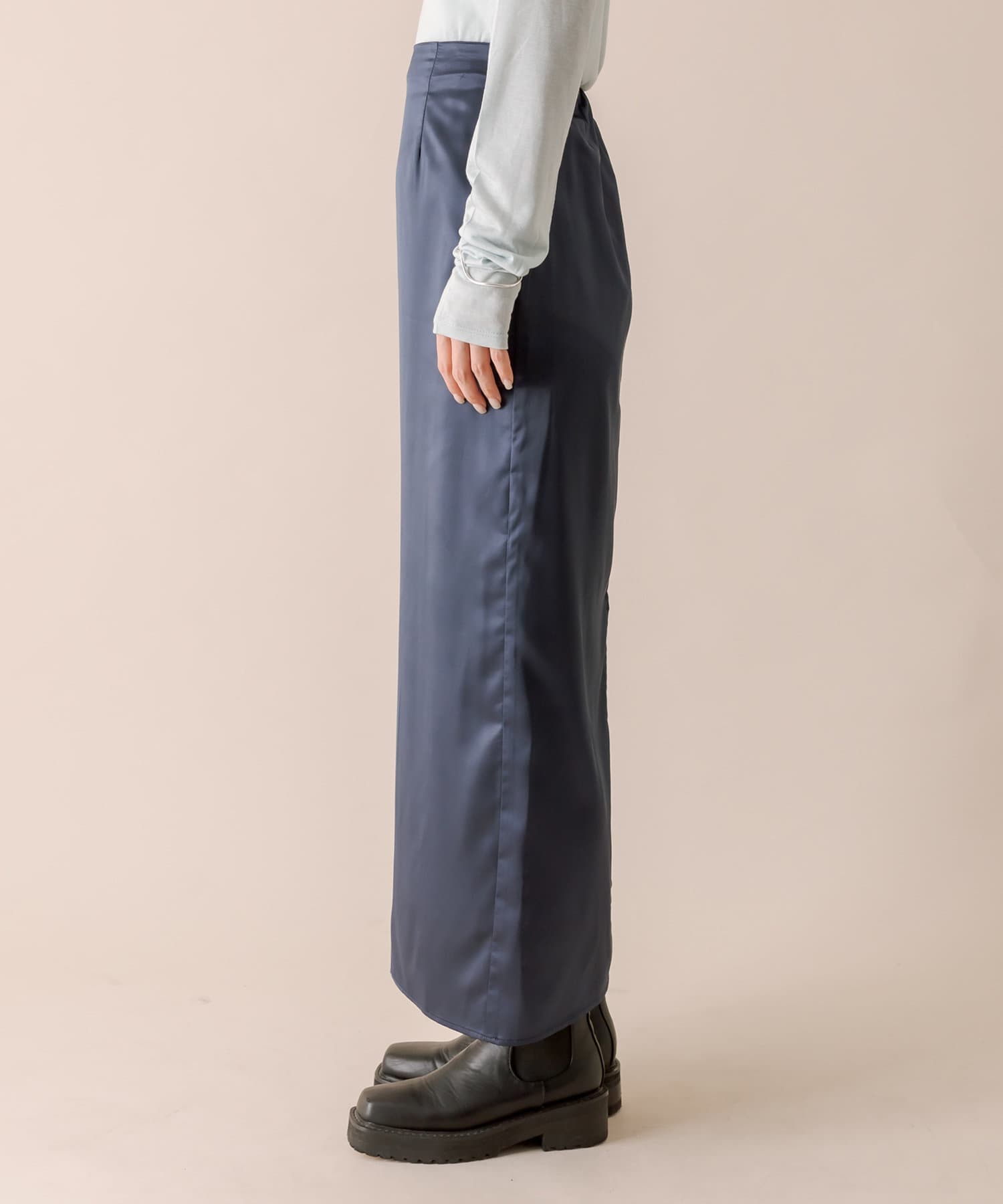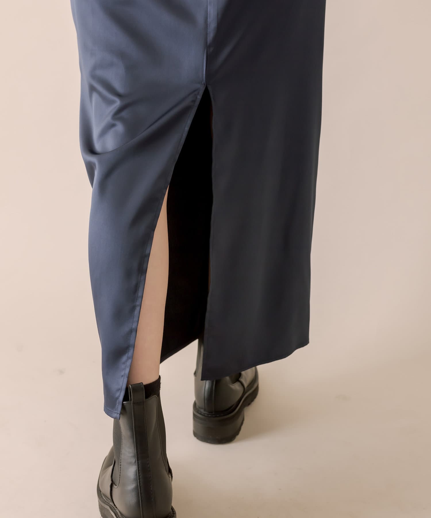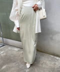 ・光沢のあるサテン素材のスカートはスタイリングに加わるだけで華やかな印象に。