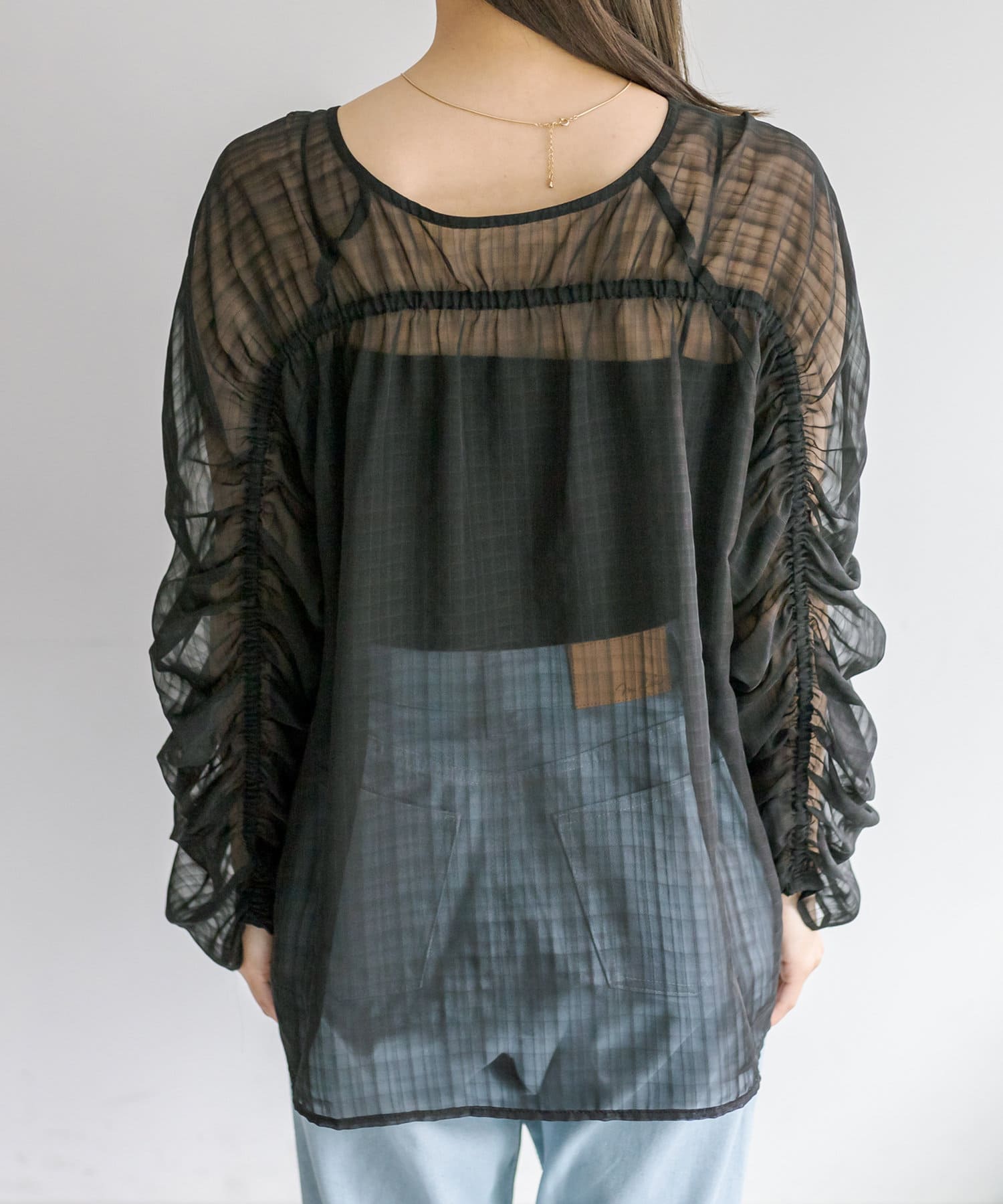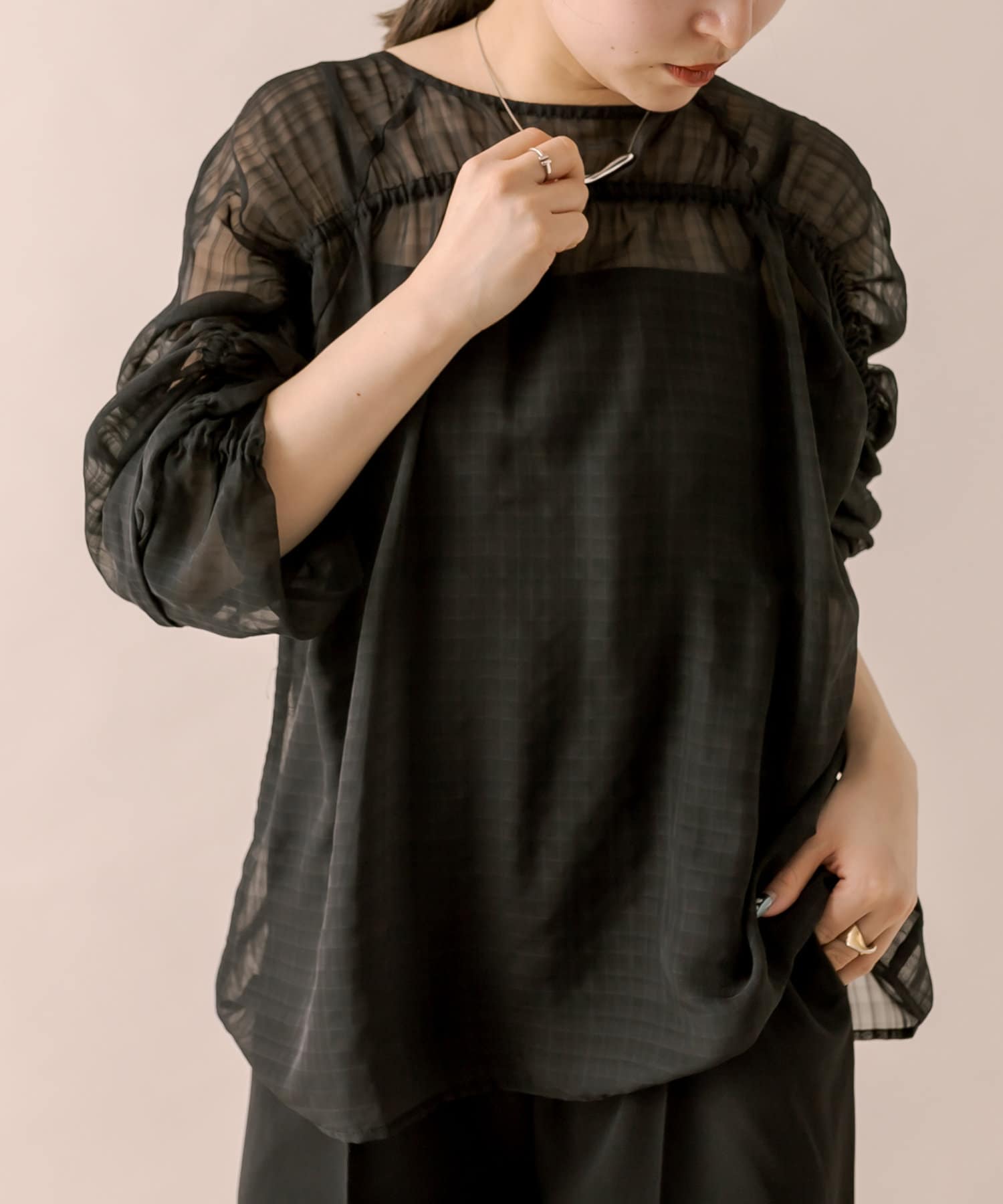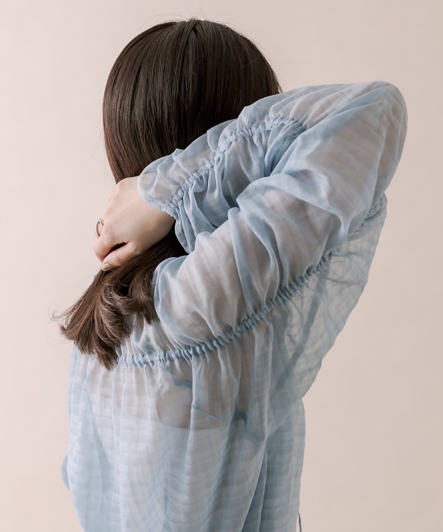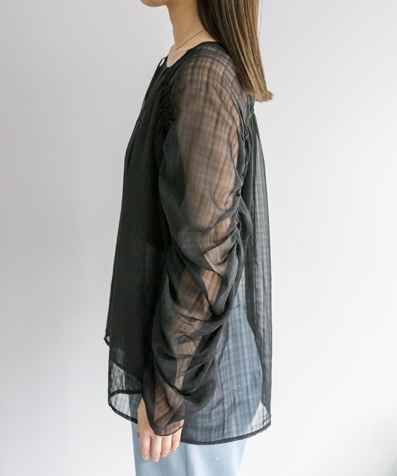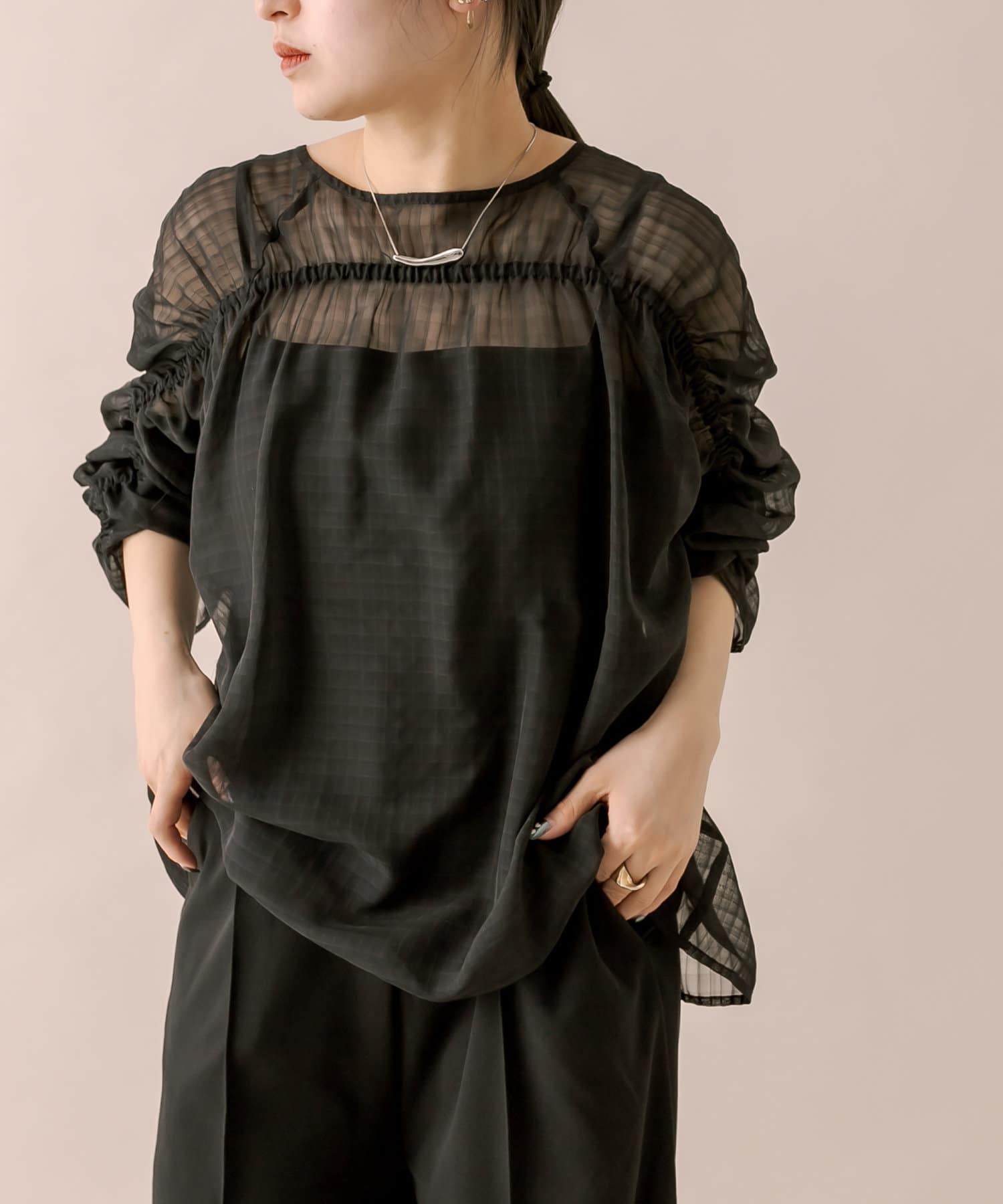 ギャザー×チェックが華やか見えするシアーブラウス!
