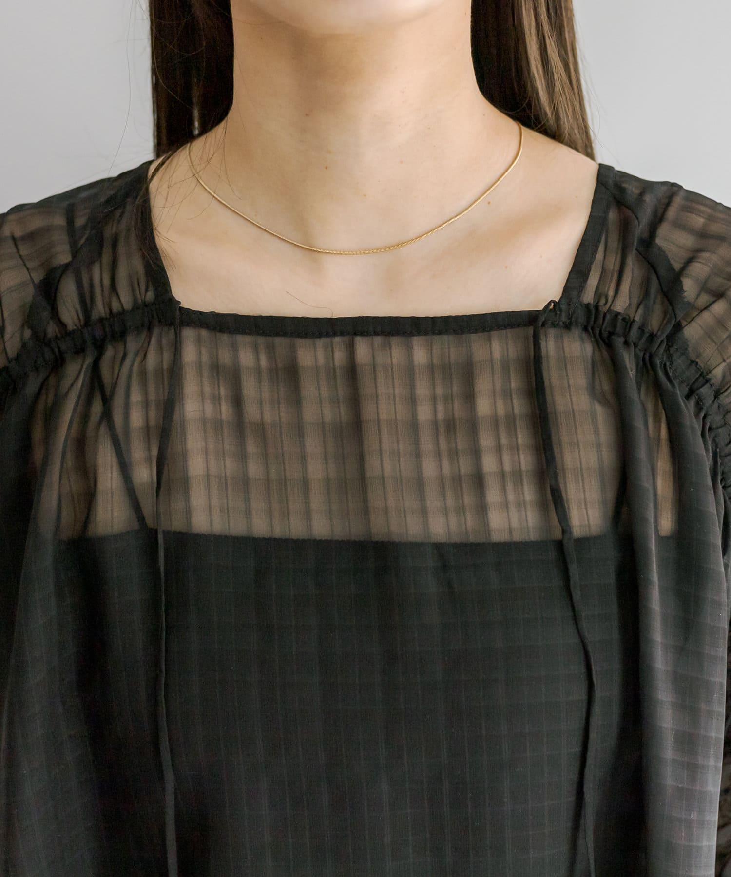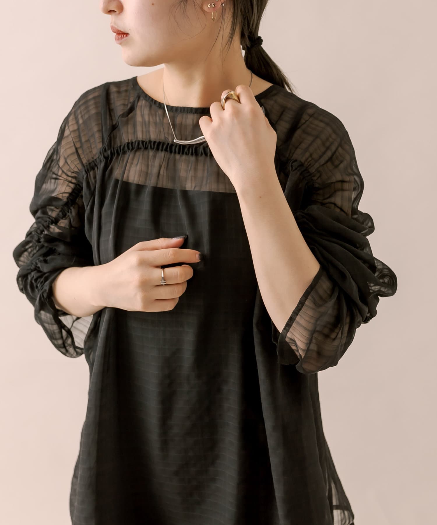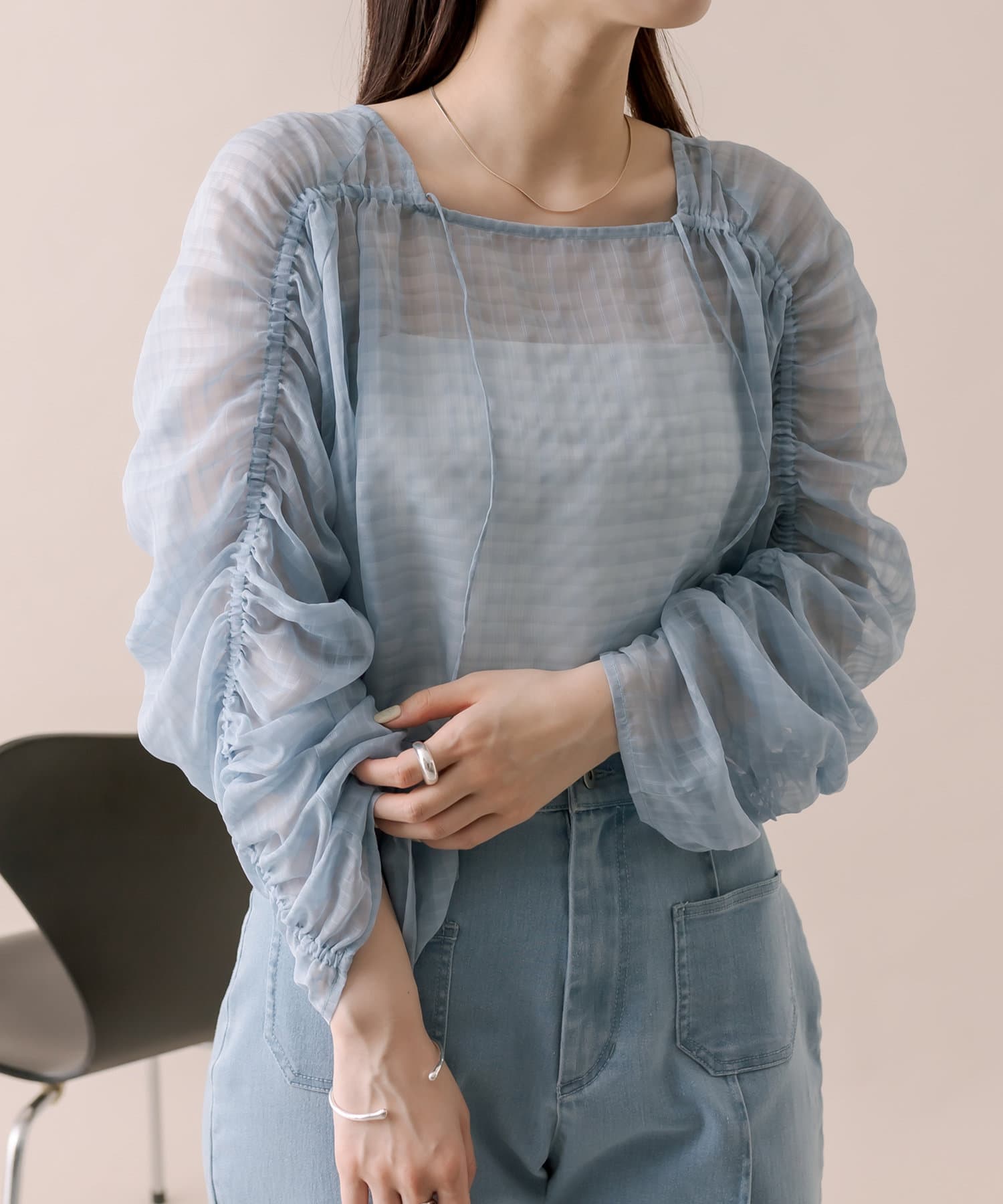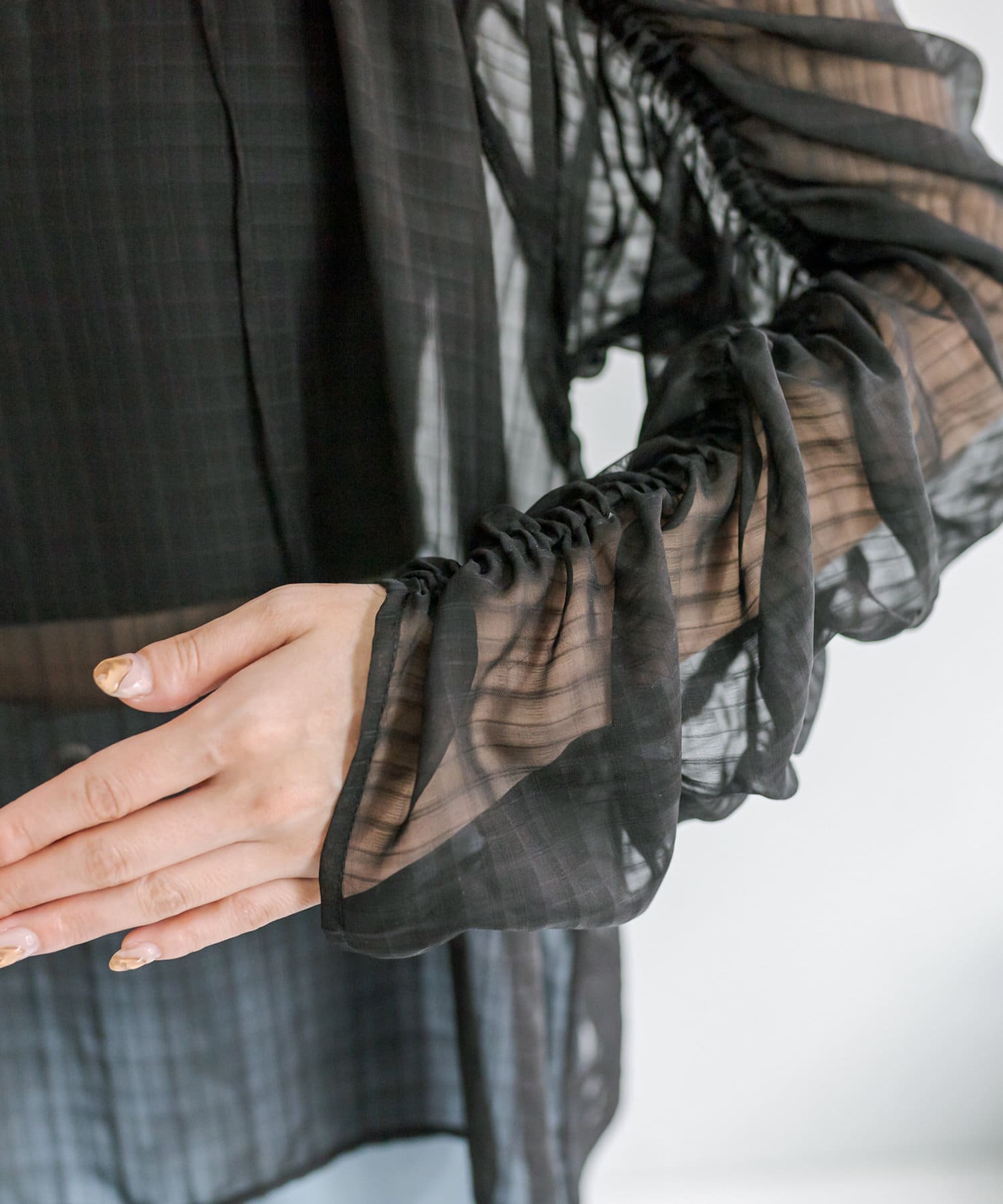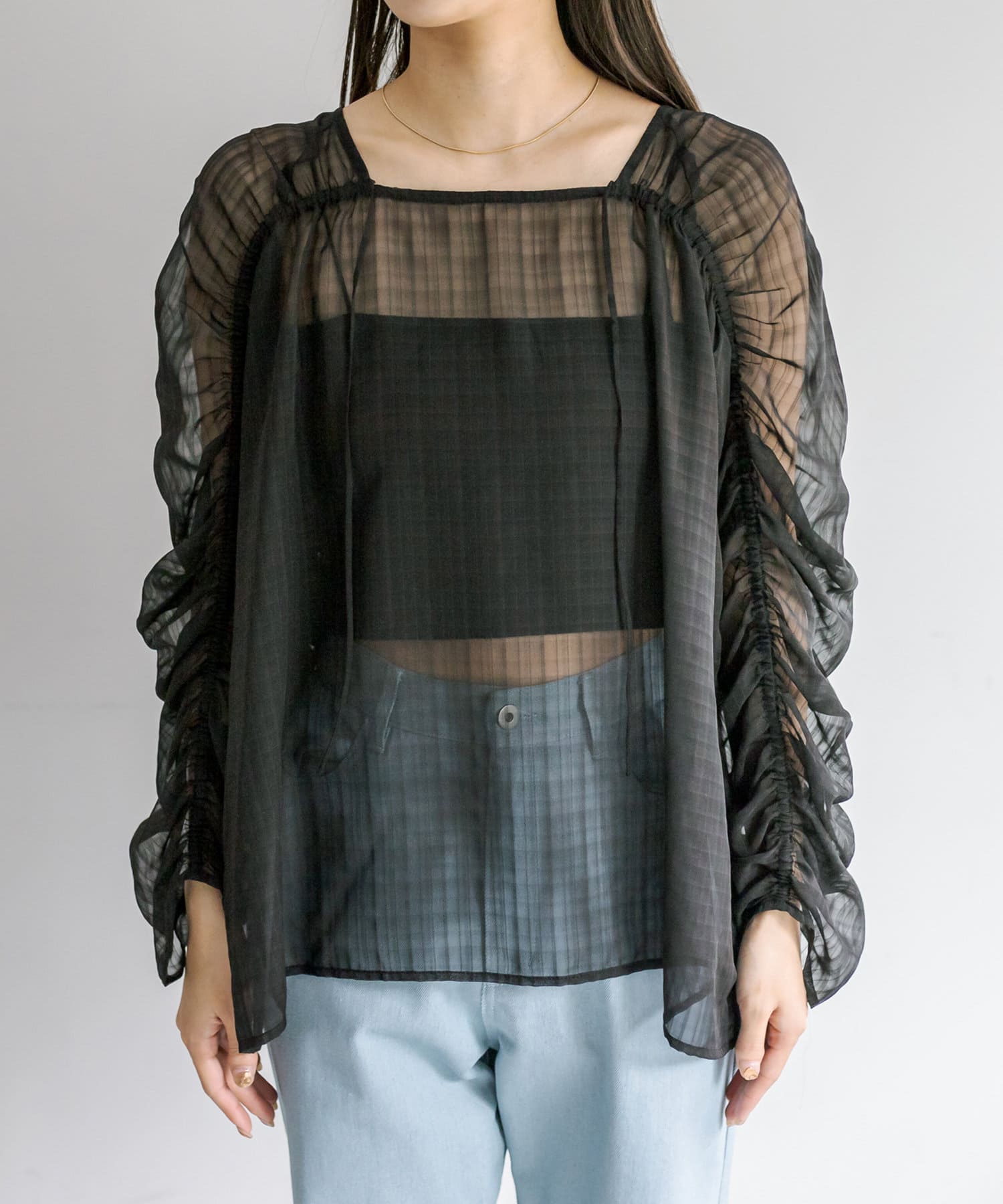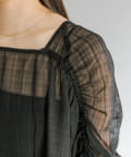ギャザー×チェックが華やか見えするシアーブラウス!