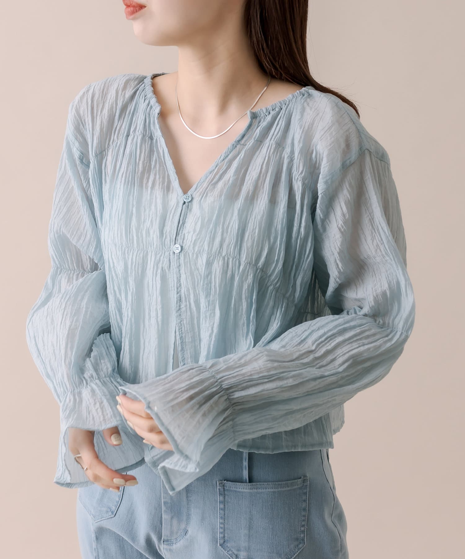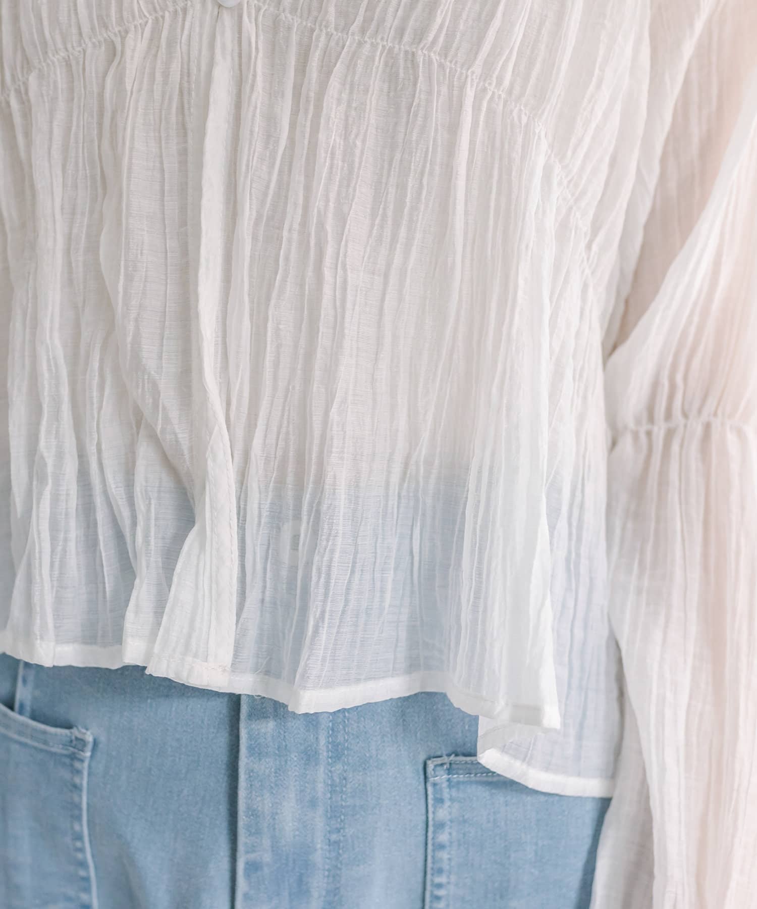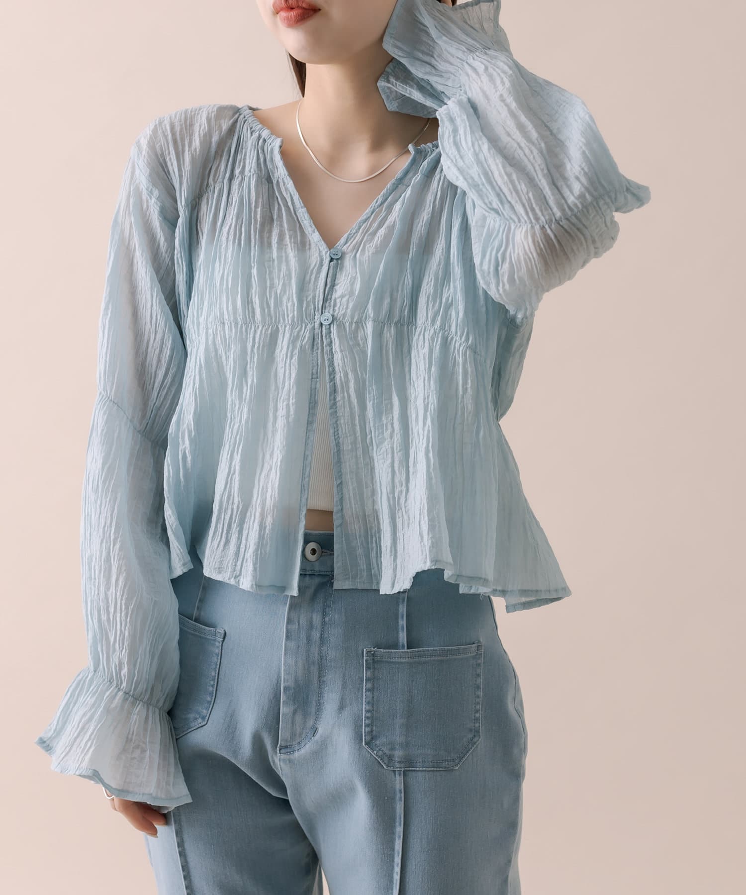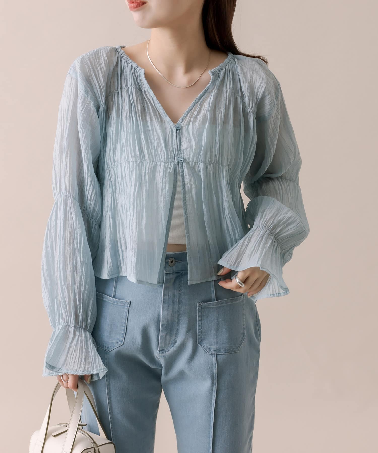・長めの袖感ですがシアー素材なので軽やかに着用していただけます。
