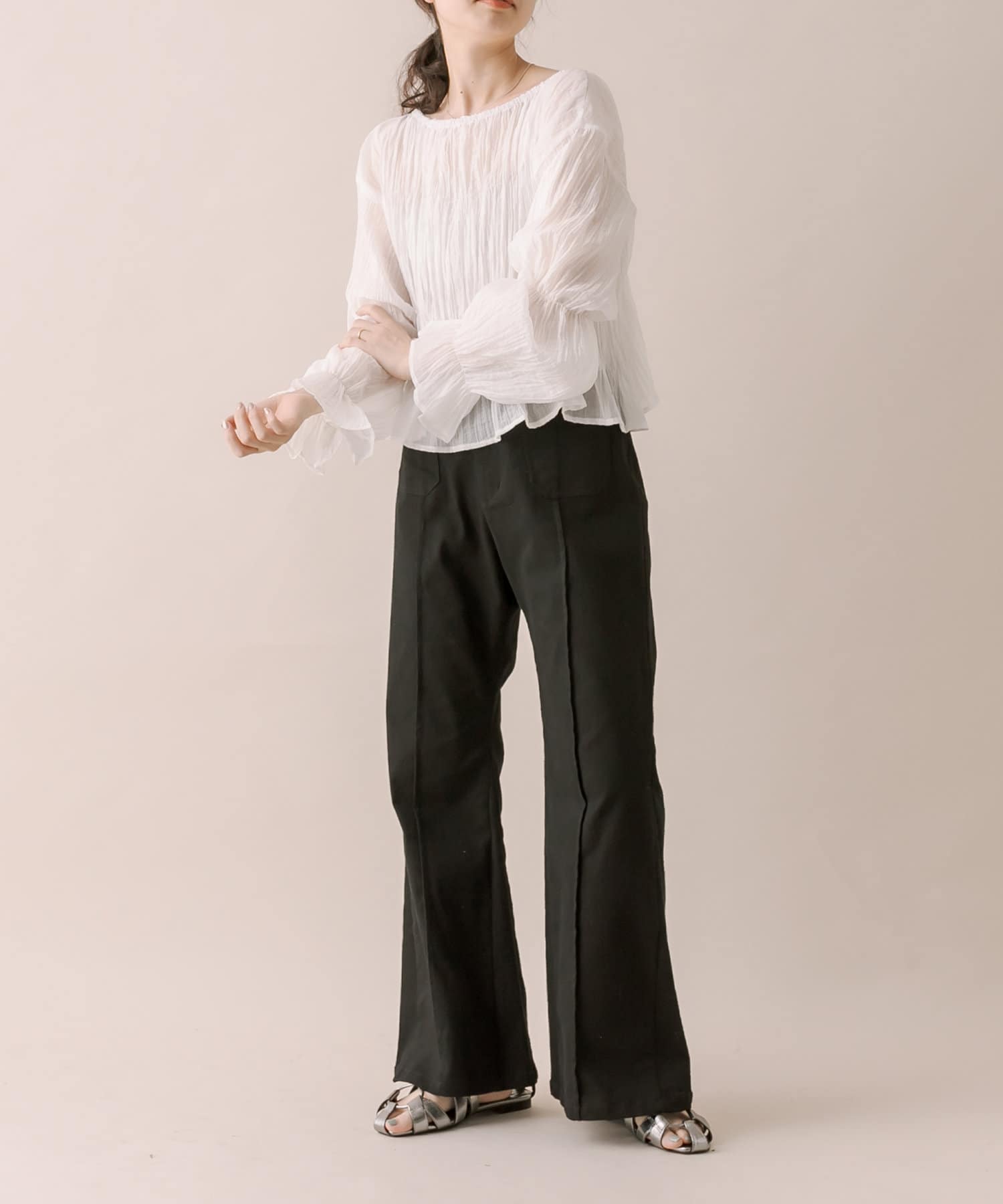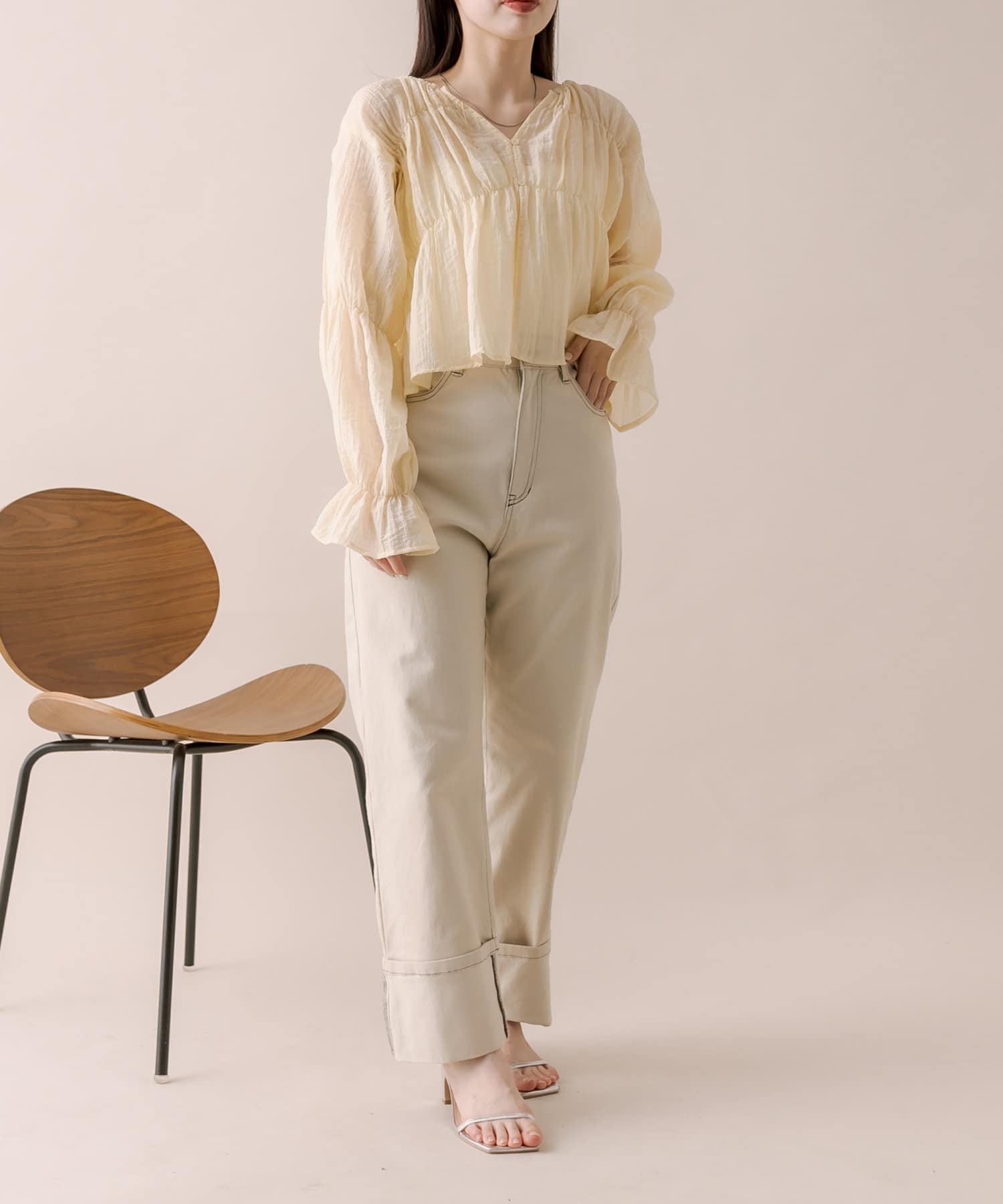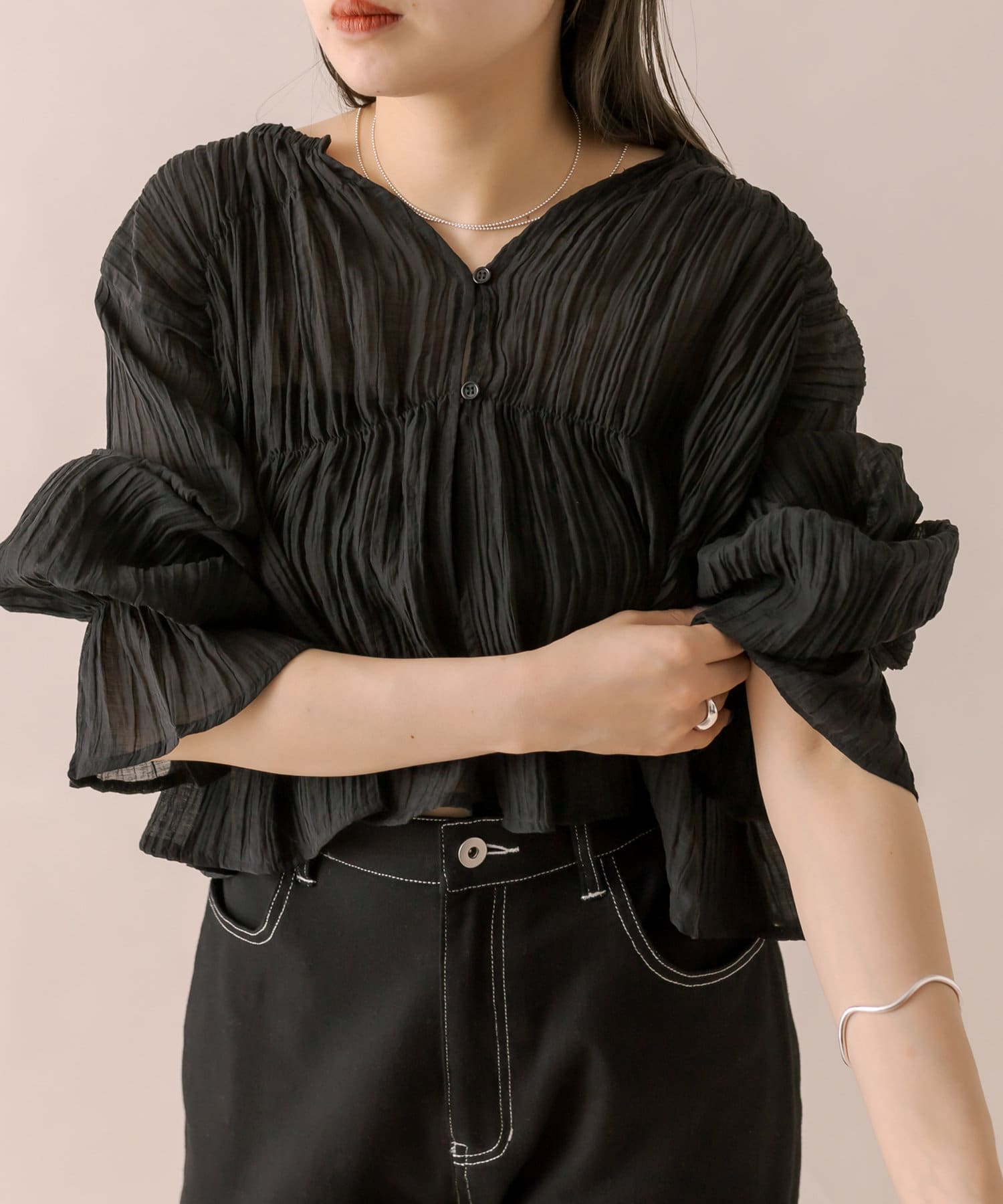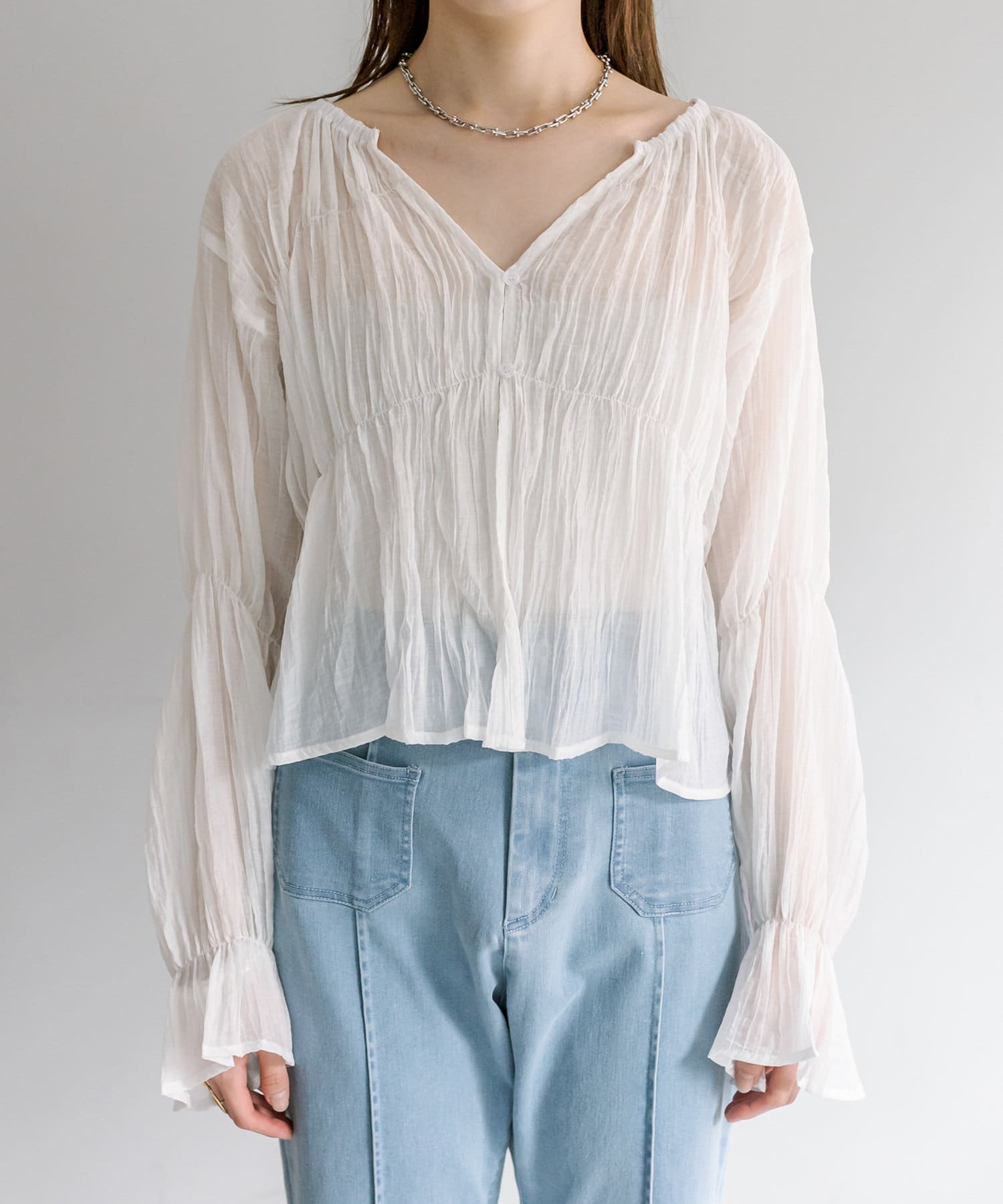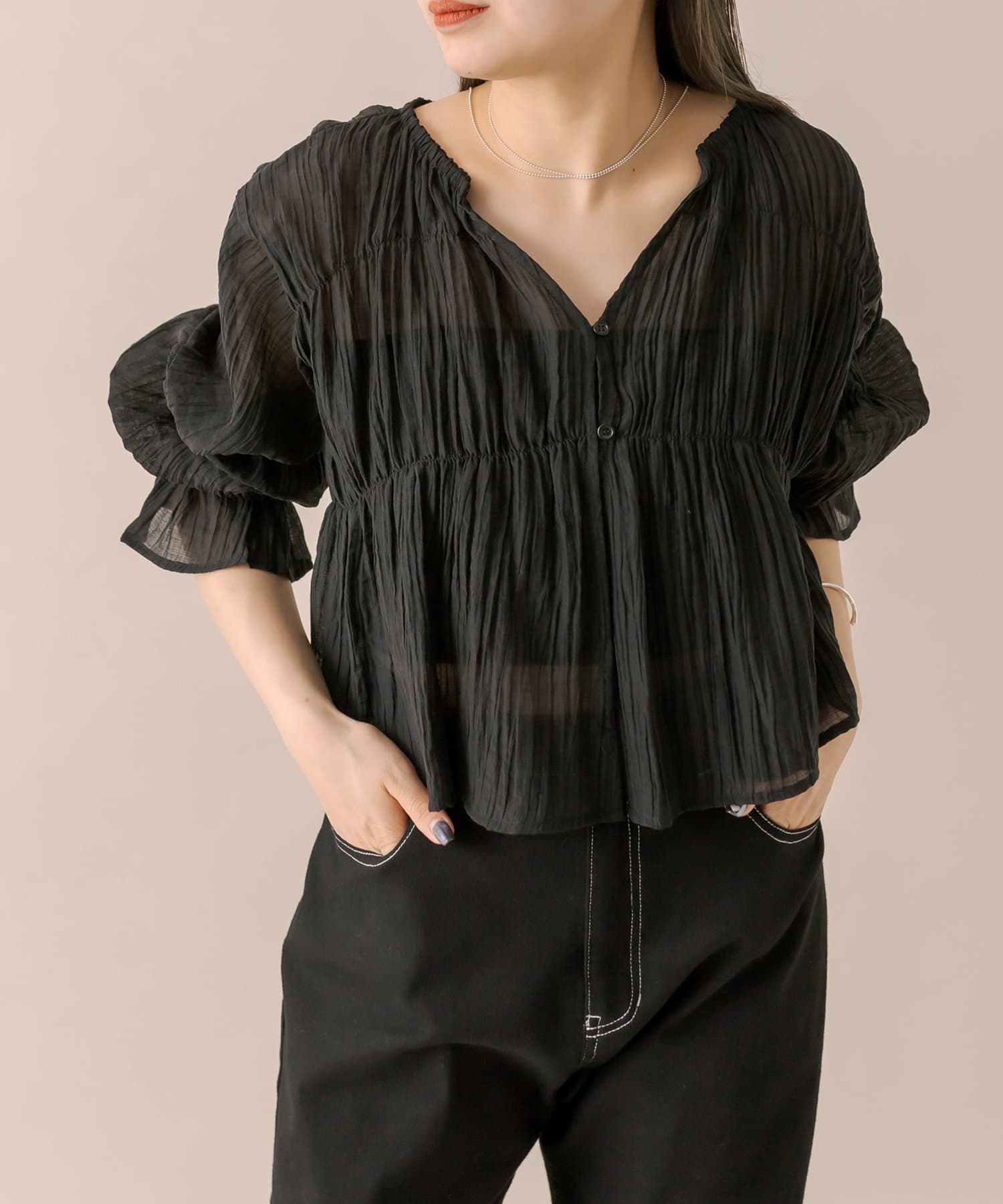 ・長めの袖感ですがシアー素材なので軽やかに着用していただけます。
