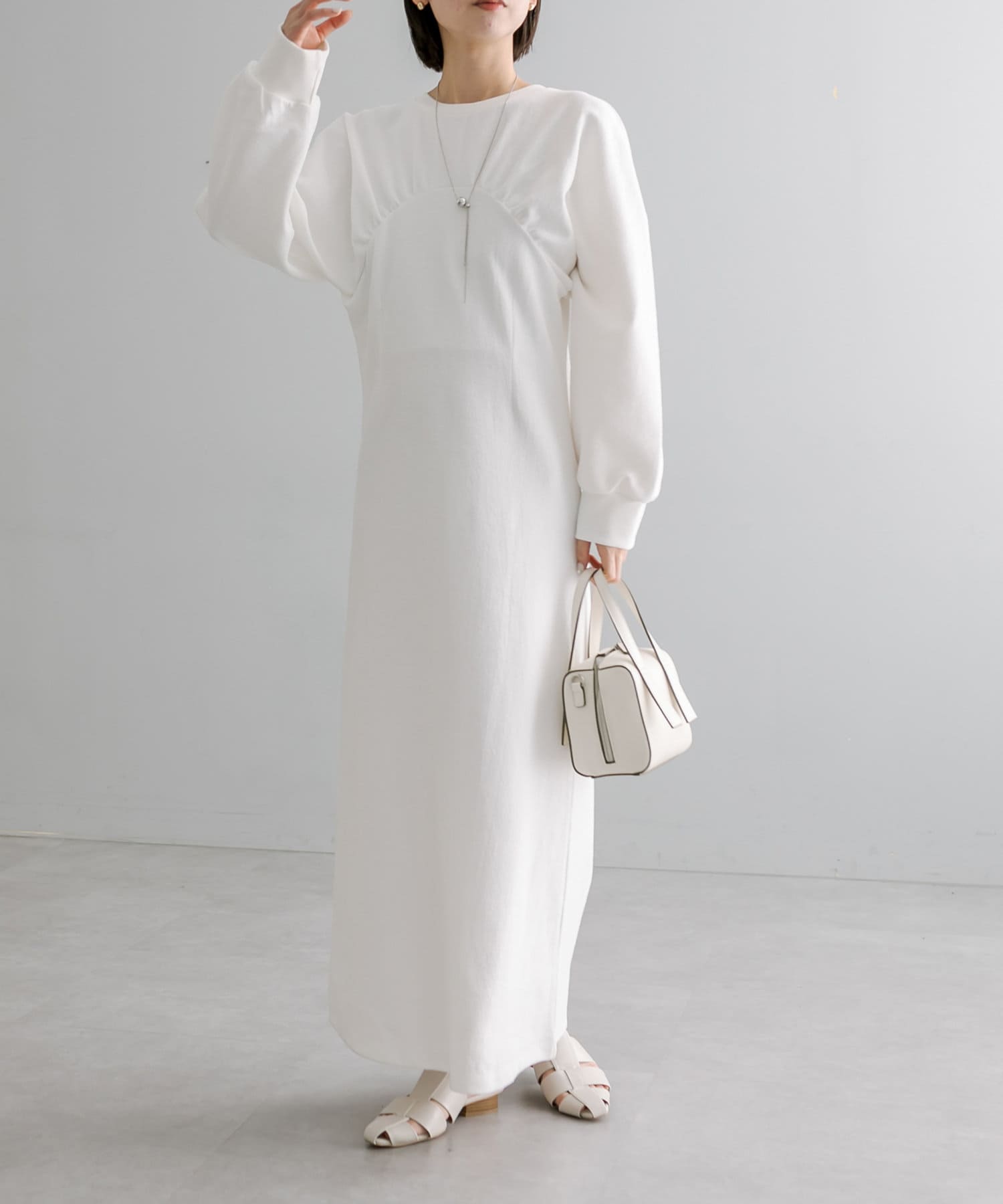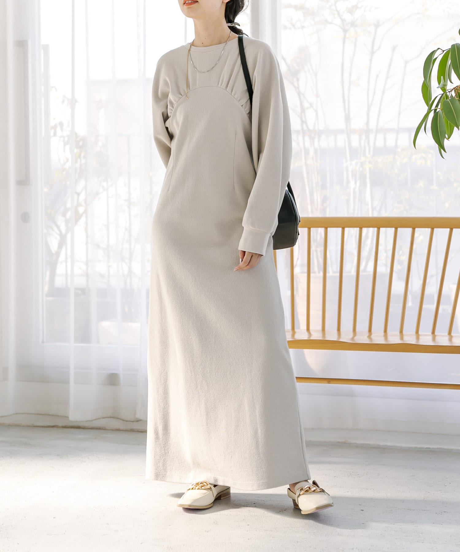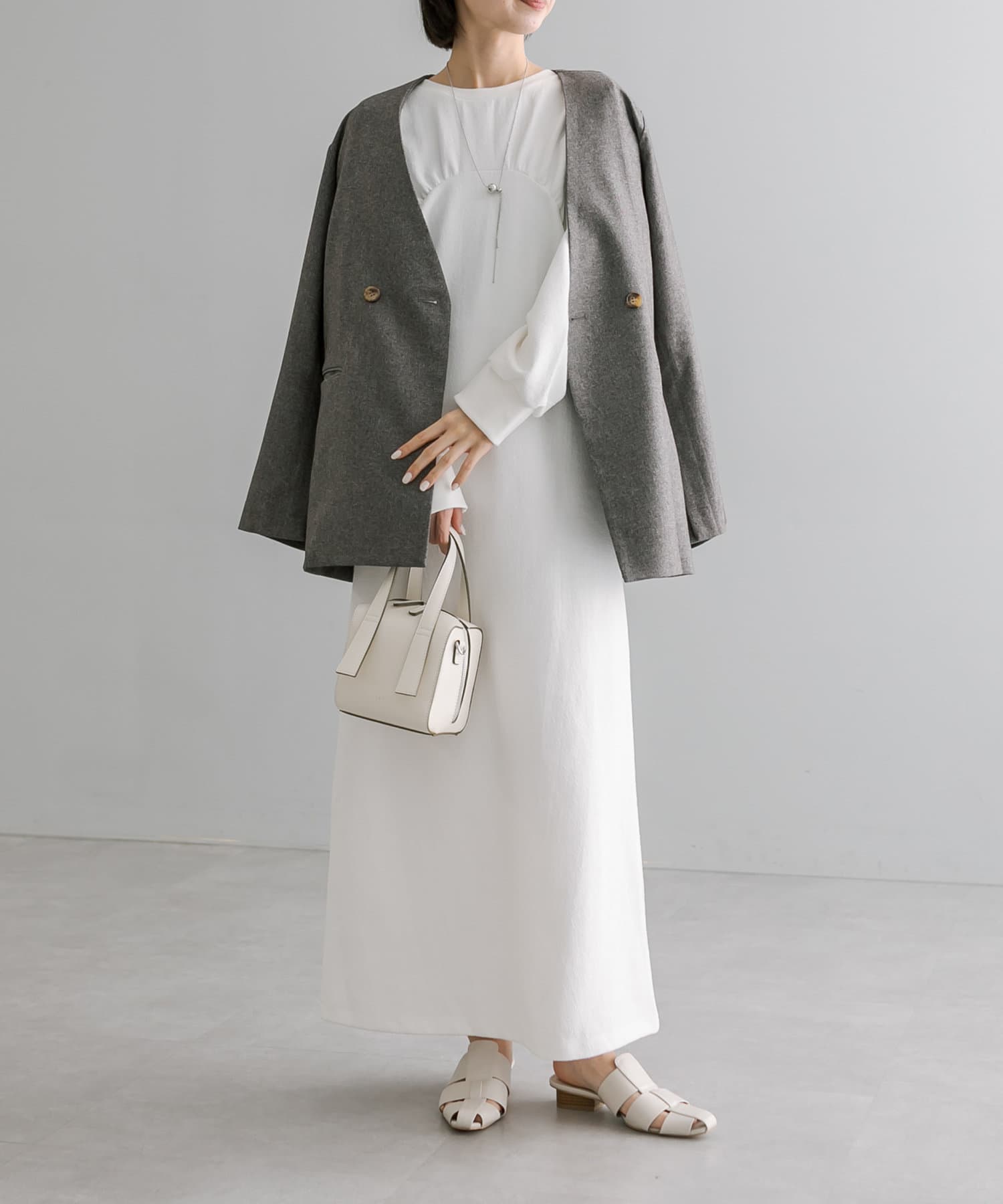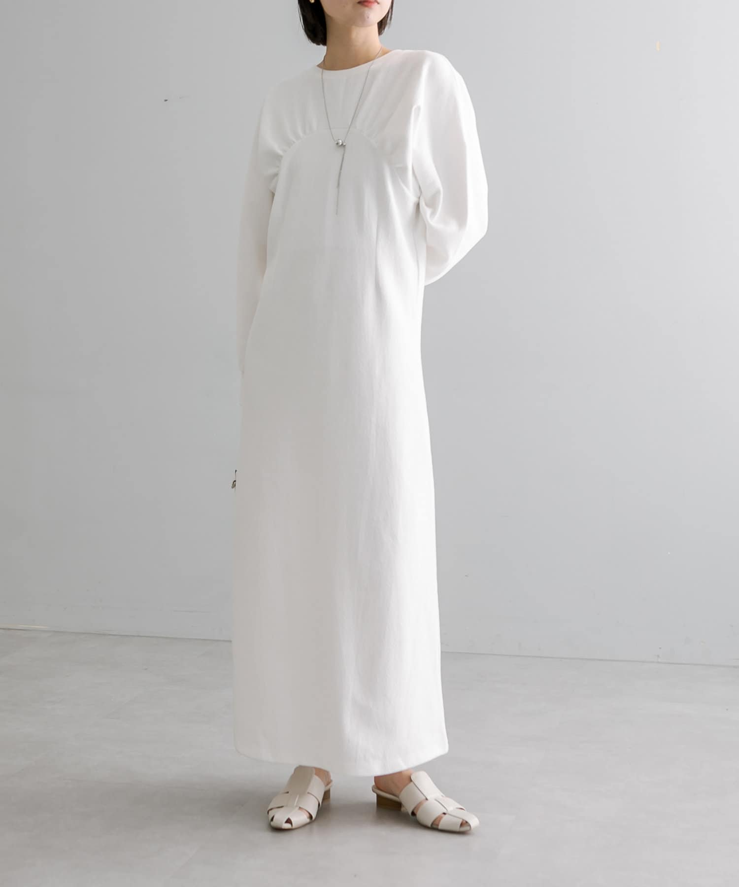 ・1枚でスタイリングが完成します。ロングネックレスを合わせて華やかさをプラス◎