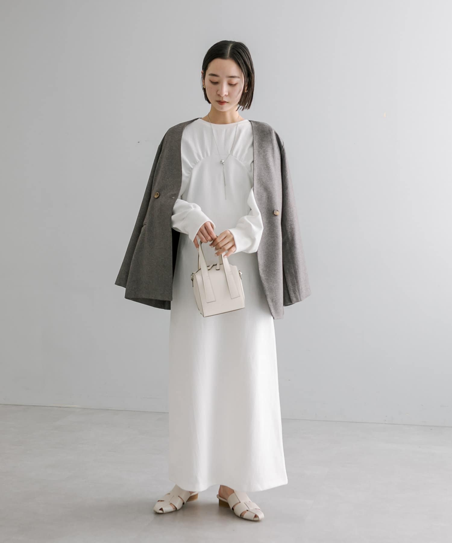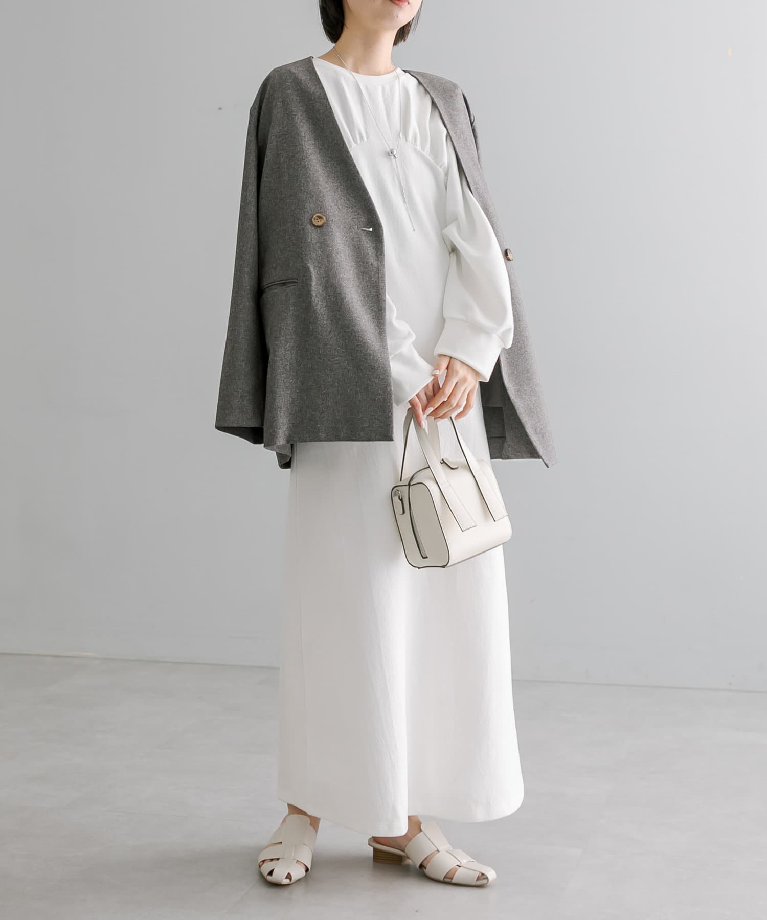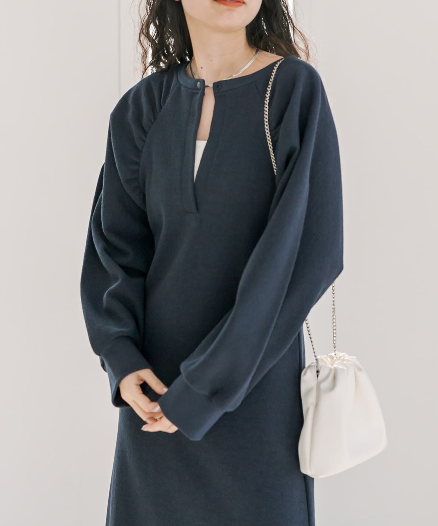 ・1枚でスタイリングが完成します。ロングネックレスを合わせて華やかさをプラス◎