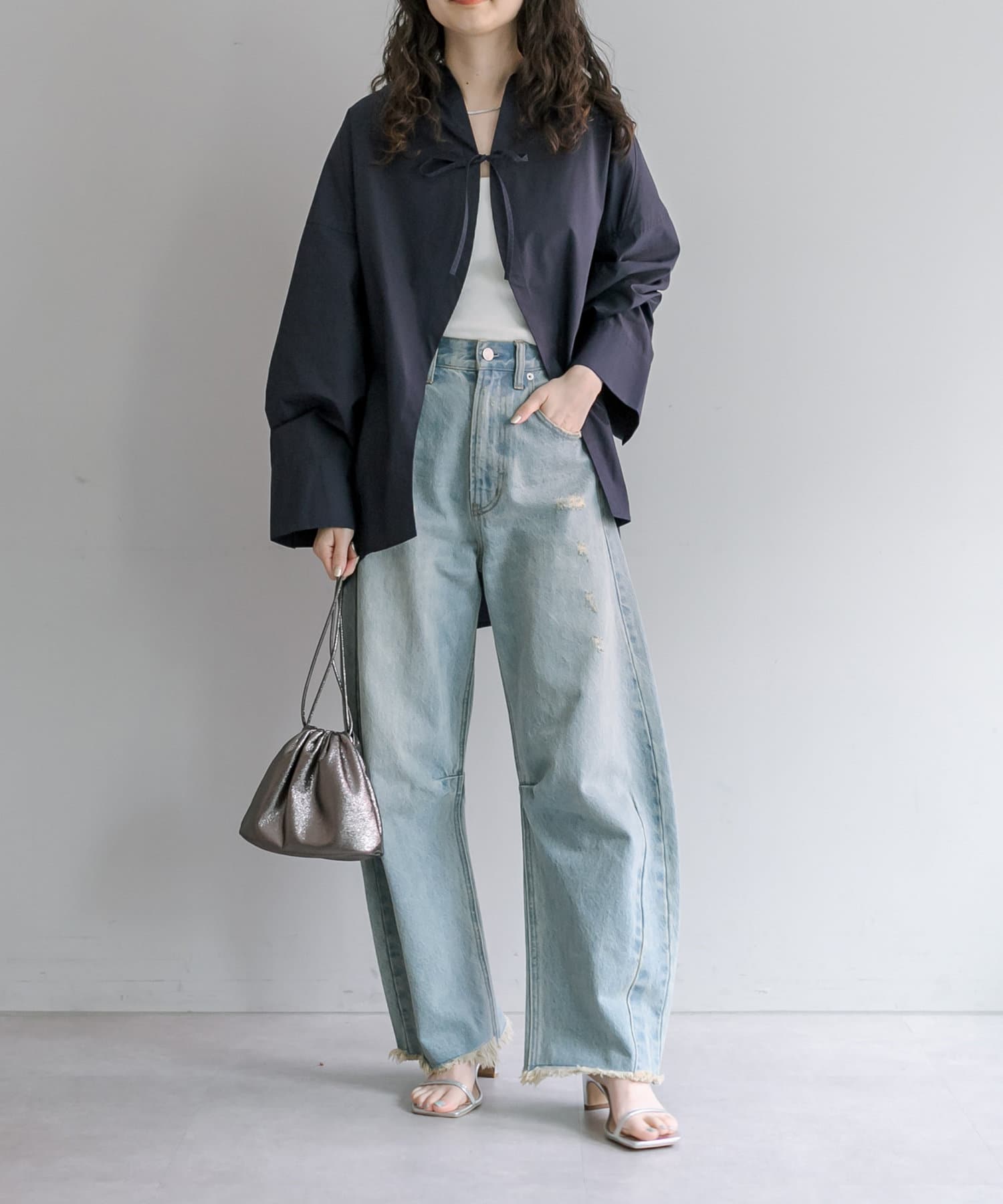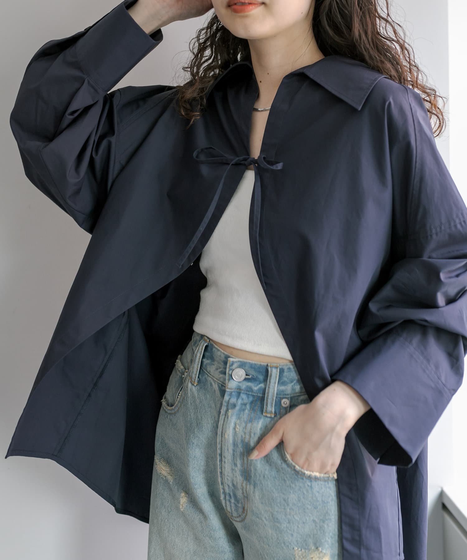 ・コンパクトな衿・リボン・ラウンド・バックギャザーと細かなデザインがつまったシャツ。