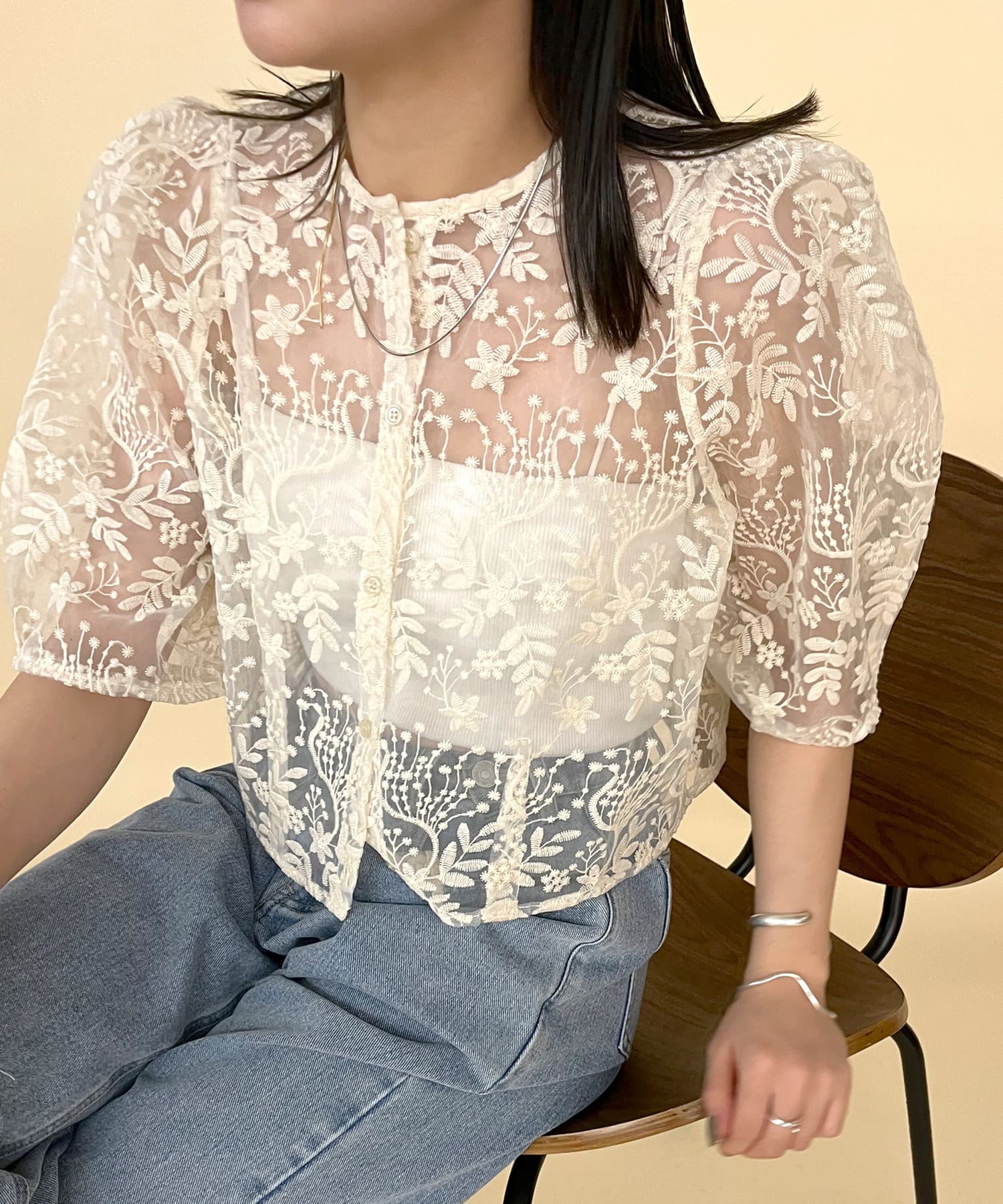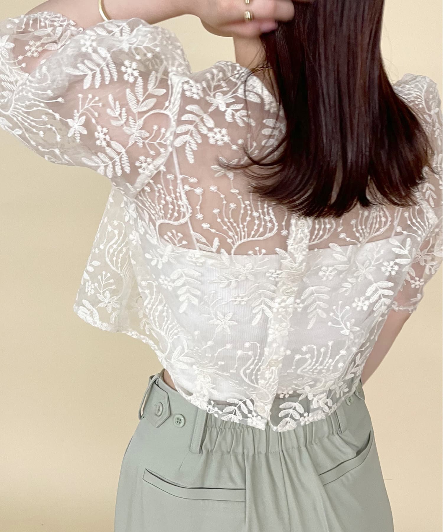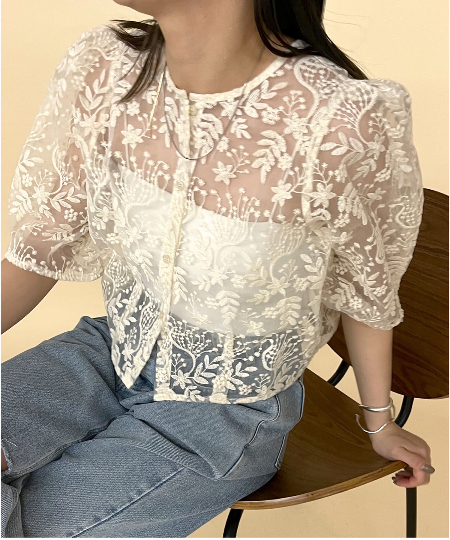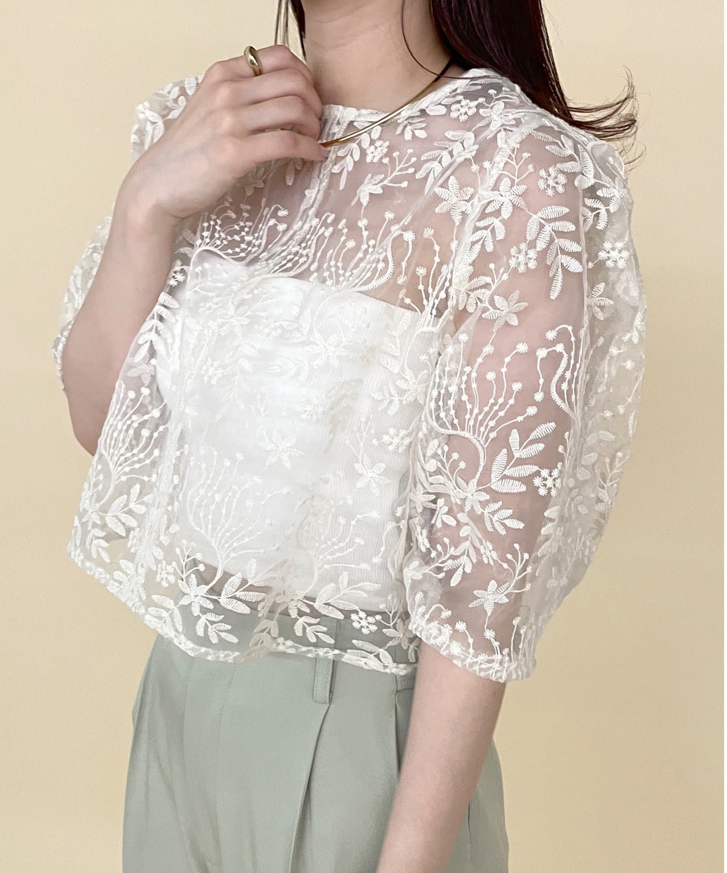 ・透け感のある素材感なのでパット付きキャミソールと合わせて頂くのがおすすめ◎