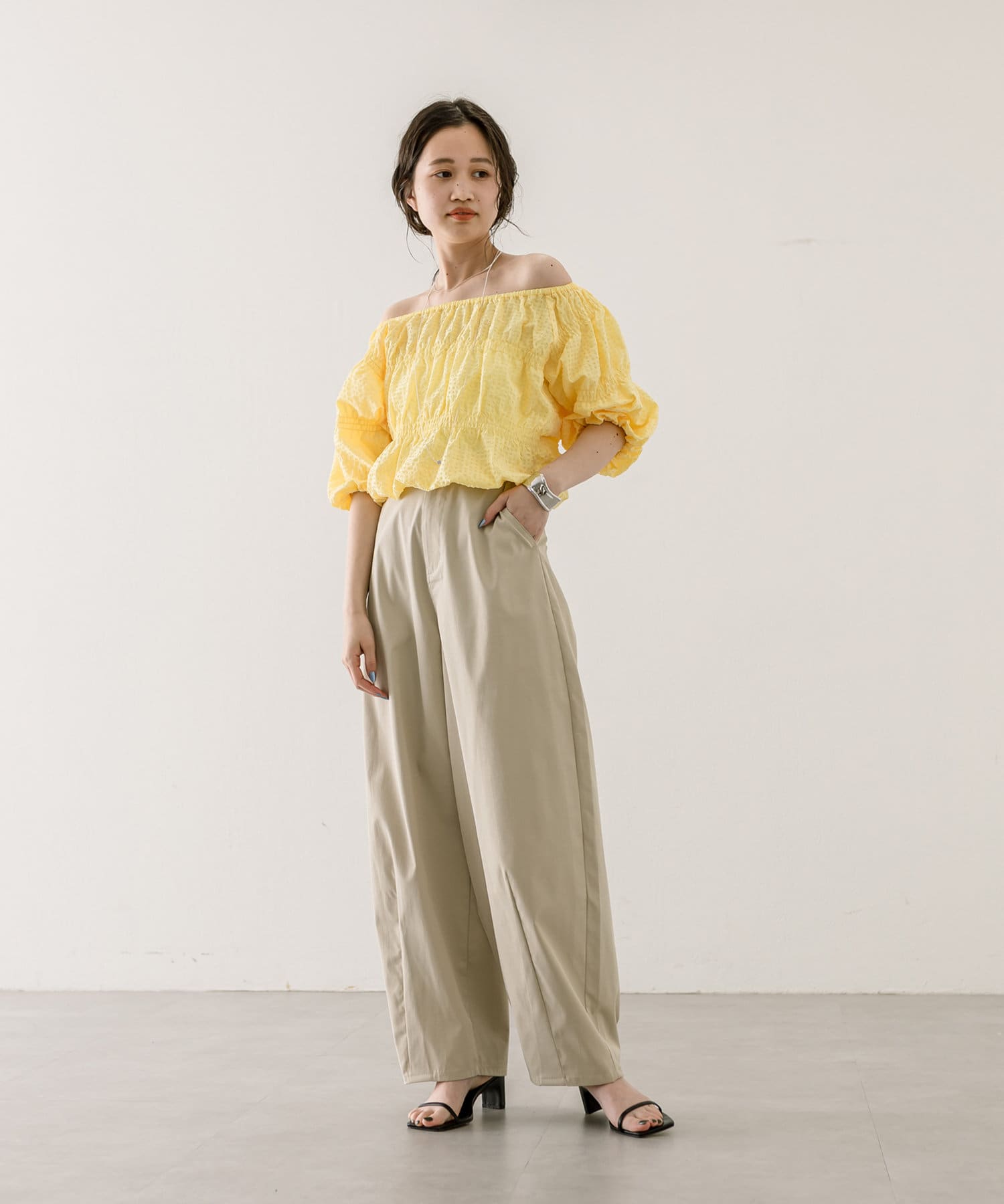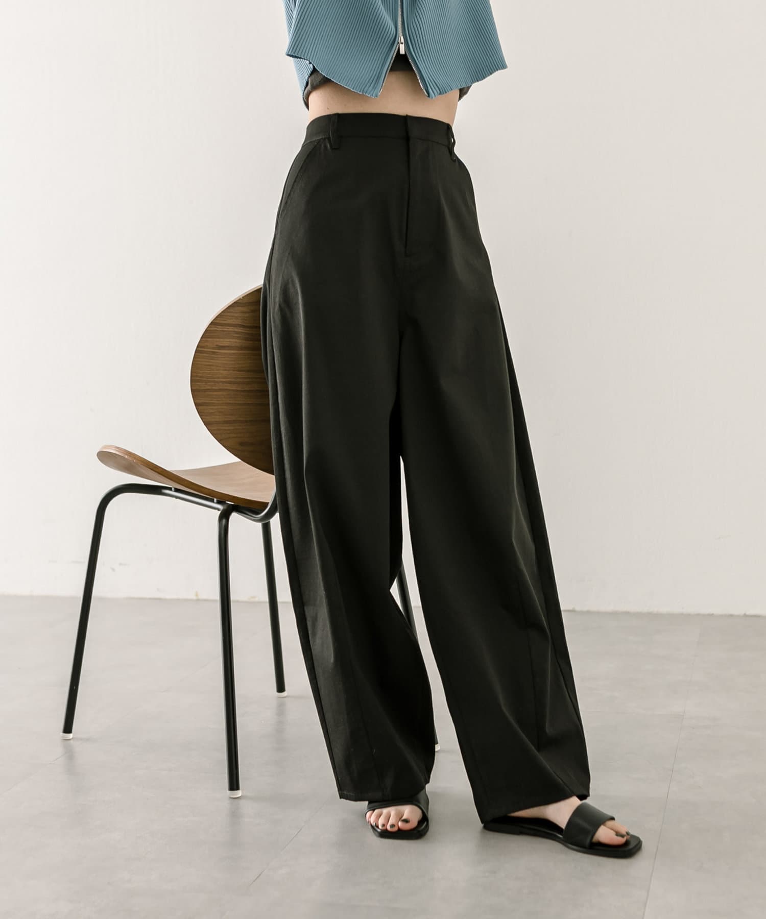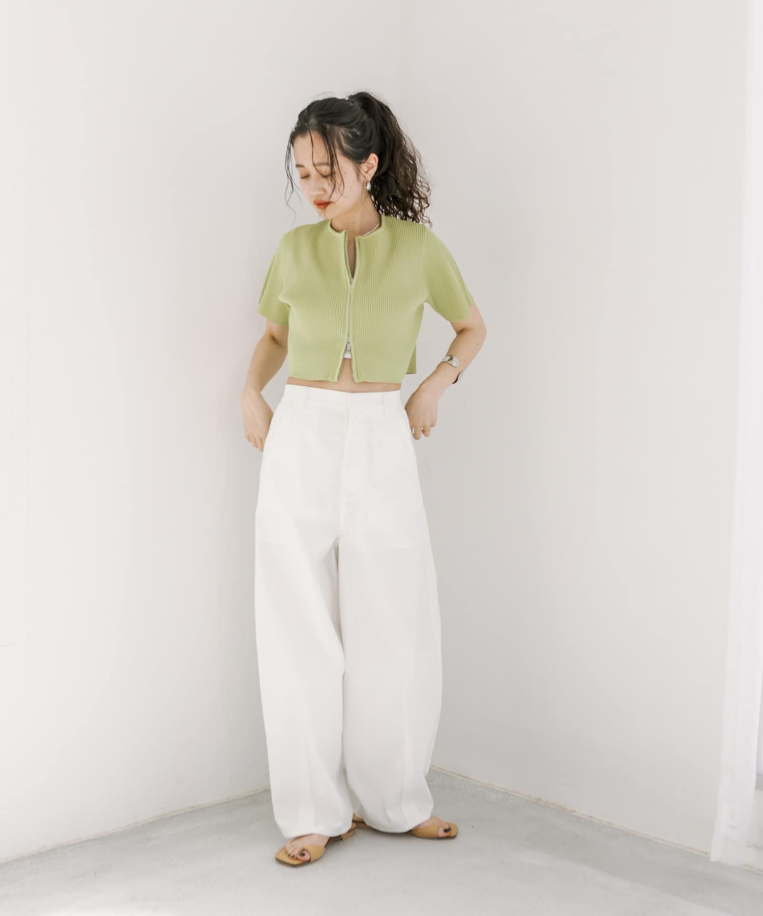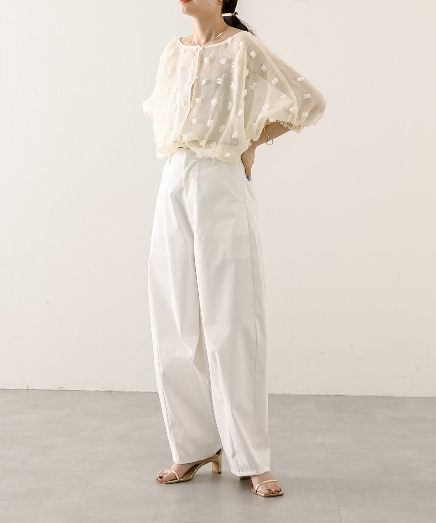 ・ワイドに広がる今っぽいシルエットながらも足元のタックがアクセントになり新鮮な一着です。