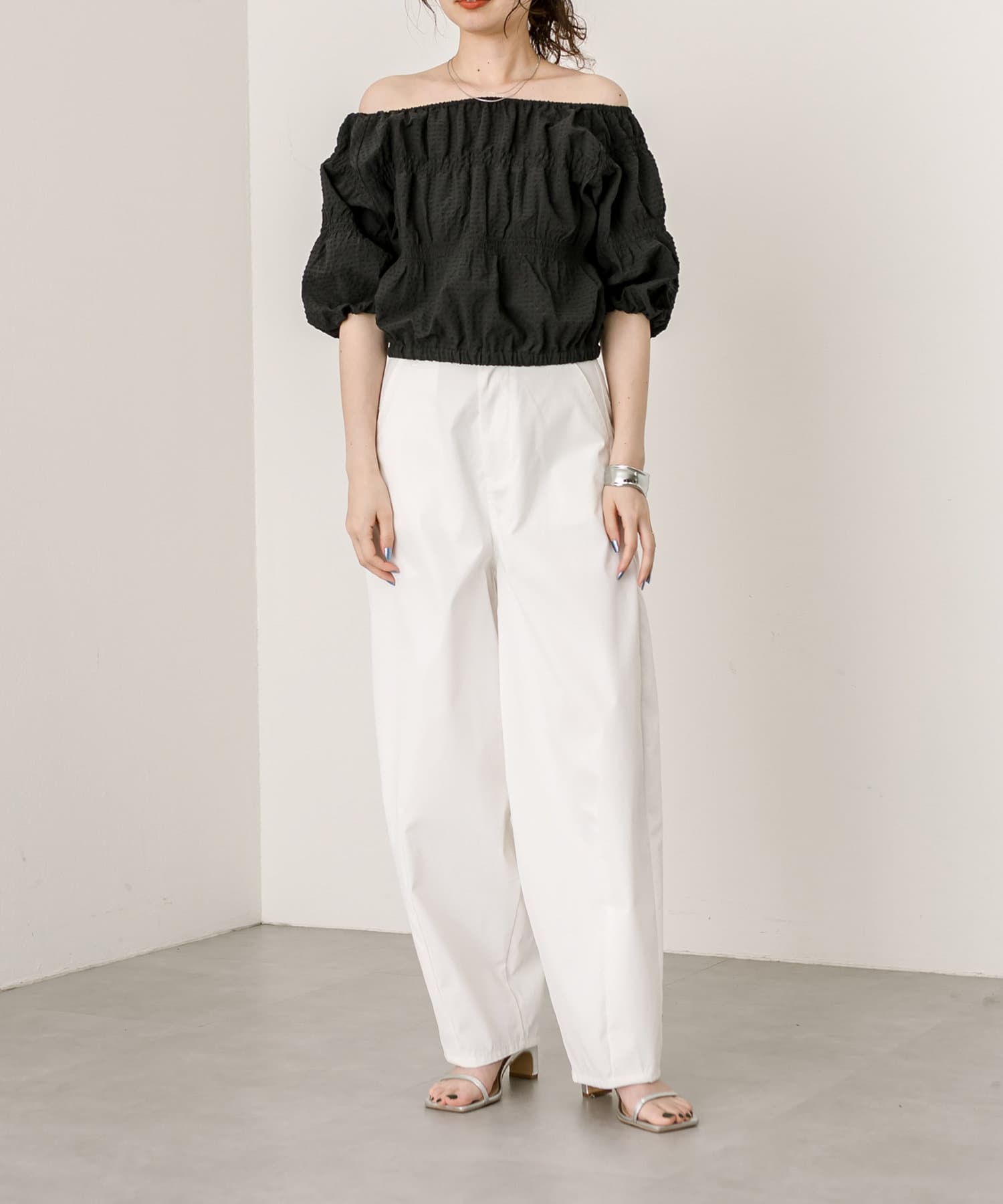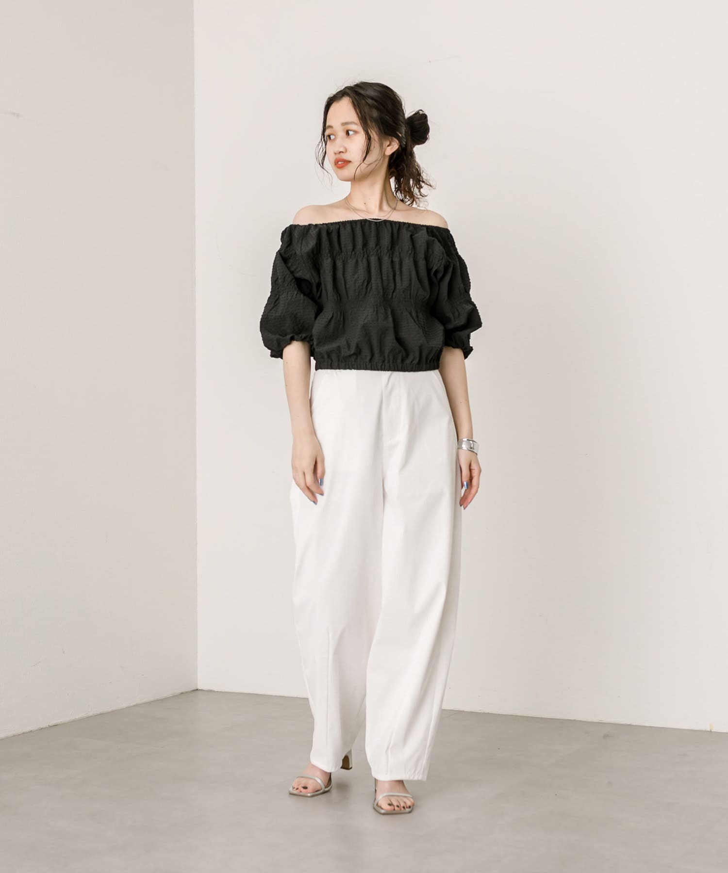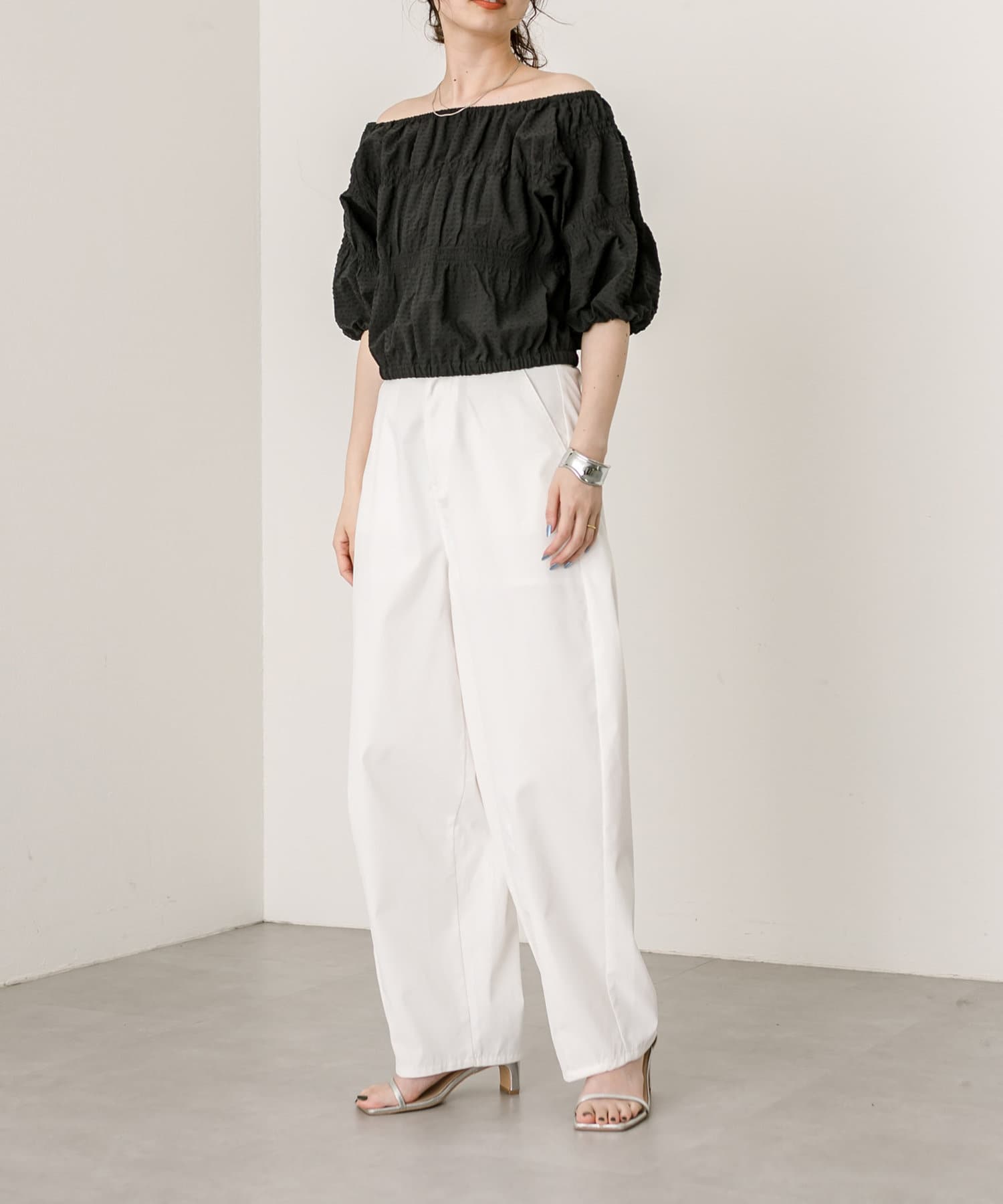・ゆるっとした着用感がありつつも、ウエストのゴムが腰回りをすっきり見せてくれるのも嬉しいポイント◎