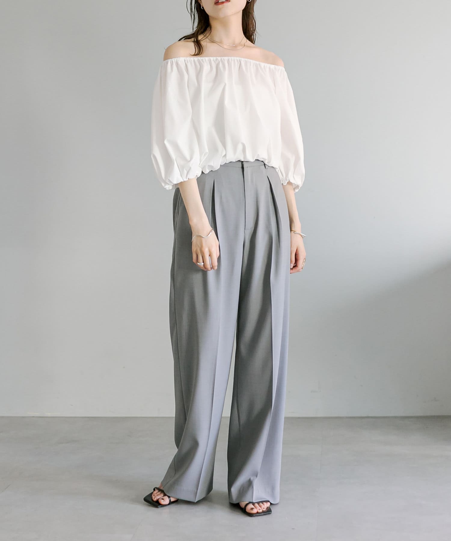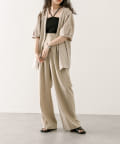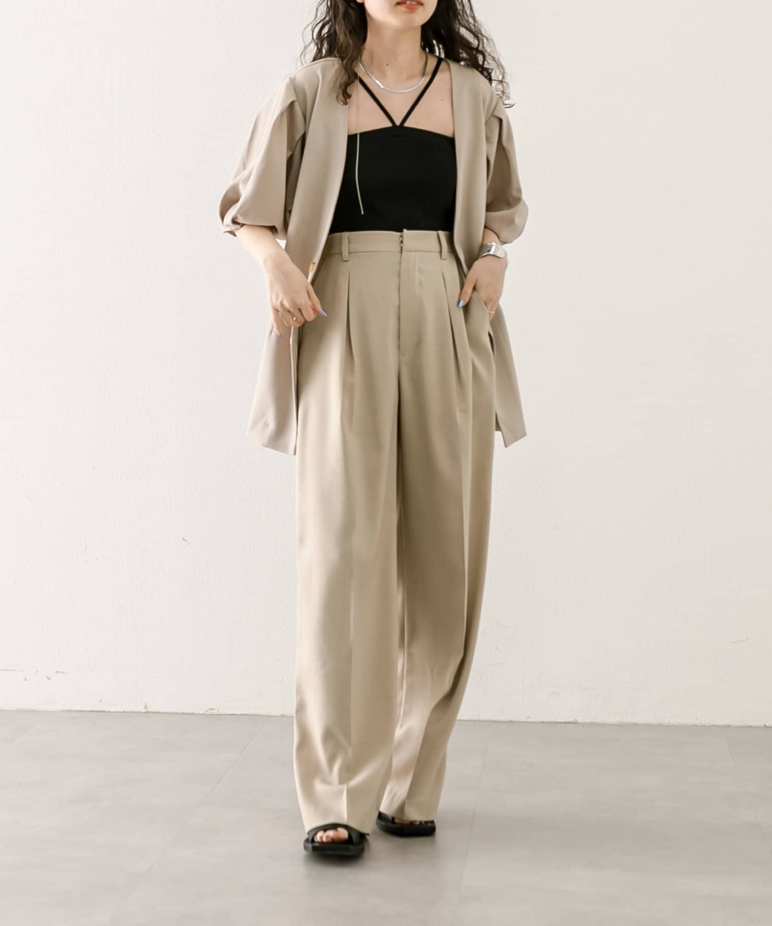 ・ゆるっとしたシルエットでありながら、フロントのタックがウエスト周りをすっきりと見せてくれる嬉しい一着。