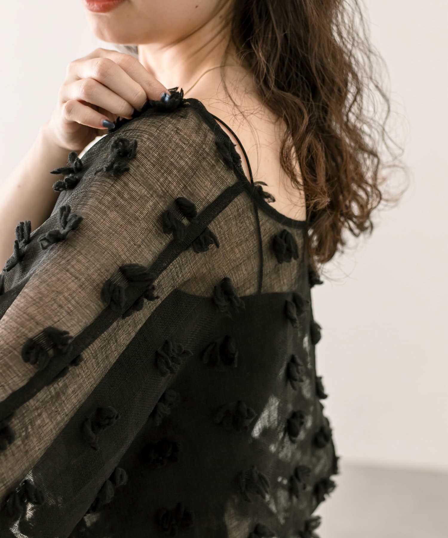・透け感のあるアイテムなので同色に近いパット付キャミソールを合わせて頂くのがオススメ。