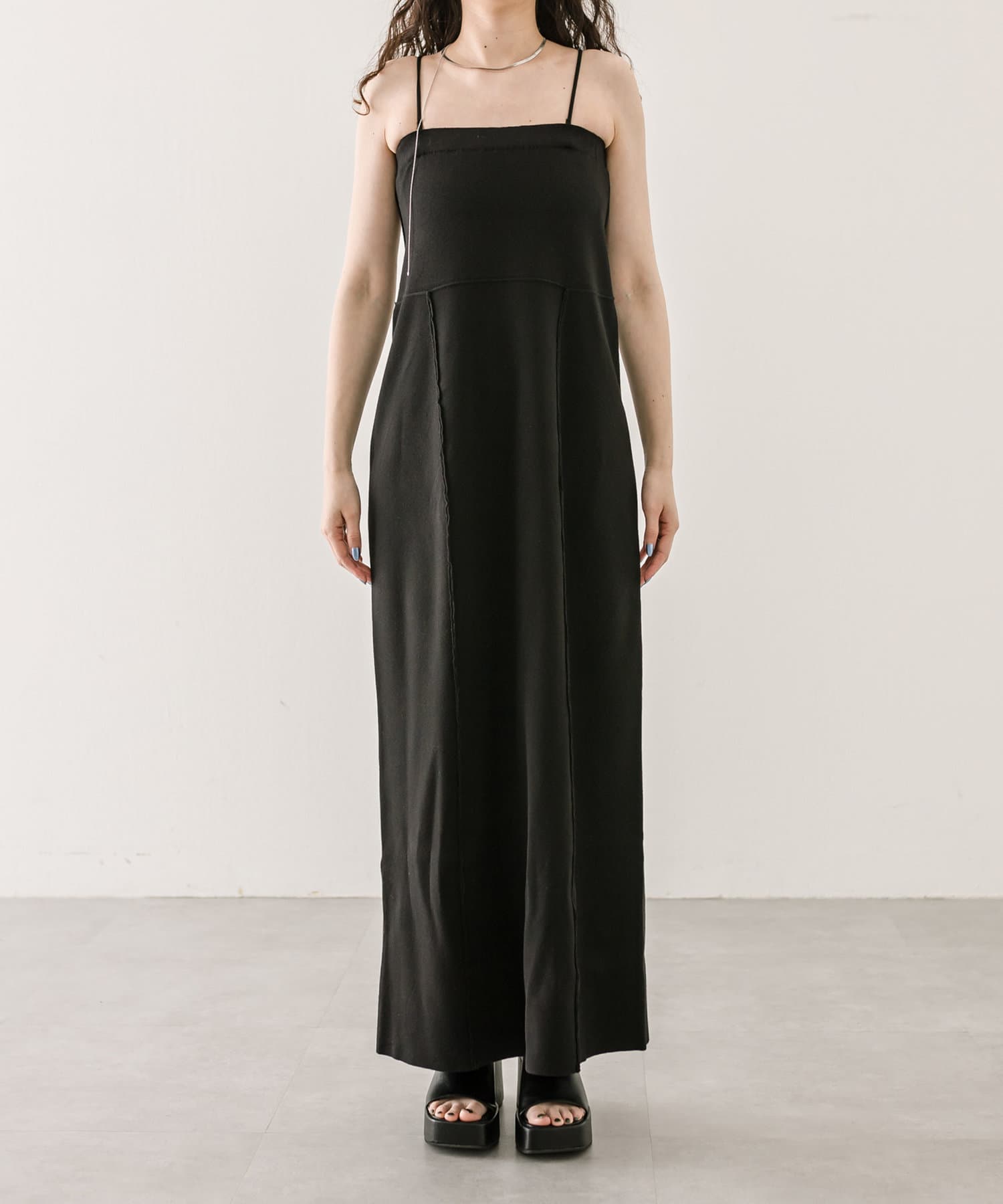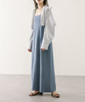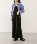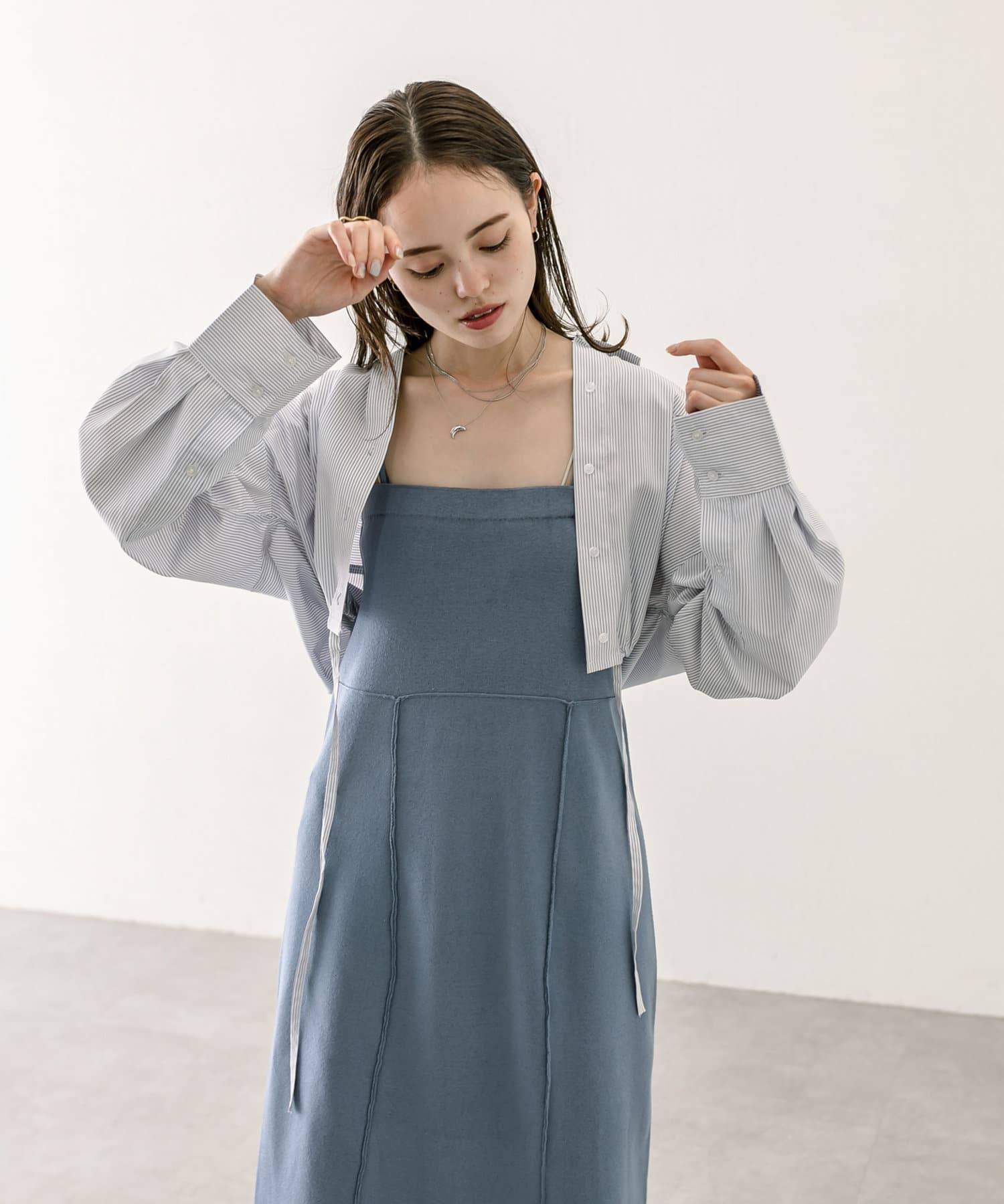 ・ニット素材のキャミワンピースとストライプシャツのset。
