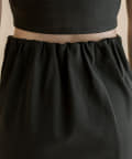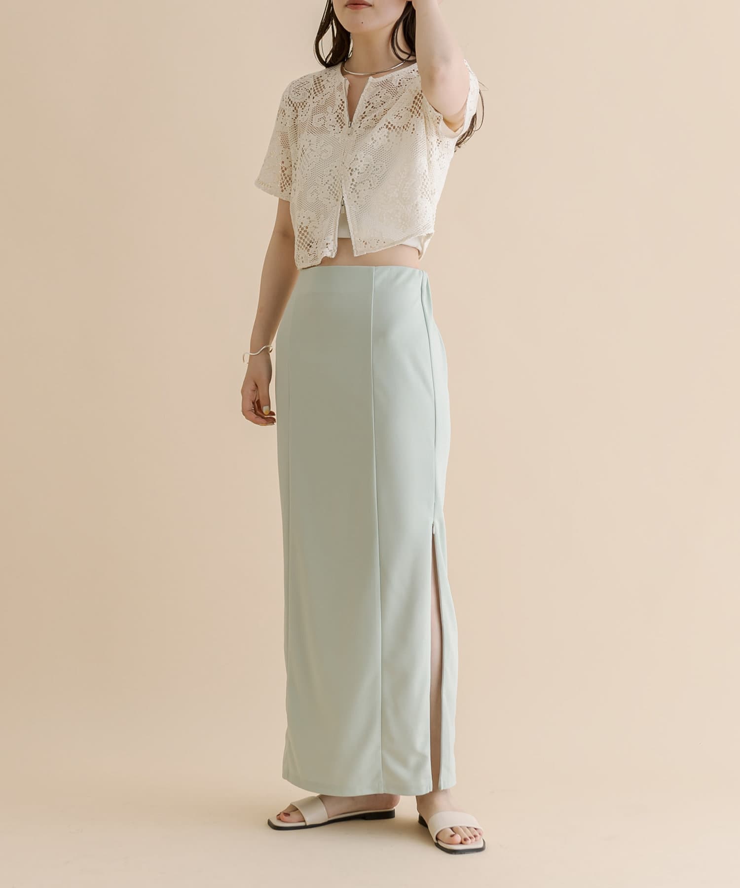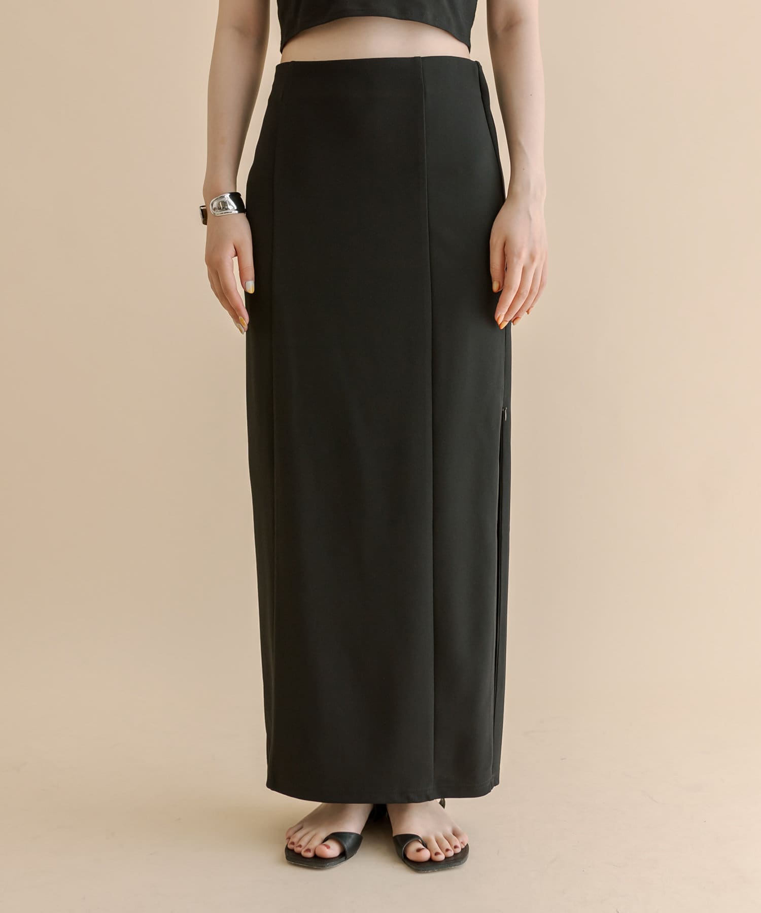 ・ひざ上まで上げられるジップでスリットの調節ができる万能スカート。