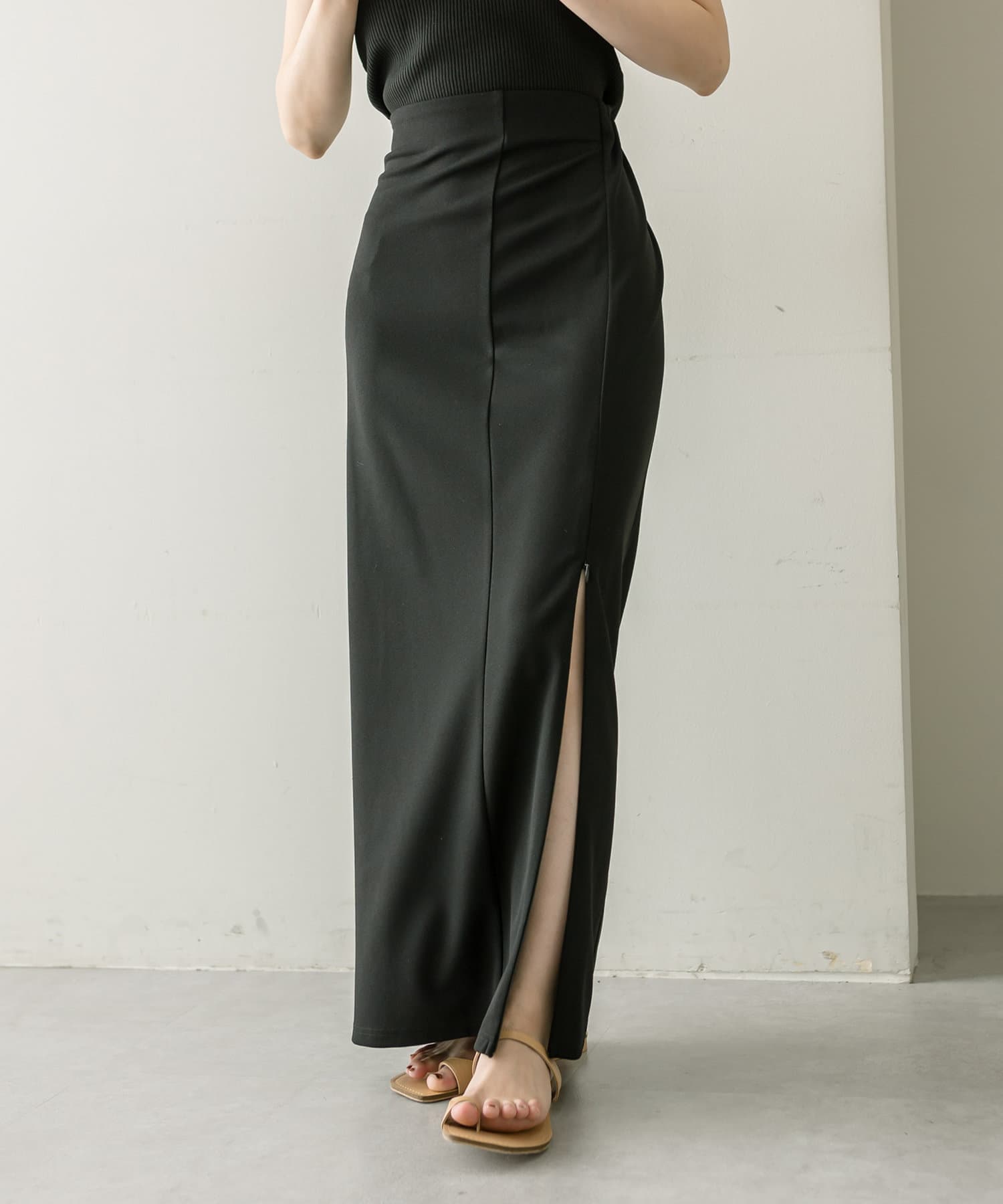 ・ひざ上まで上げられるジップでスリットの調節ができる万能スカート。