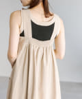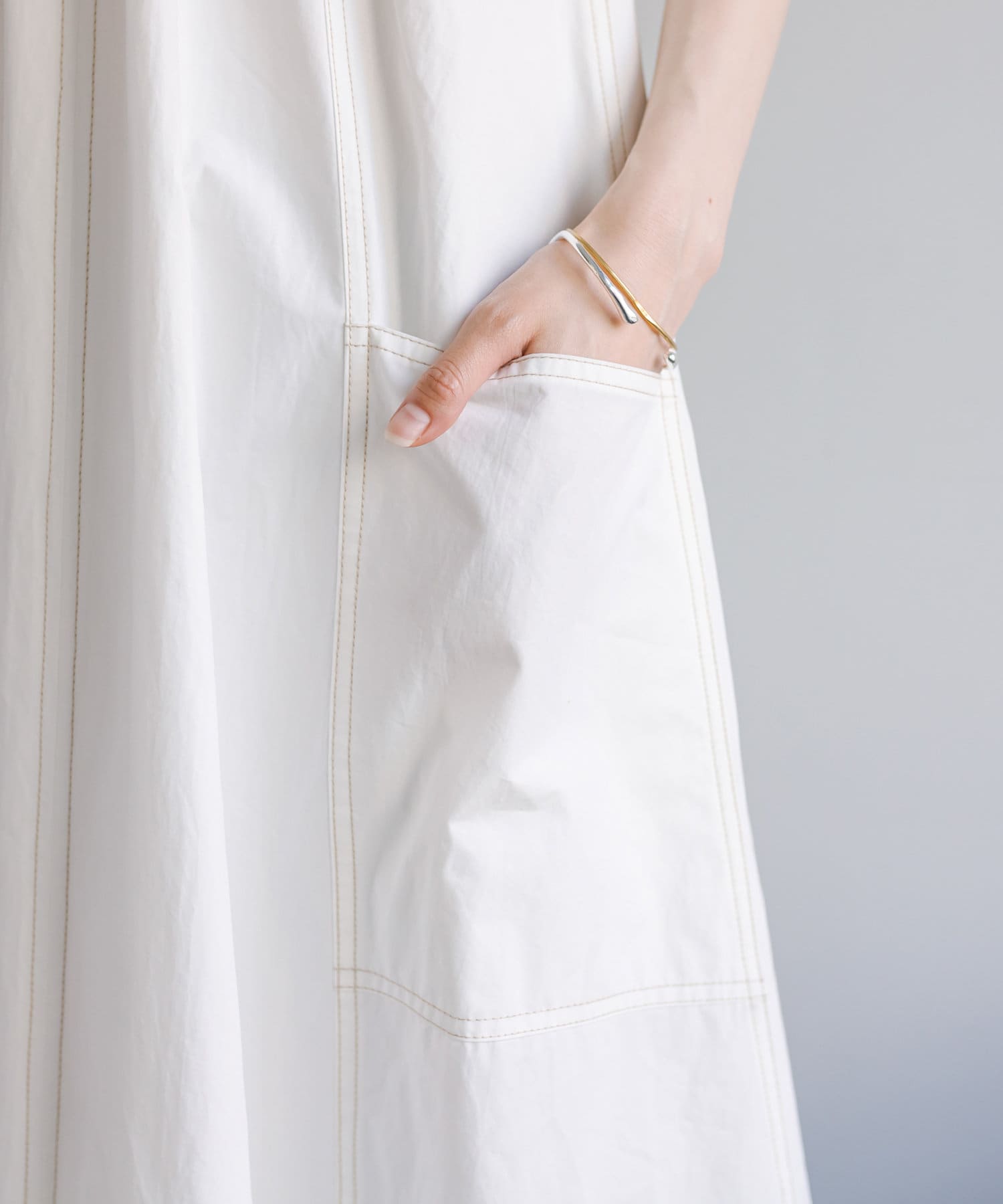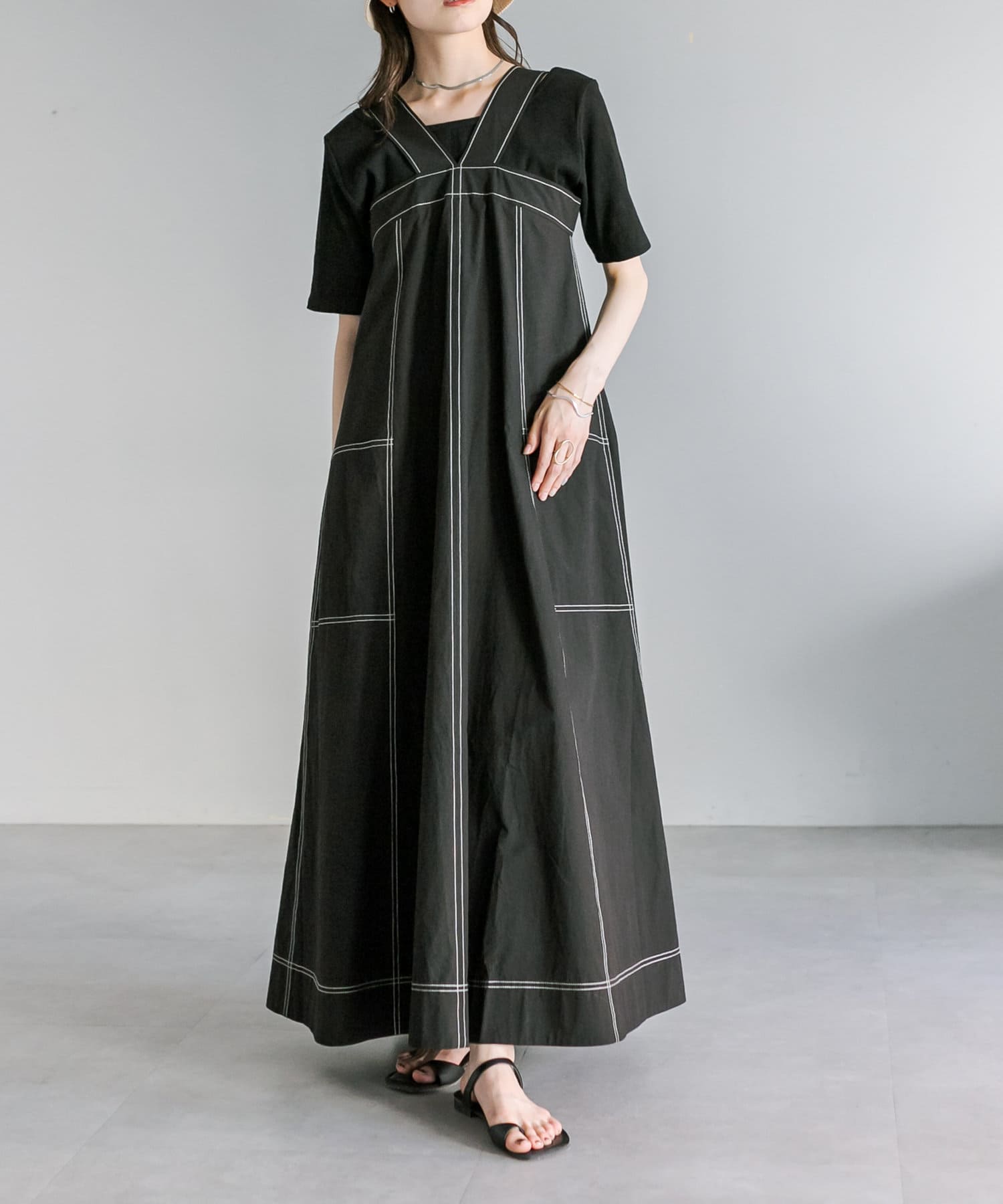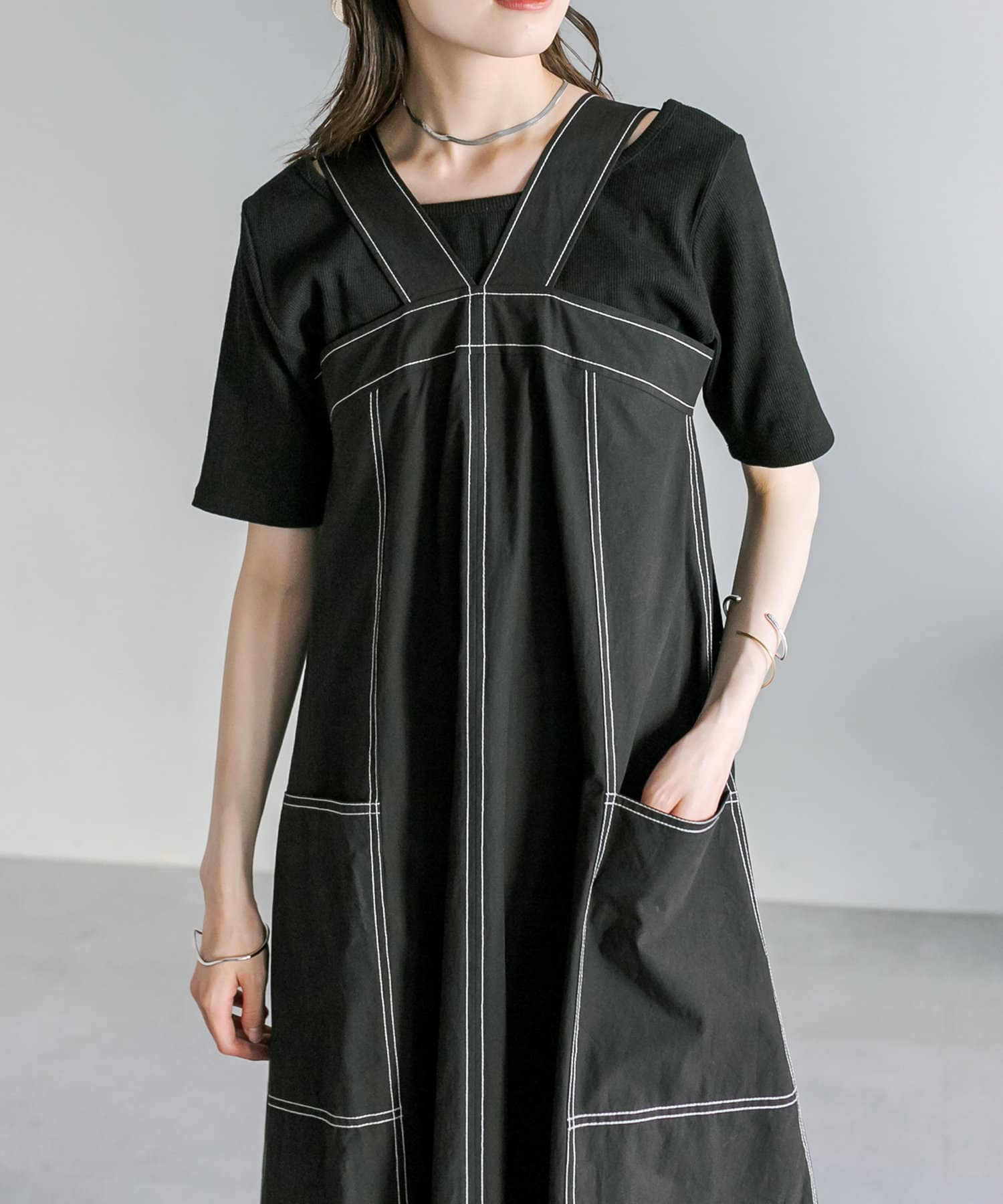 ・生地と異なるカラーのステッチがポイントのジャンパースカート。