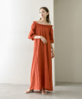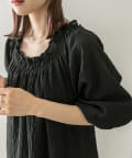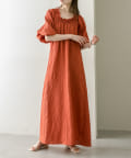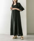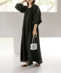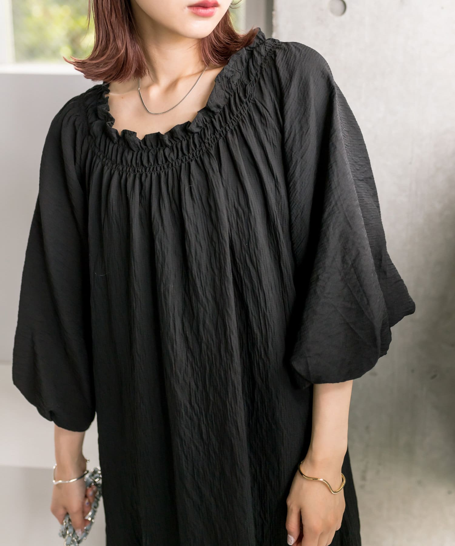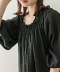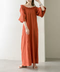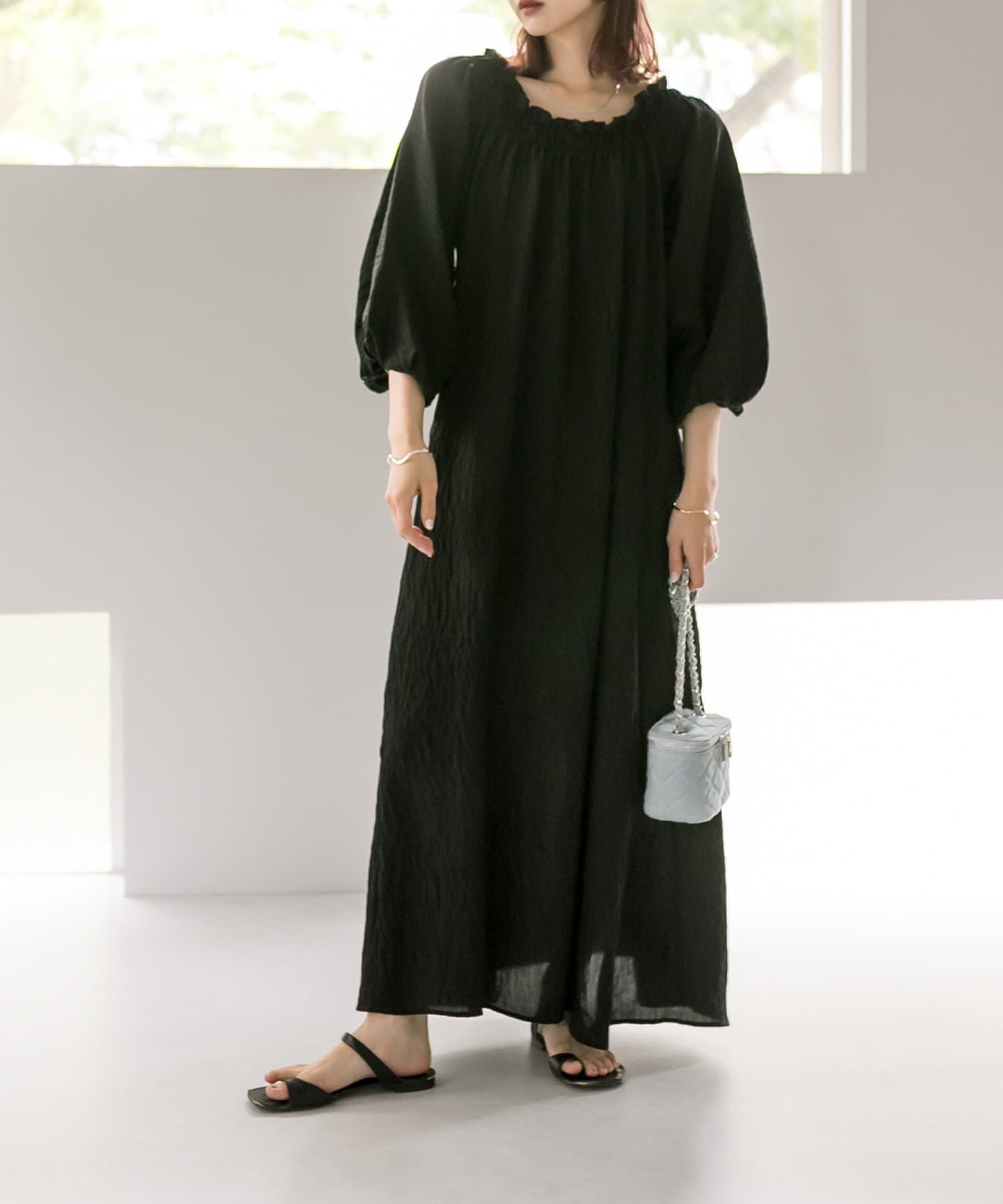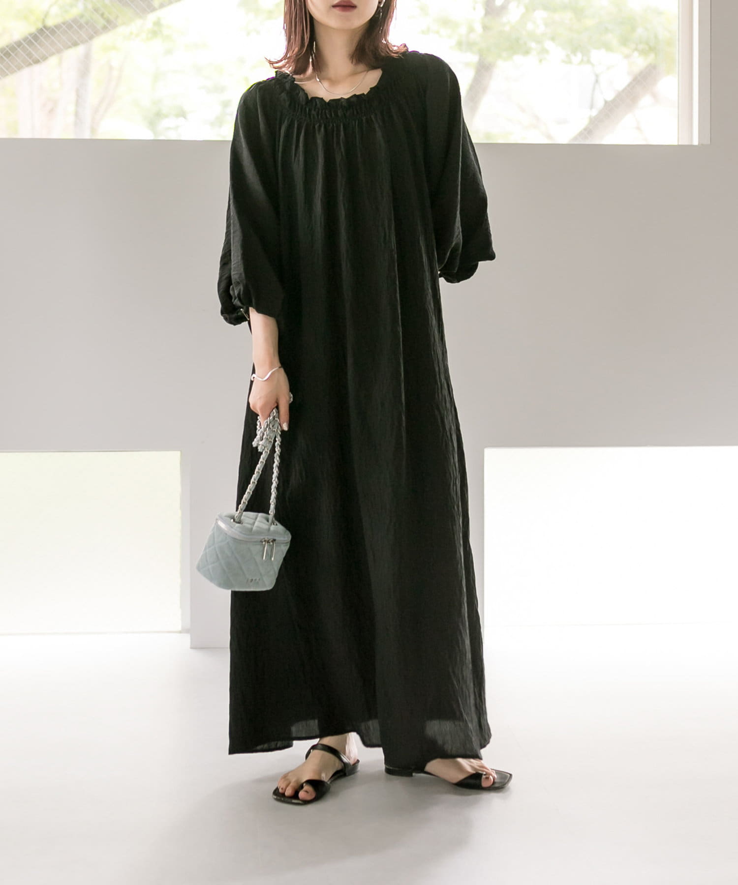・胸元にあるたっぷりのギャザーが目を惹くロングワンピース。