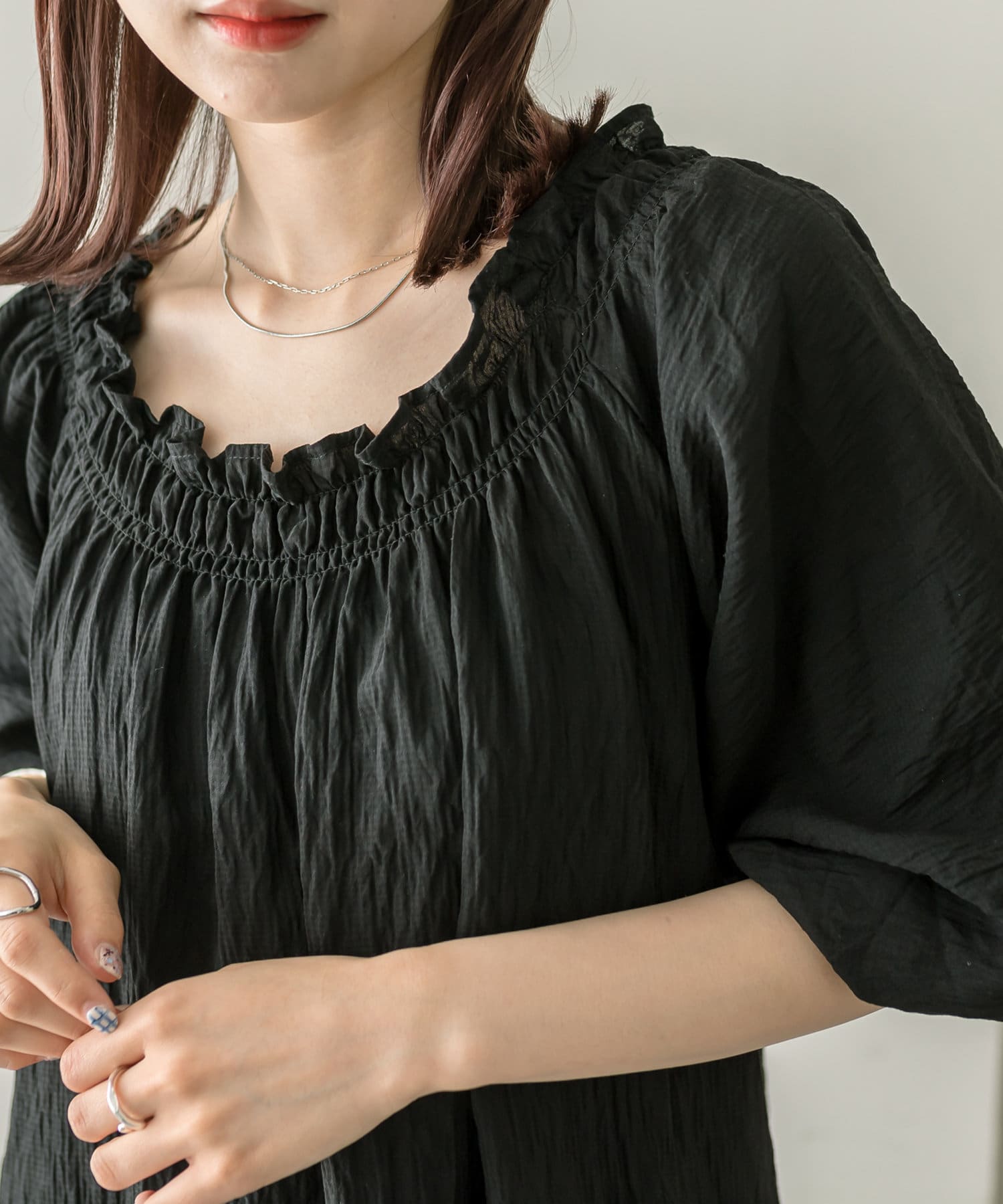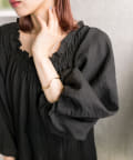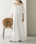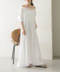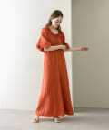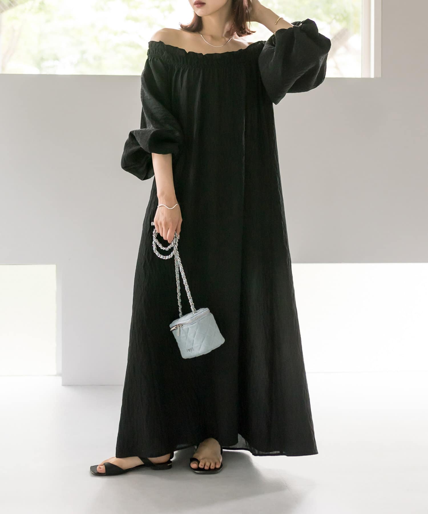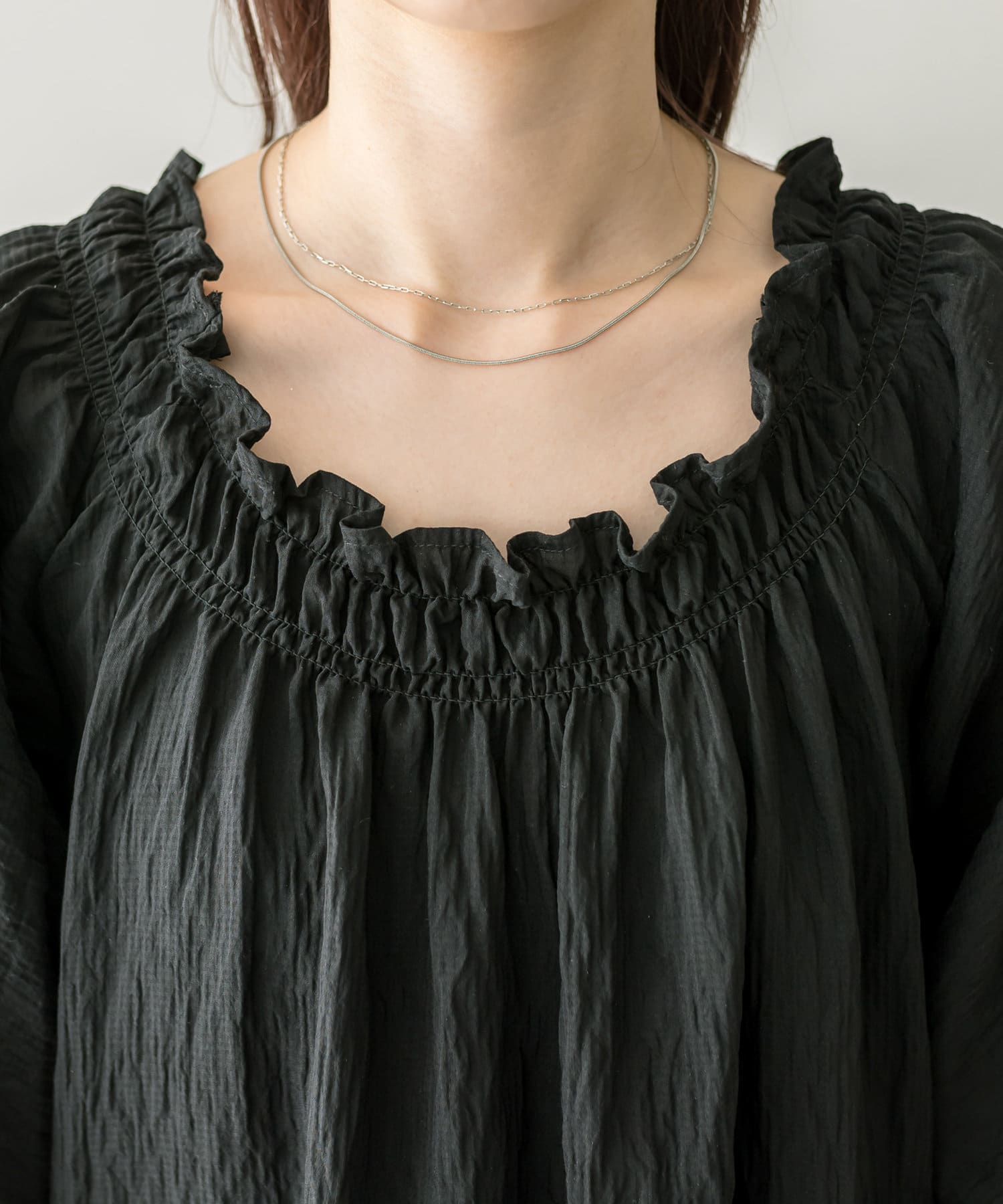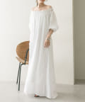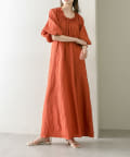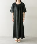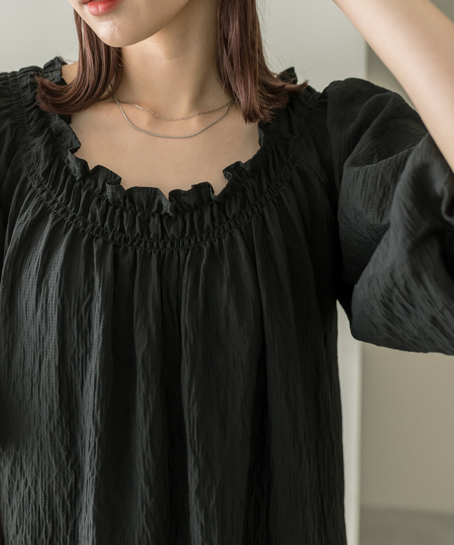 ・胸元にあるたっぷりのギャザーが目を惹くロングワンピース。
