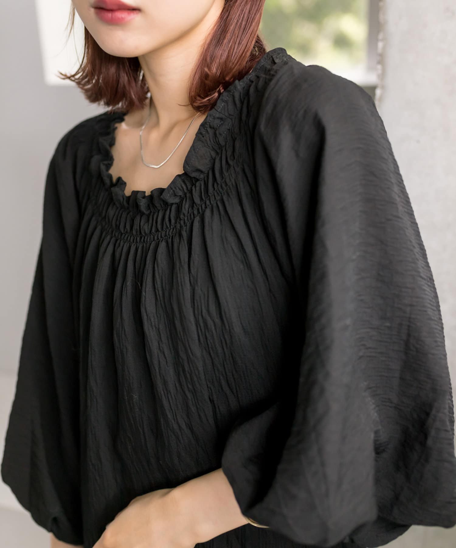 ・やや表面感のある生地感がボディラインを拾いすぎず、ボリュームのある袖が二の腕もカバーしてくれます。