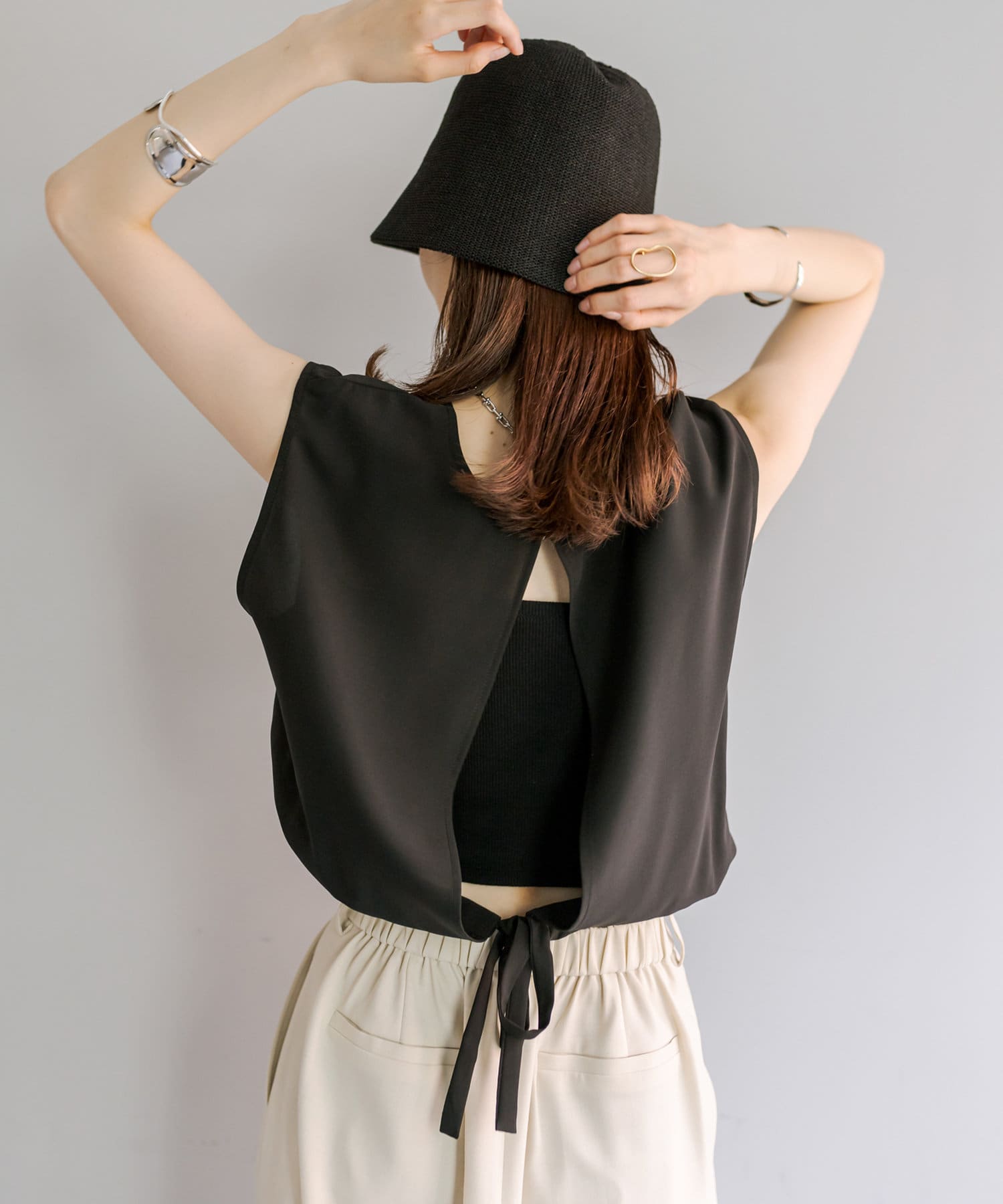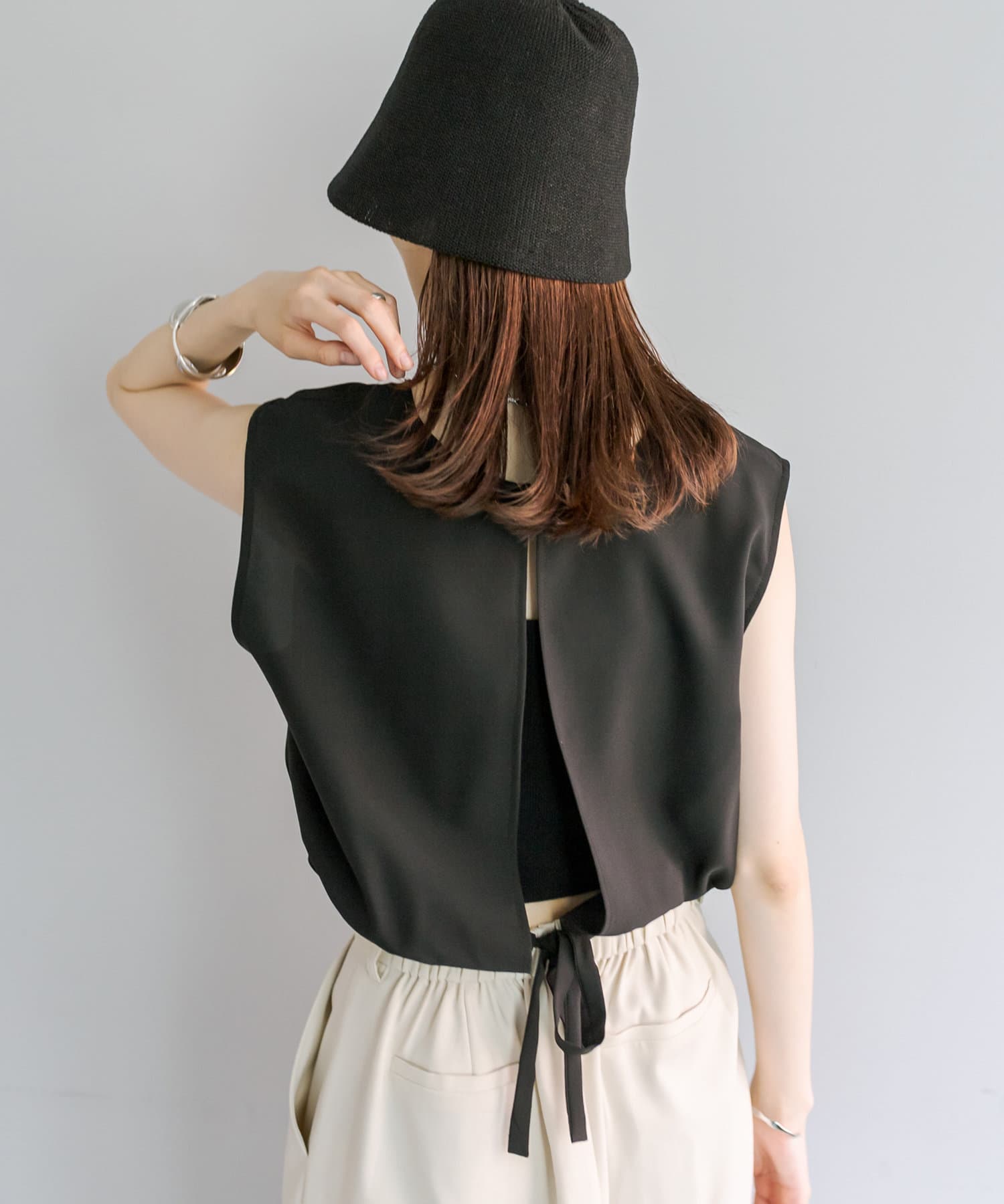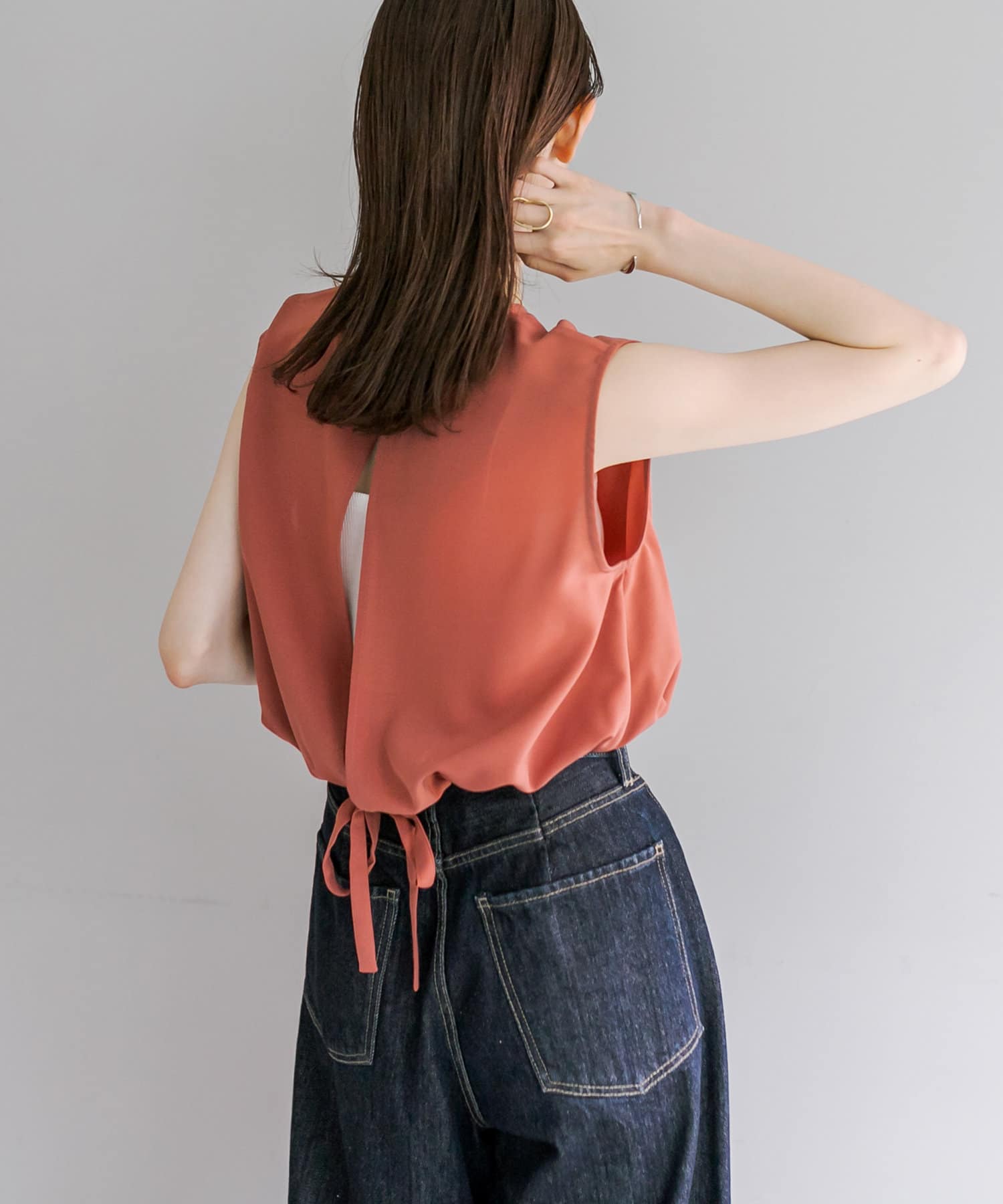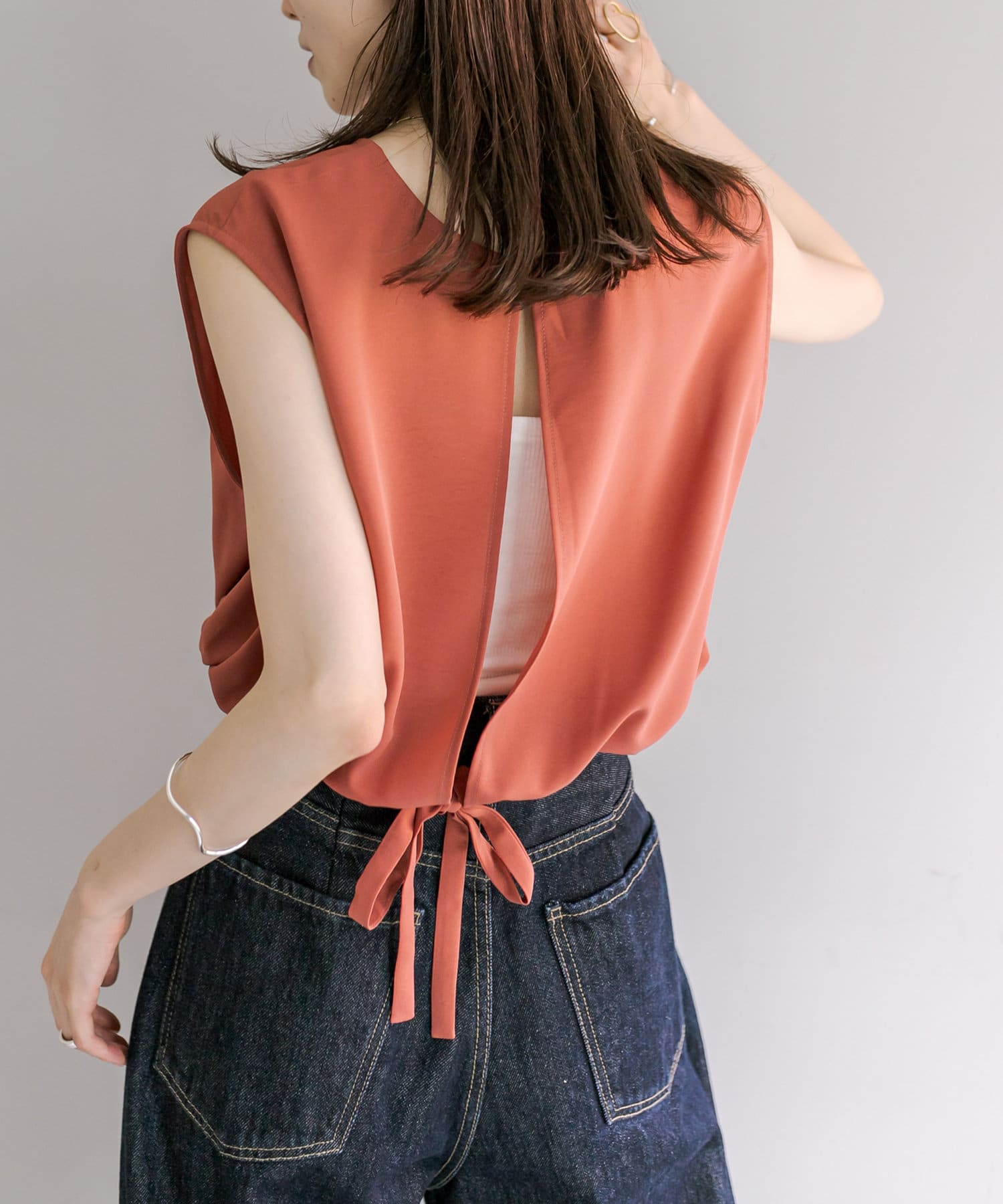 夏の定番ノースリーブとバックシャンデザインの爽やかブラウス。
