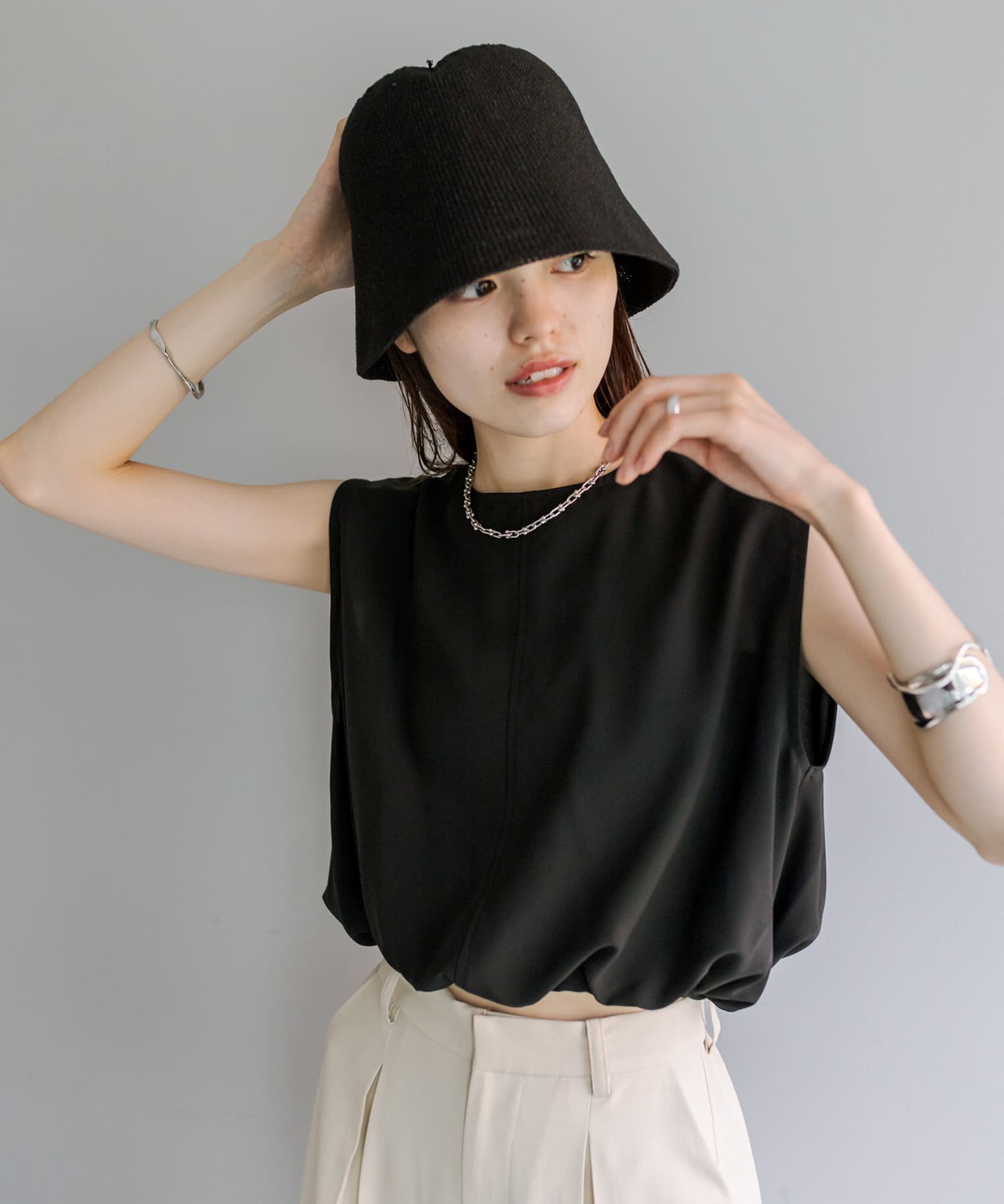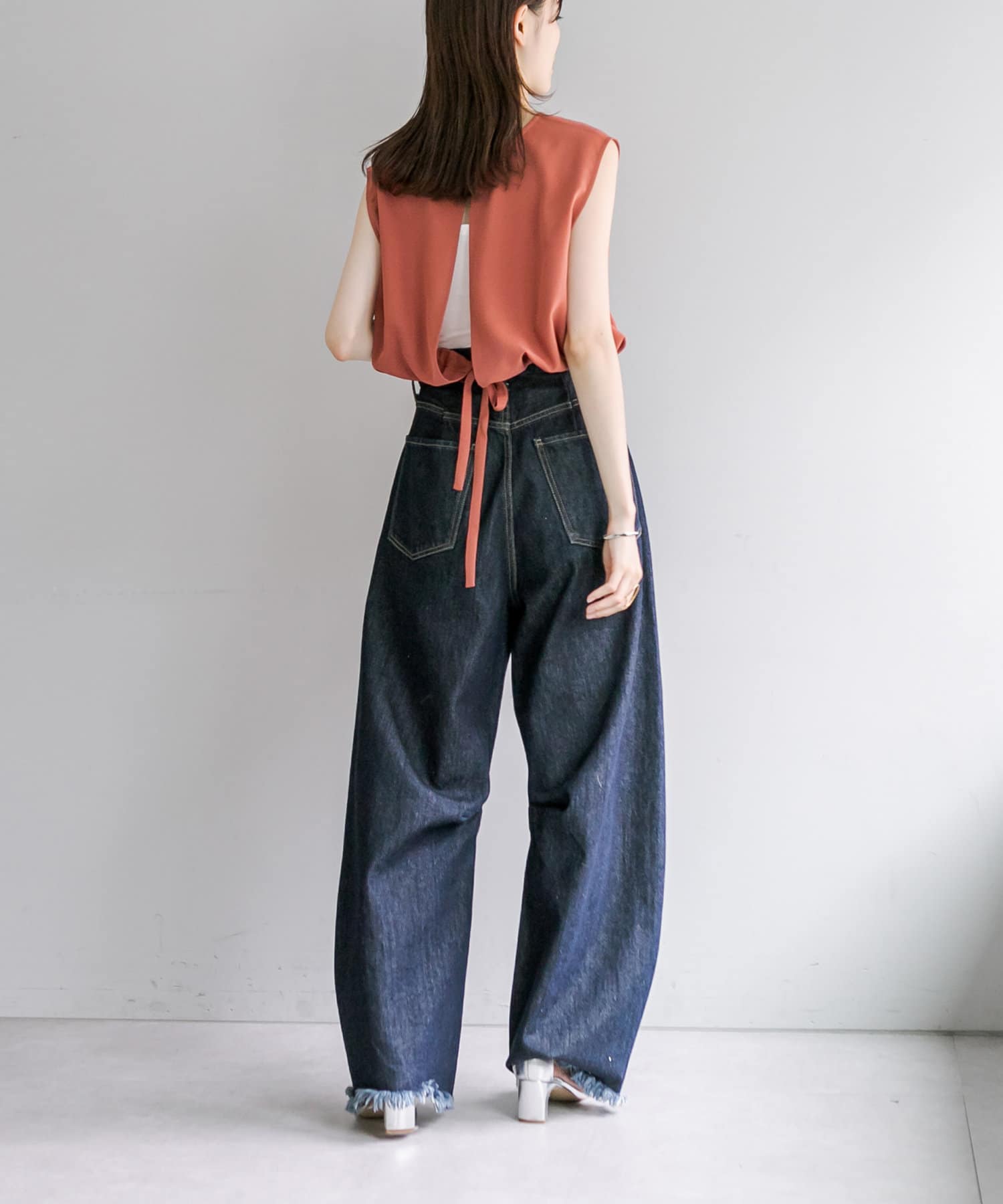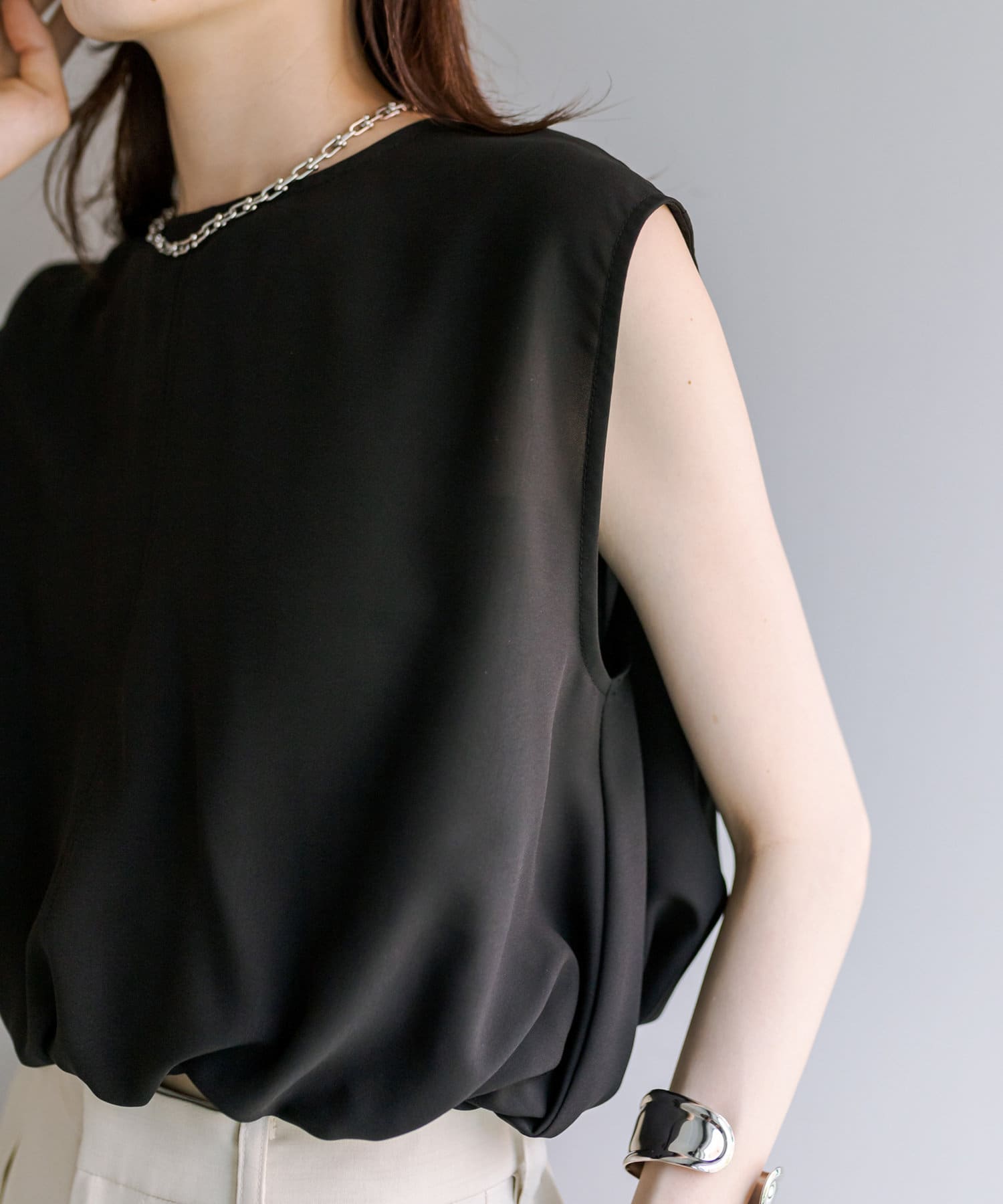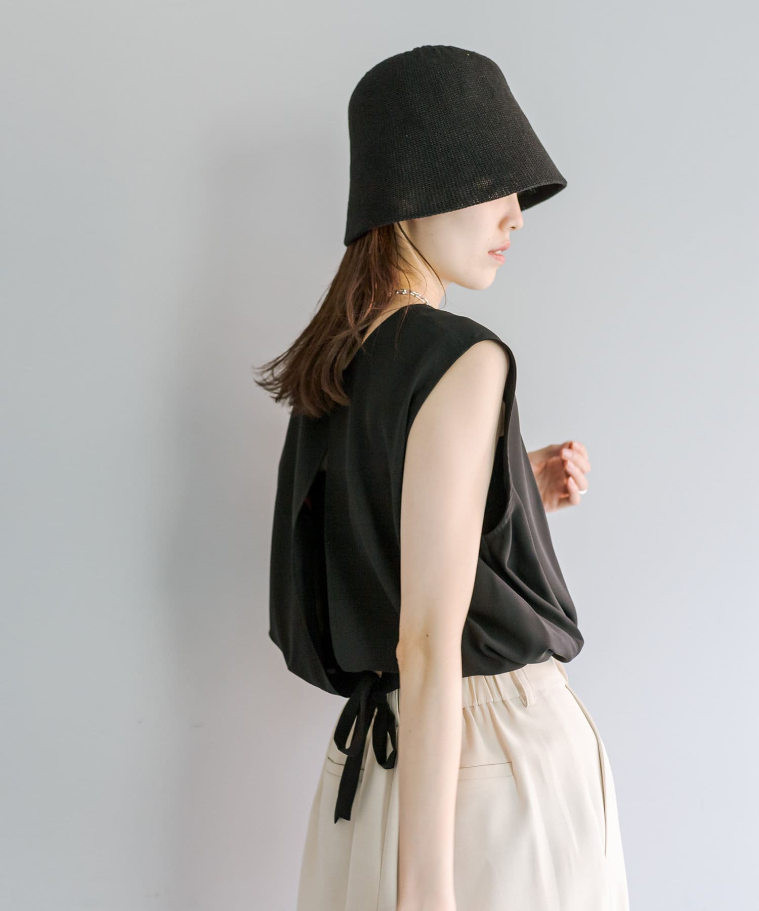 夏の定番ノースリーブとバックシャンデザインの爽やかブラウス。