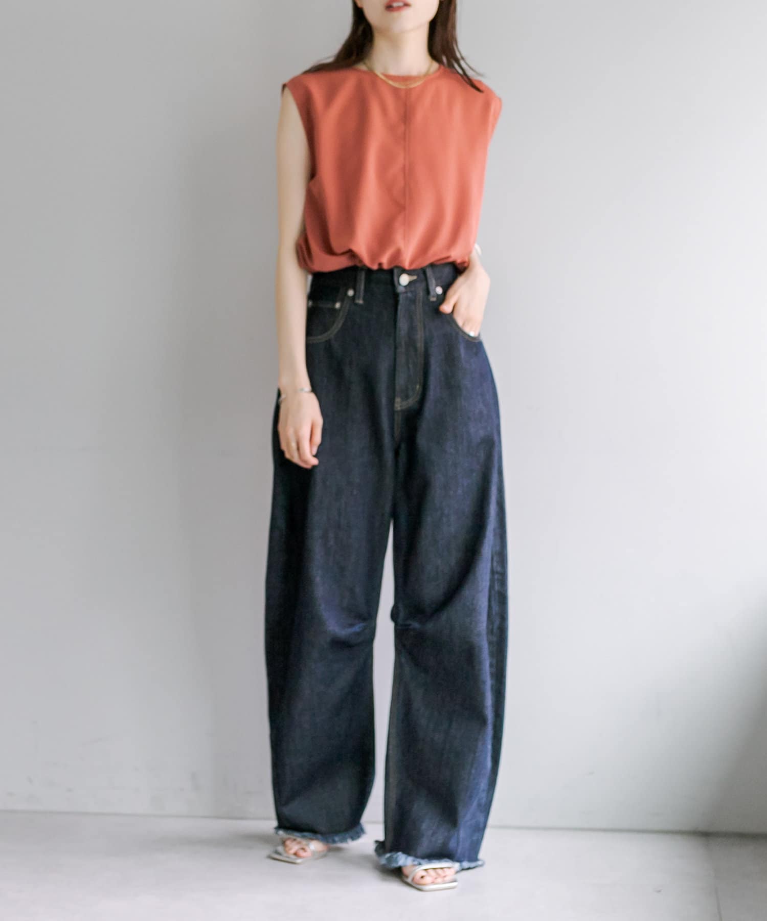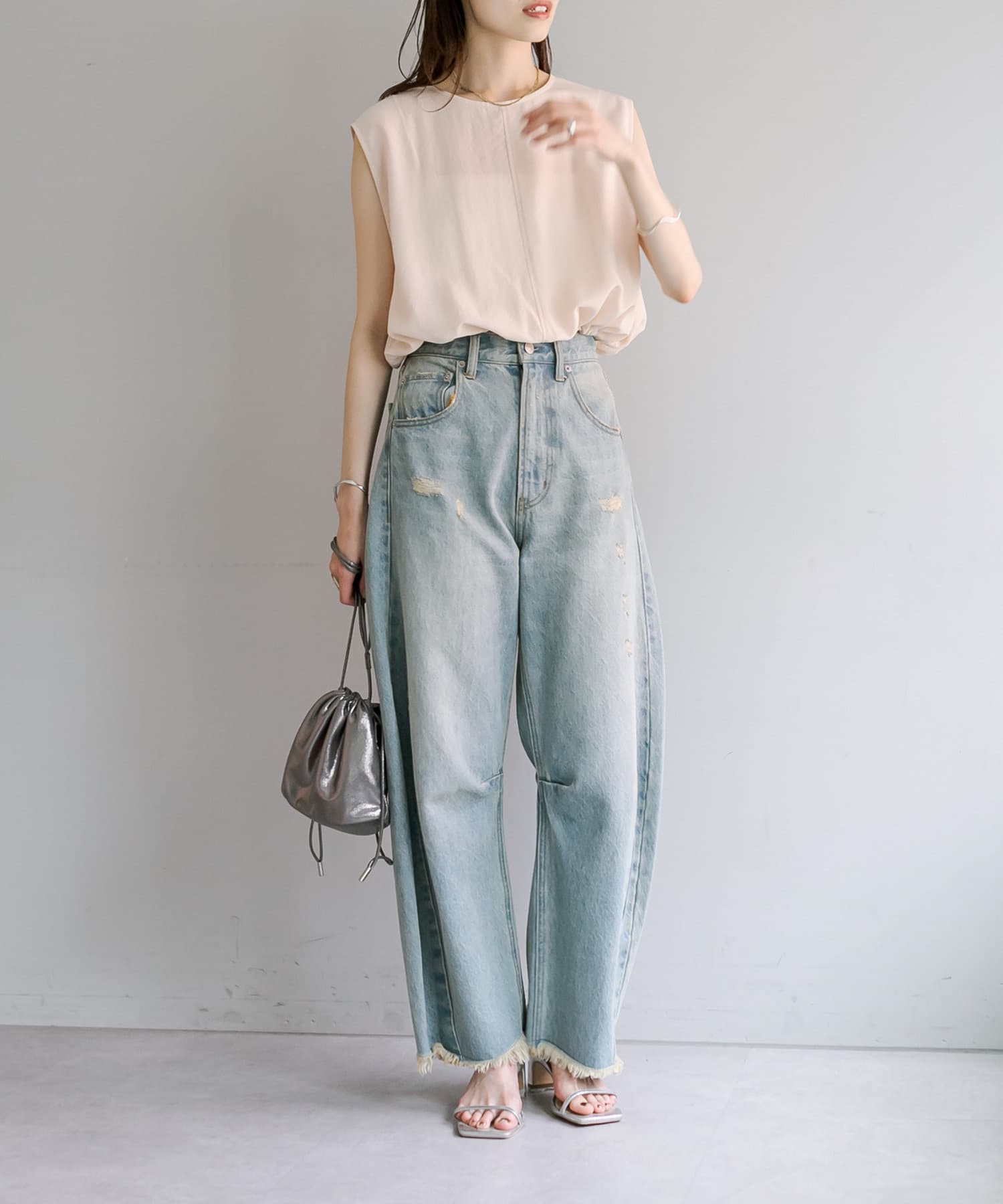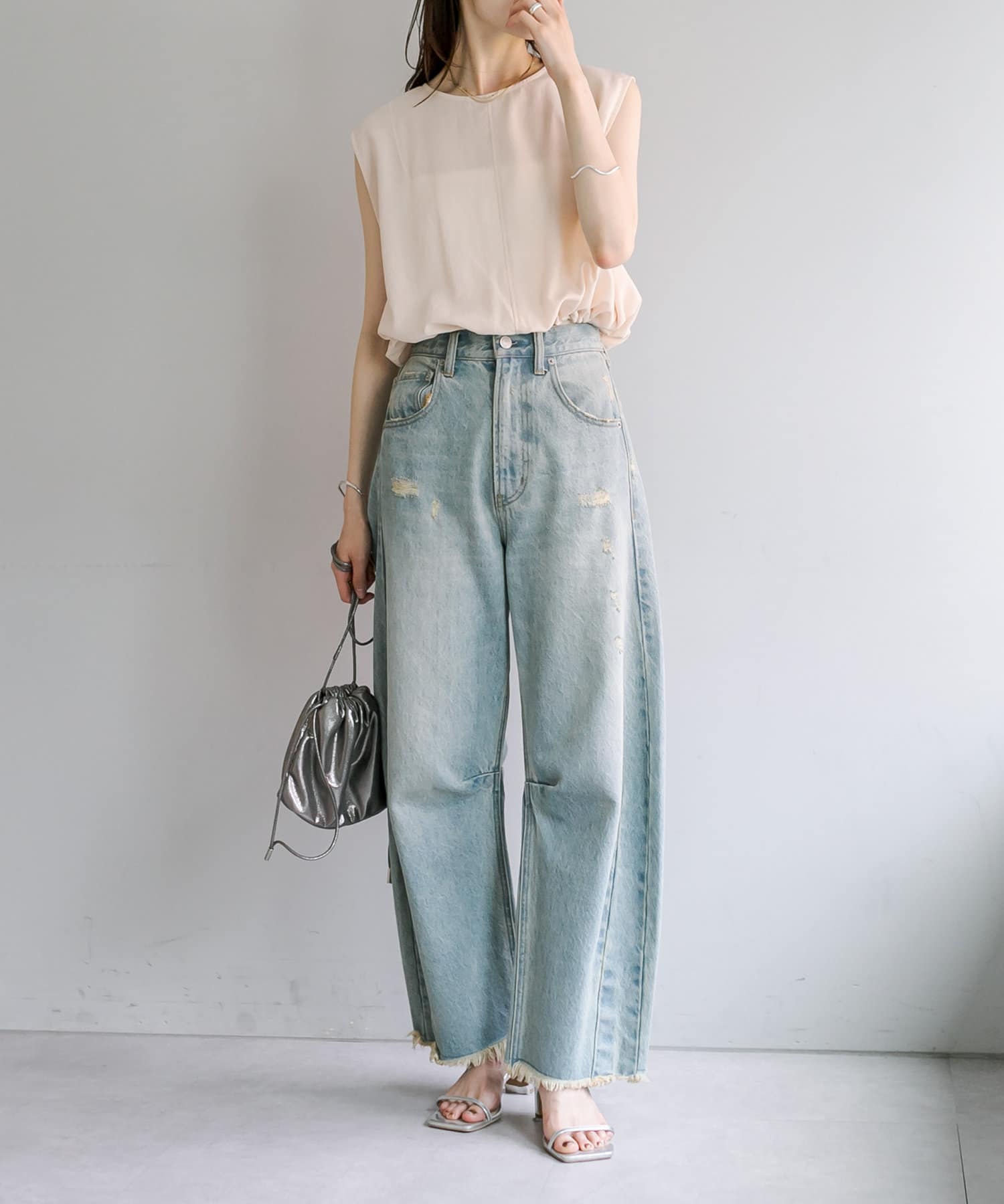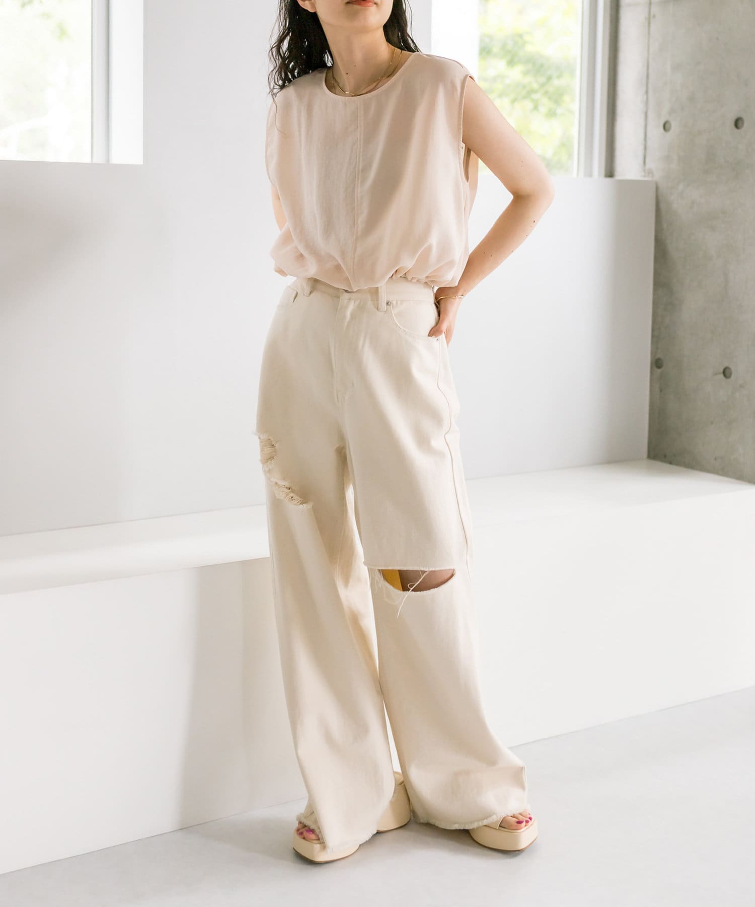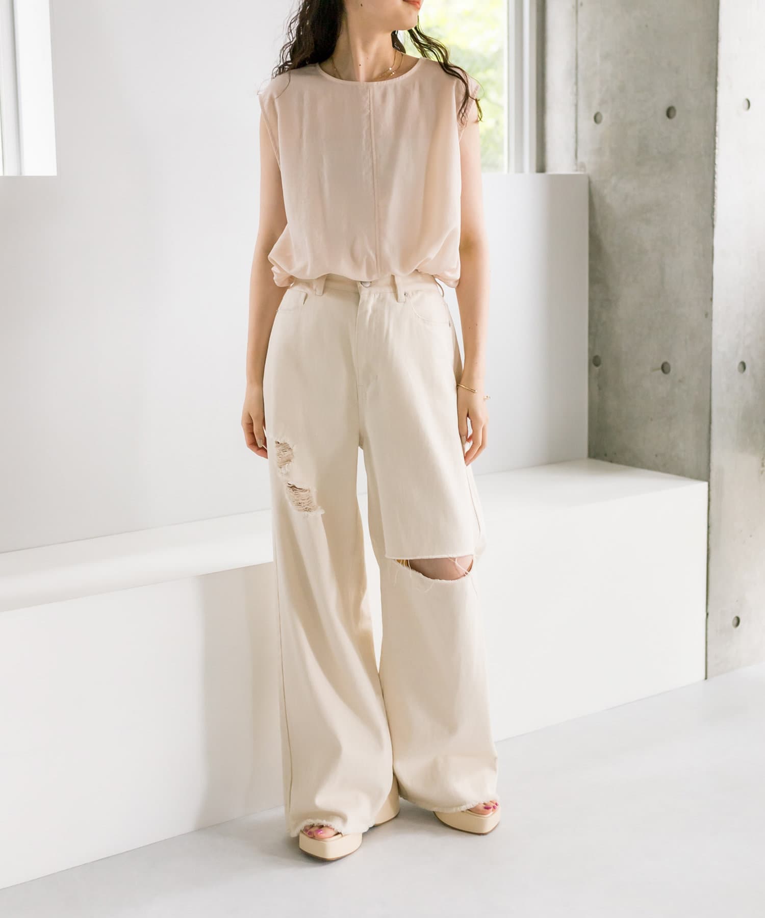 夏の定番ノースリーブとバックシャンデザインの爽やかブラウス。