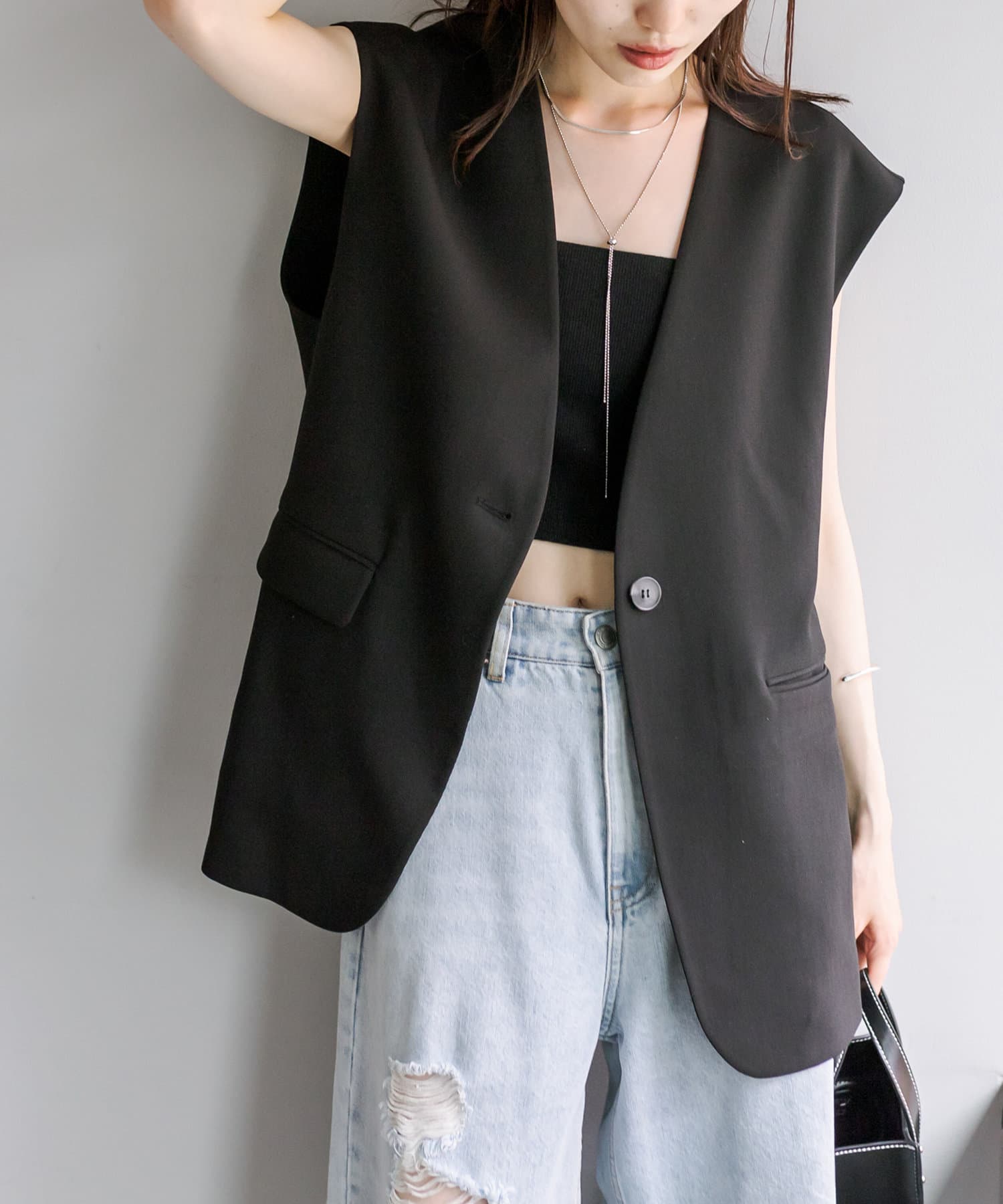・リネン素材がかっちりしすぎない印象に見せてくれるジレ。