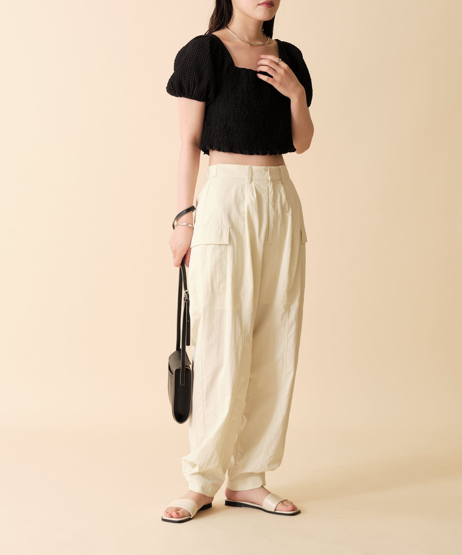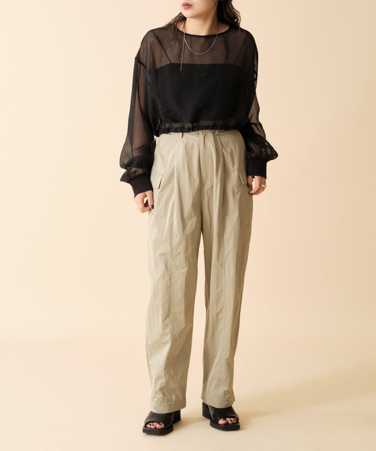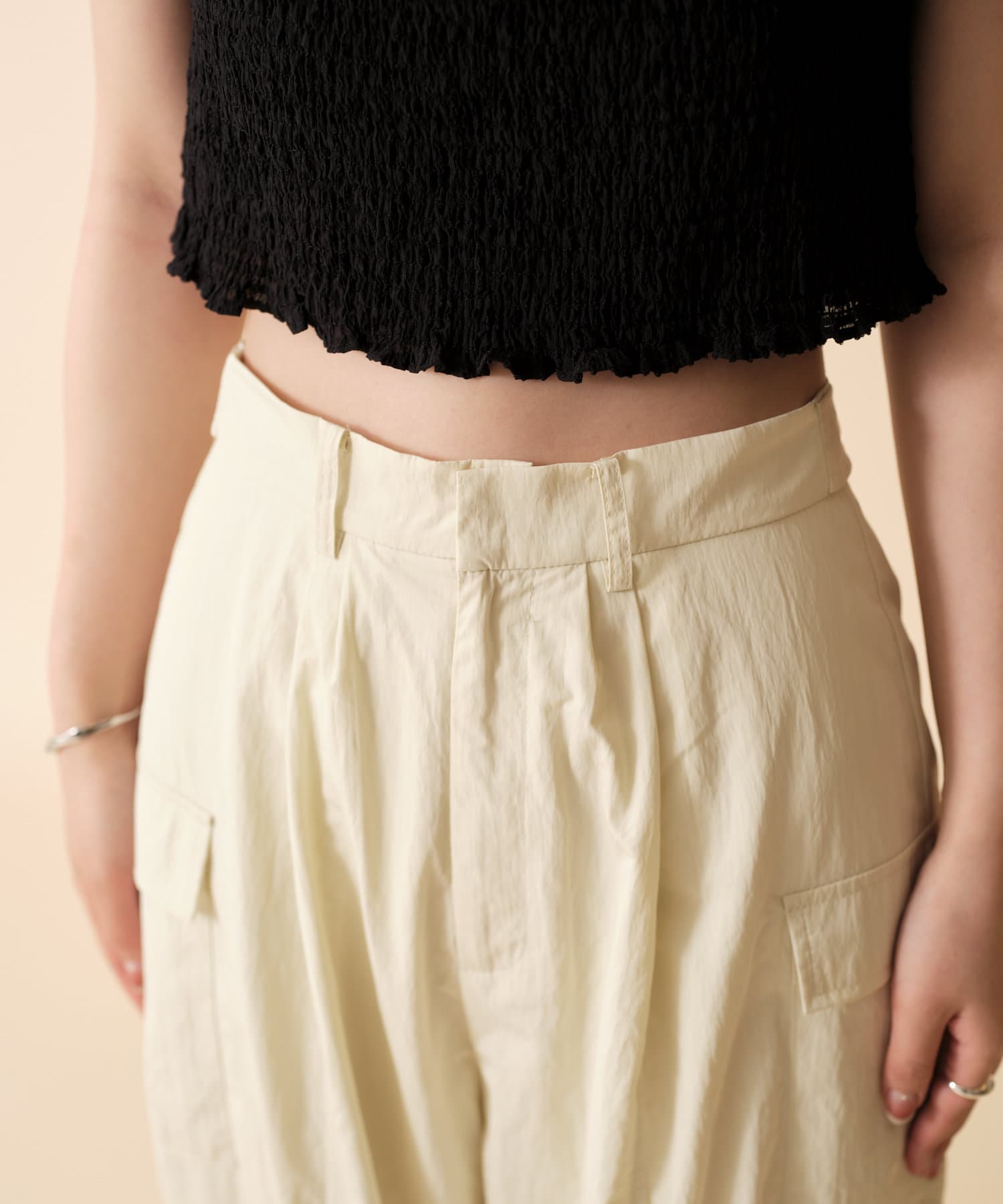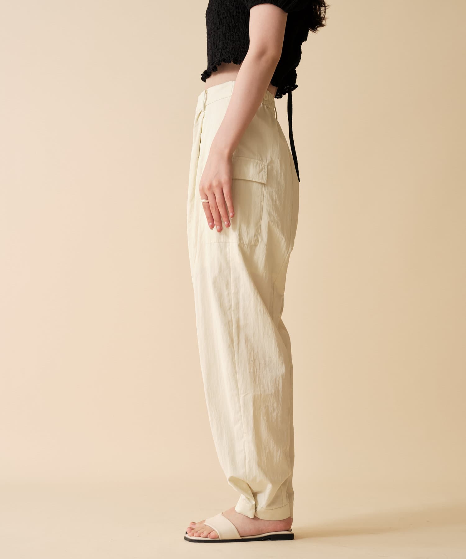 ・つや感のある生地を使用したきれいめ見えのカーゴパンツが登場。