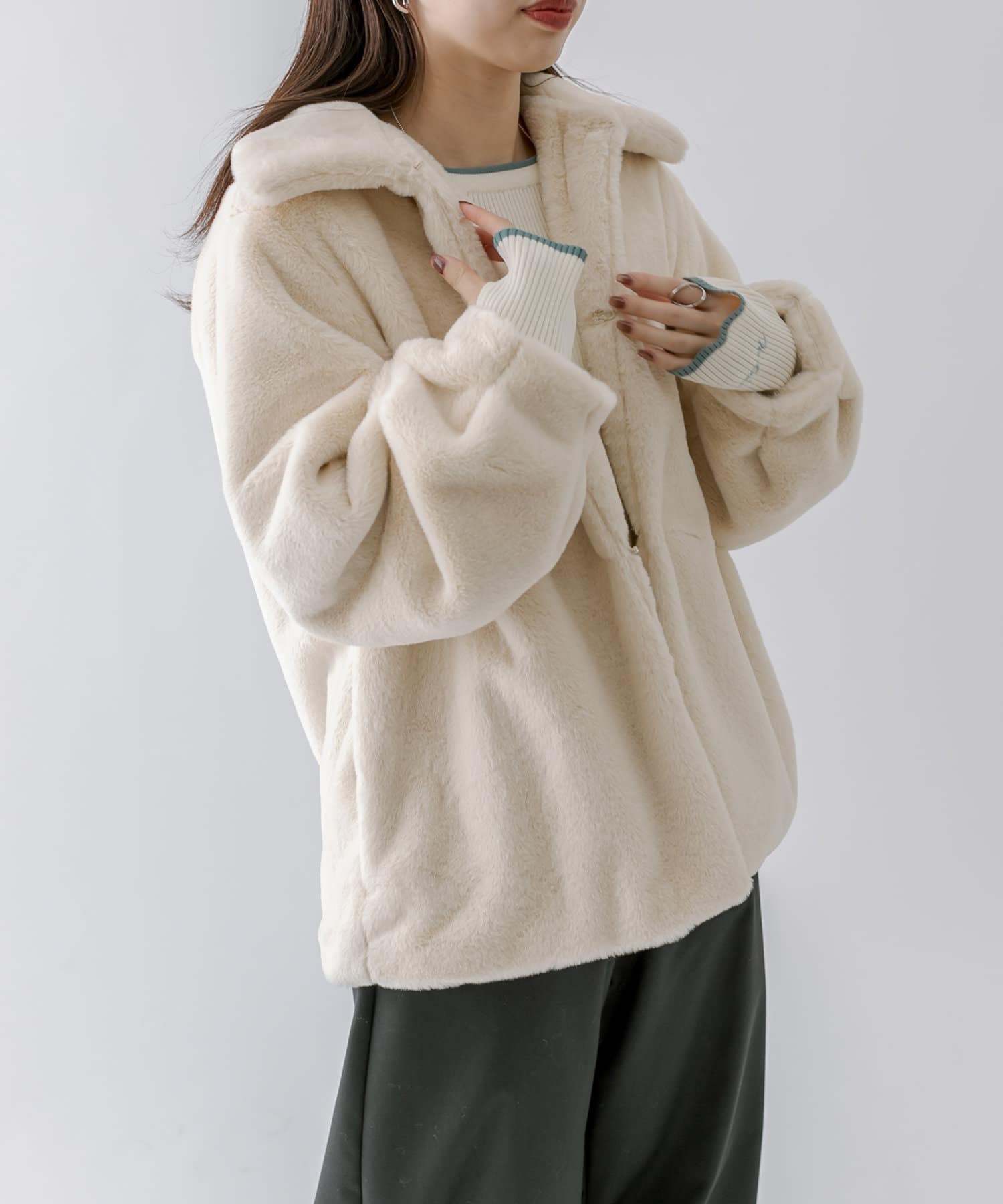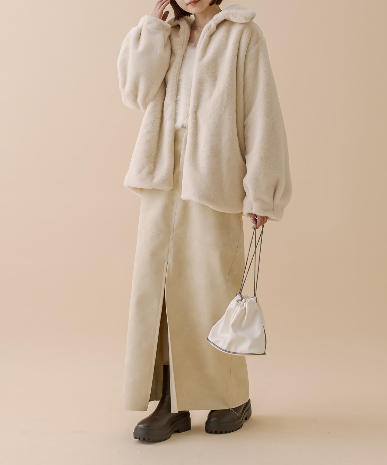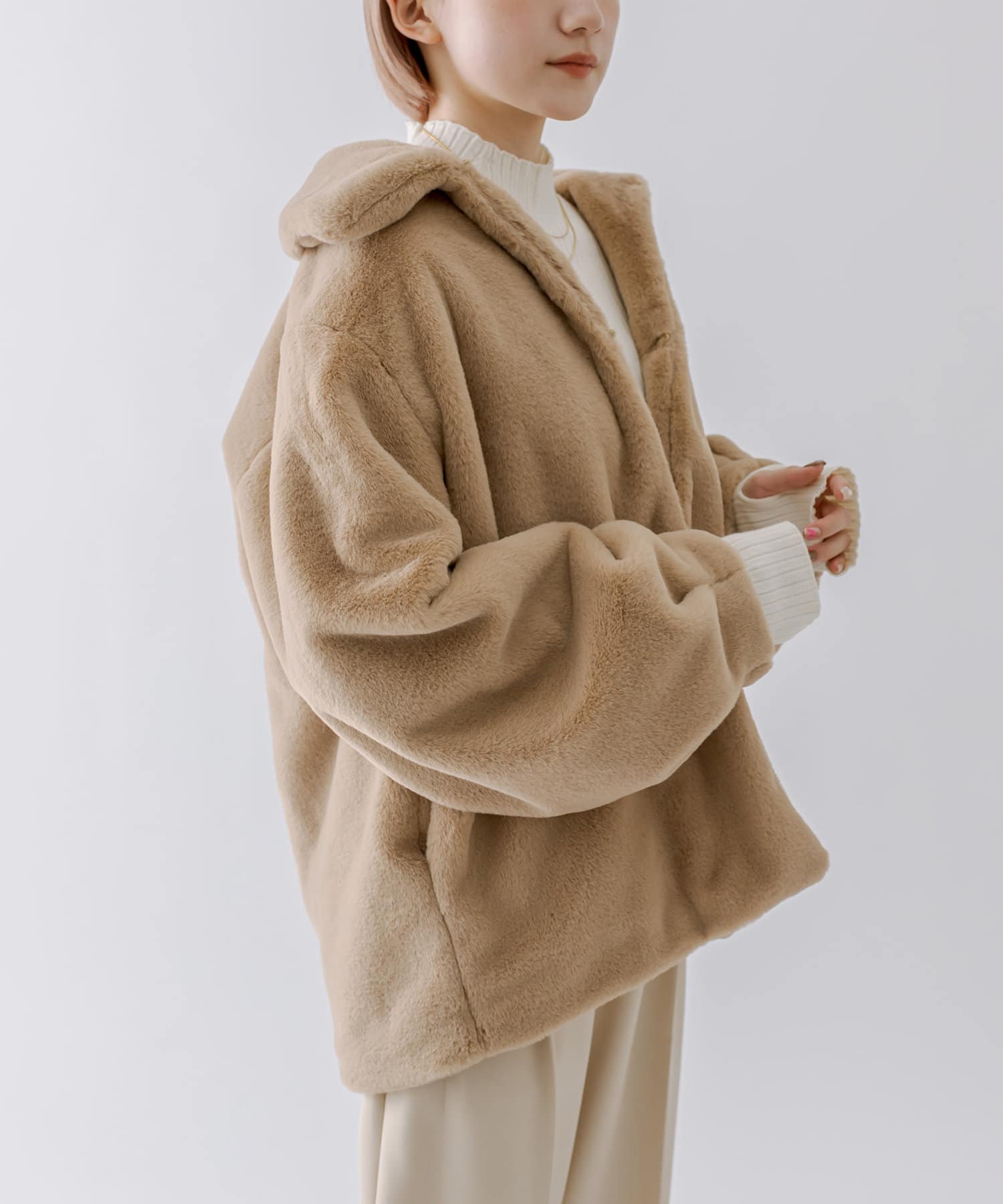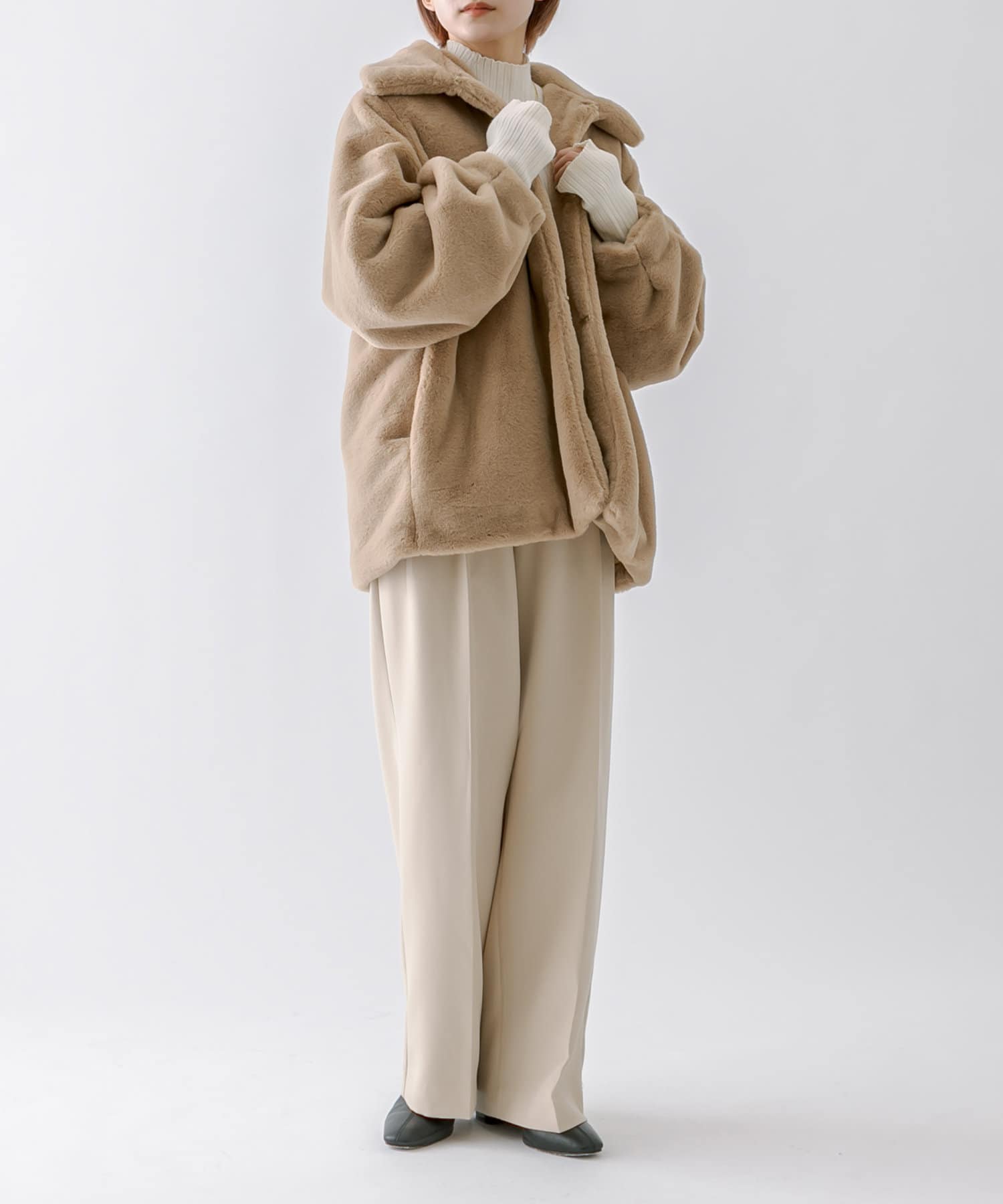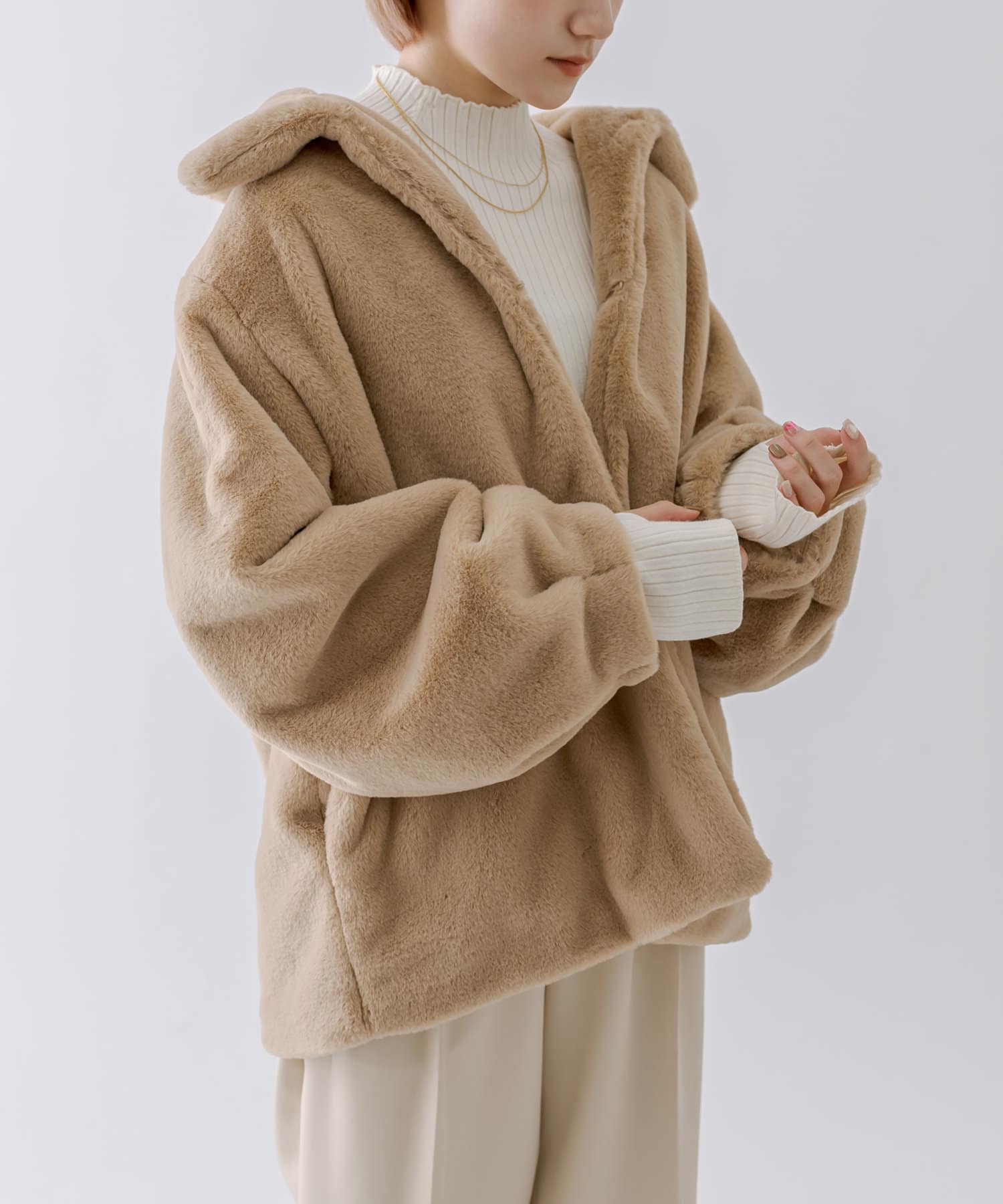 ・シンプルなコーデにも羽織るだけで決まるボリューム感。