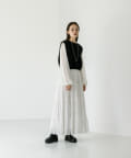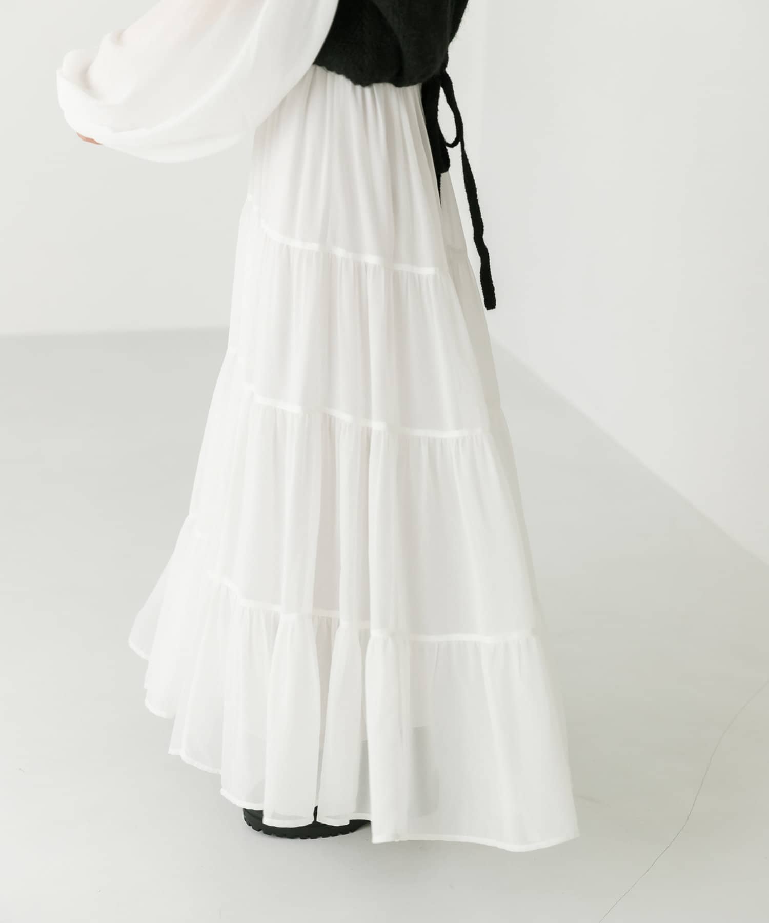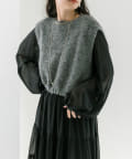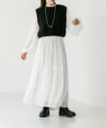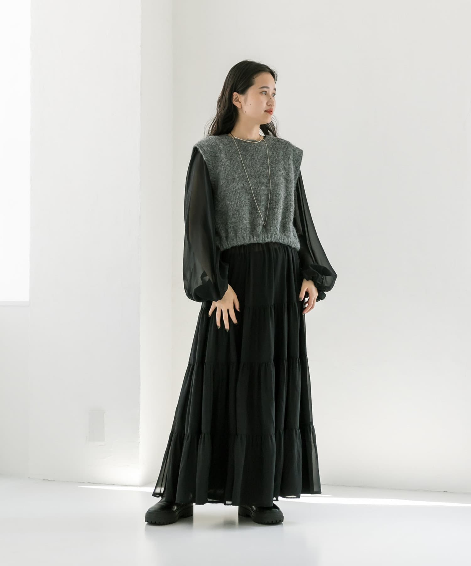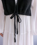 ・女性らしいティアードデザインのワンピ―スとニットベストのセットアイテム。