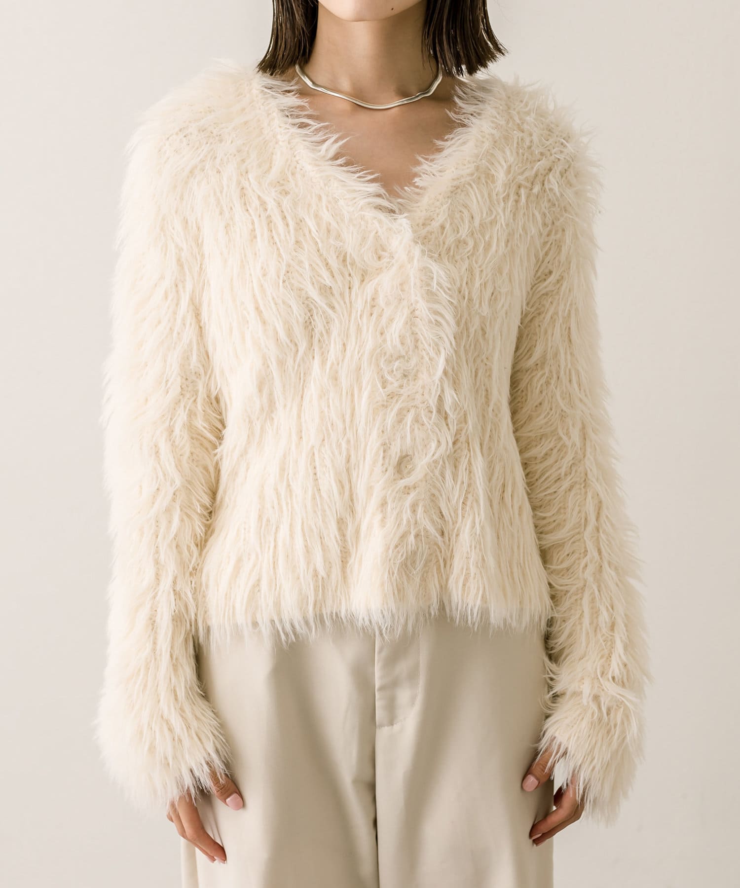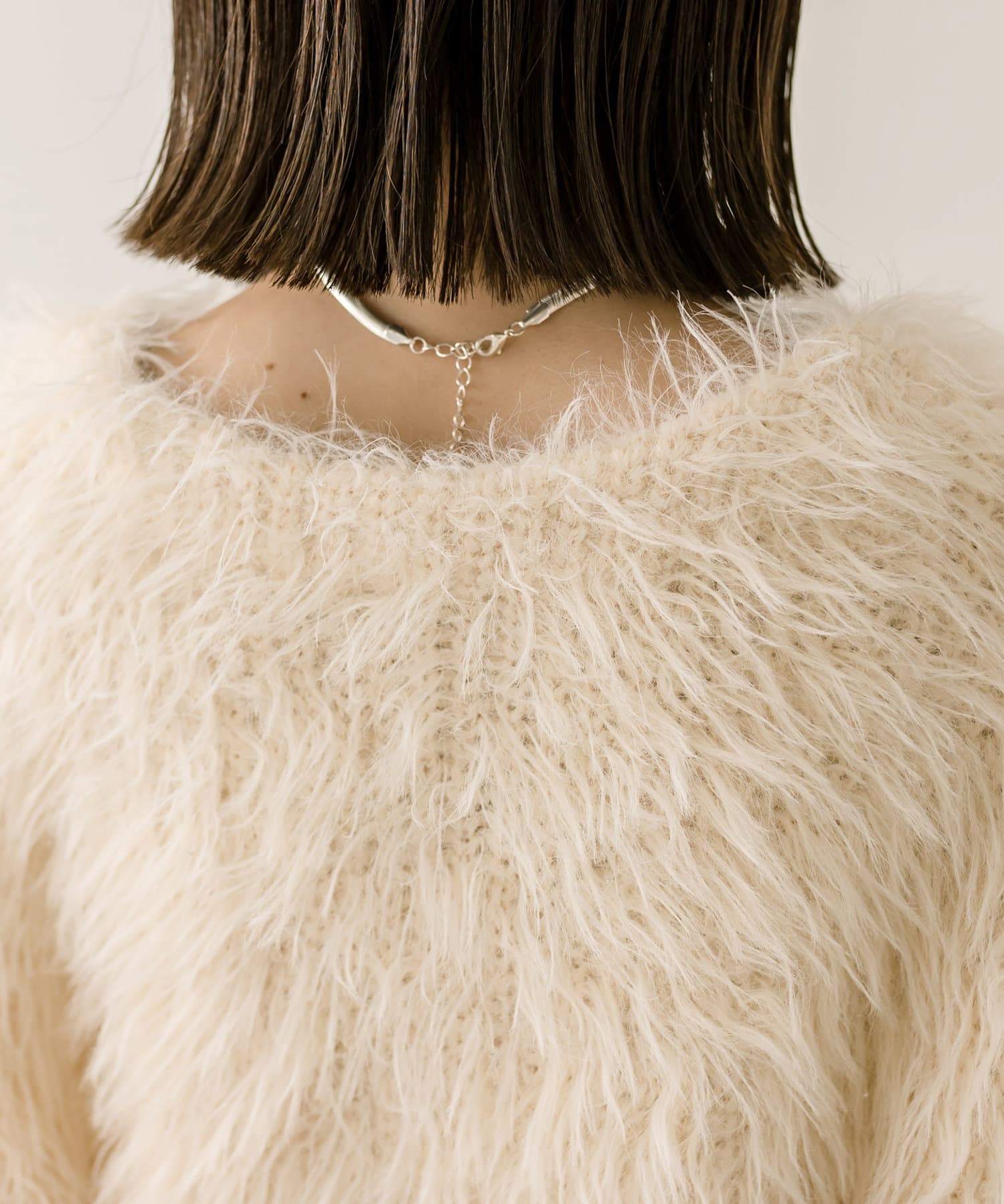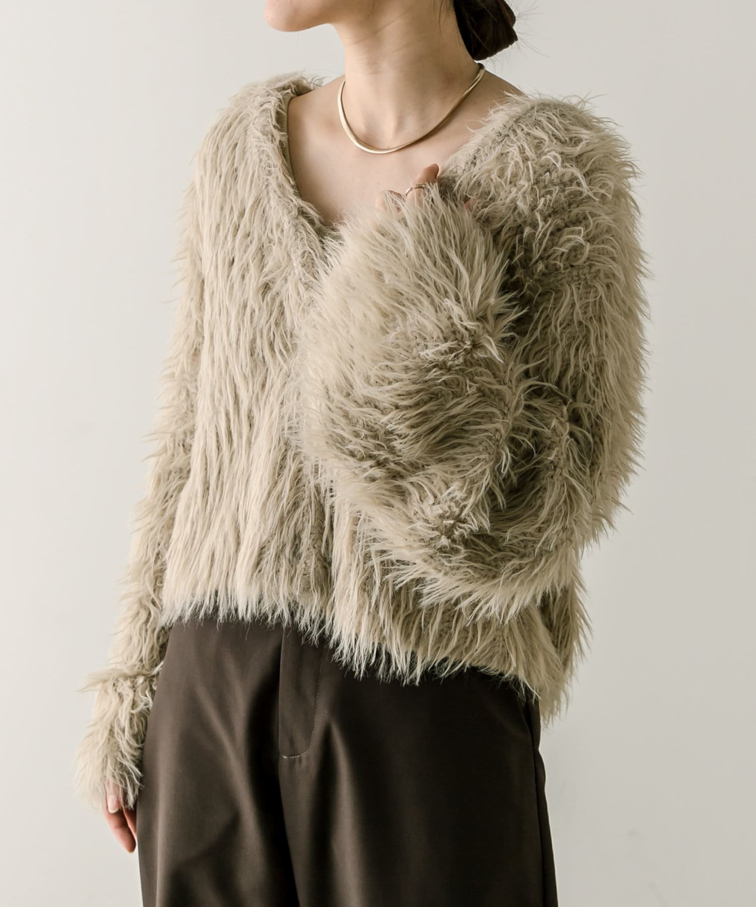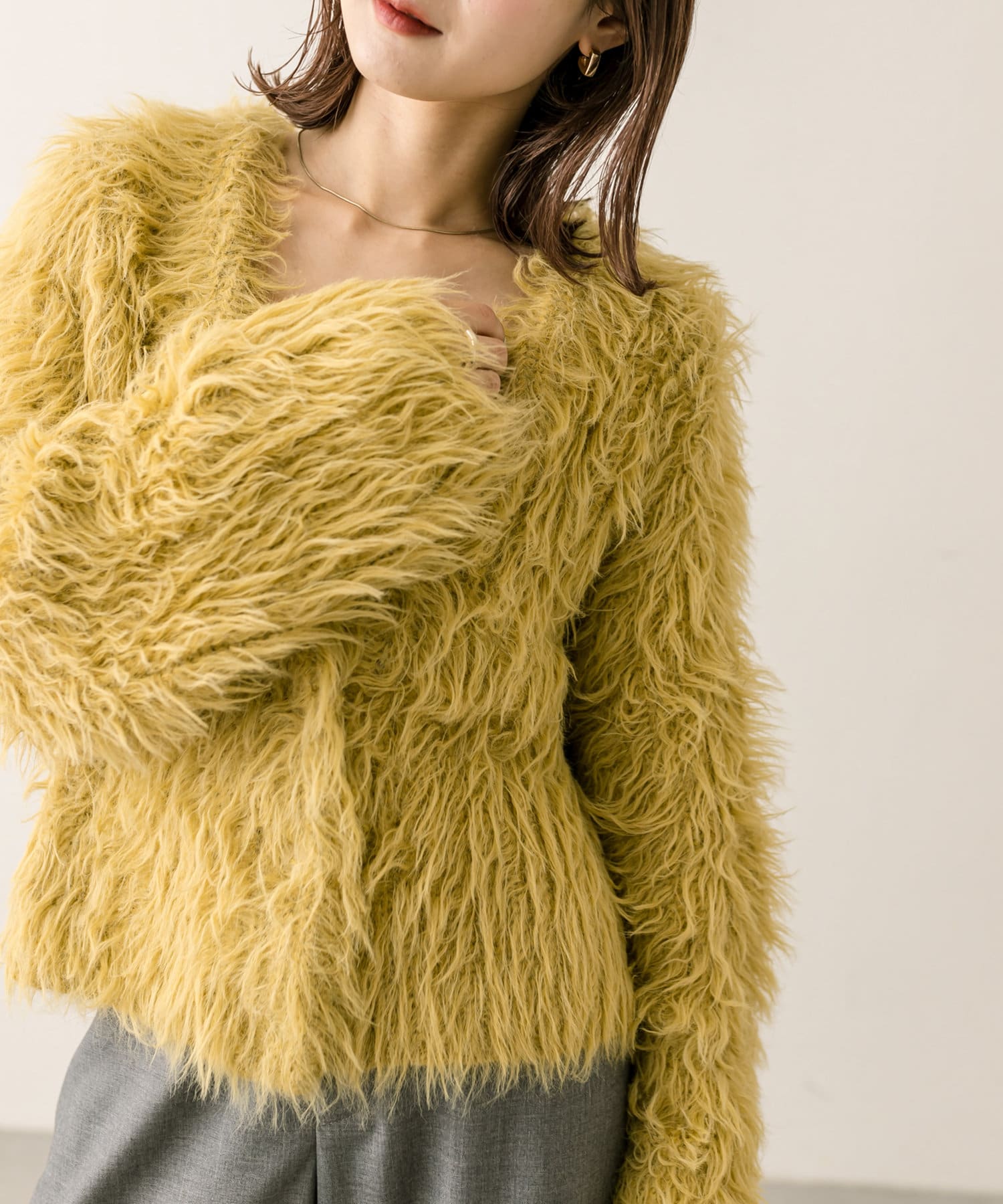 ・毛足が長くボリューム感がありながら、Vネックなので首回りはすっきり。