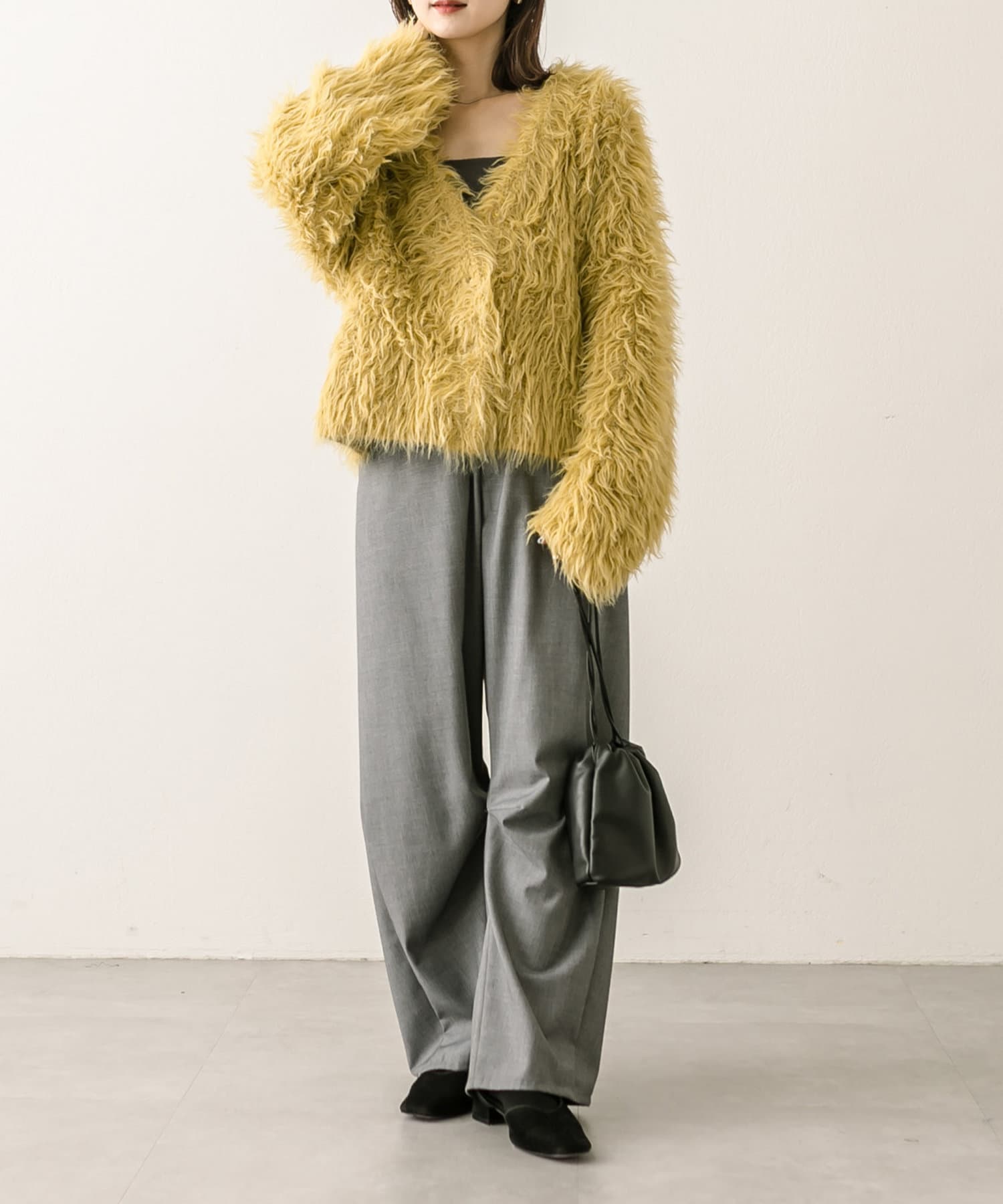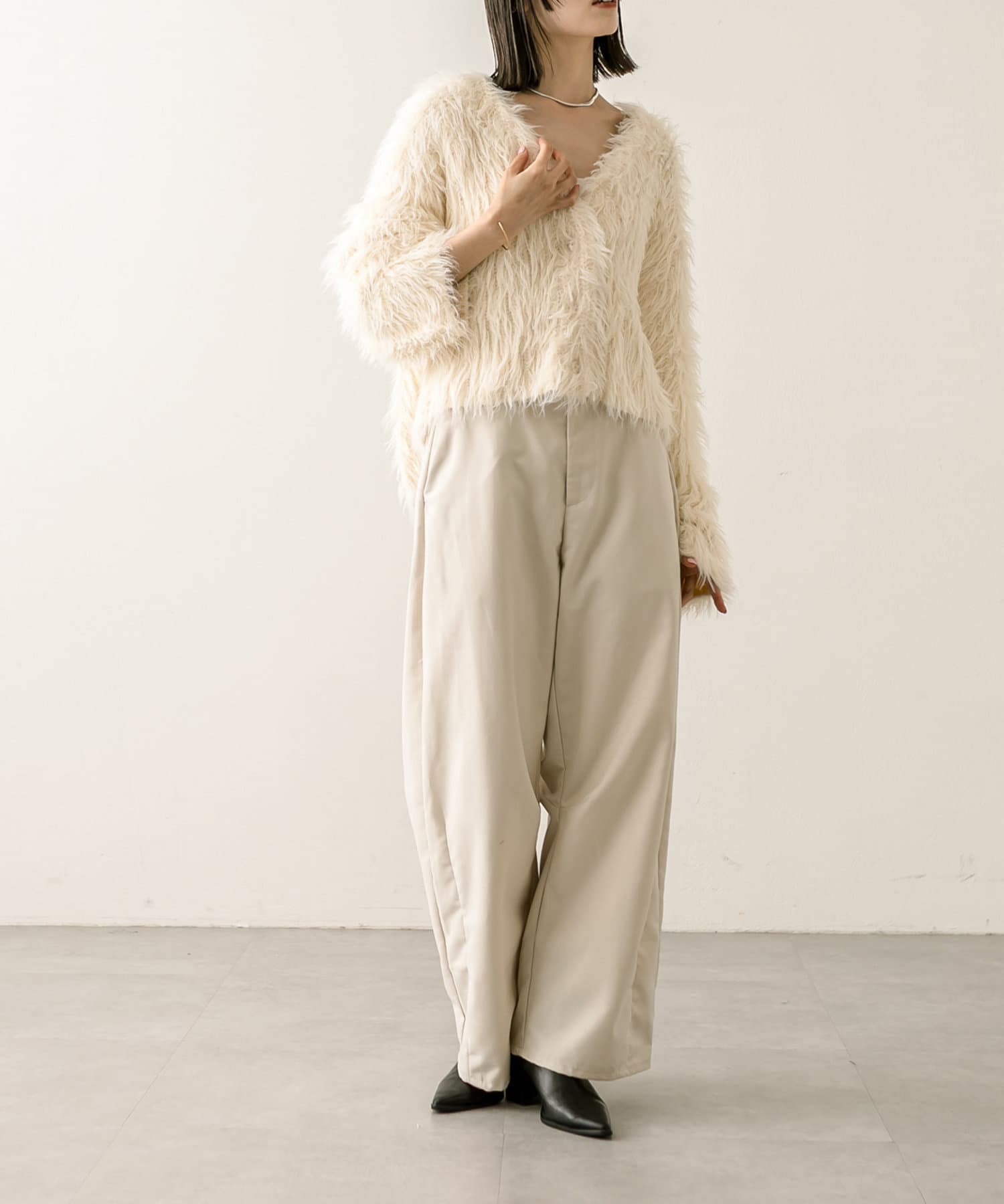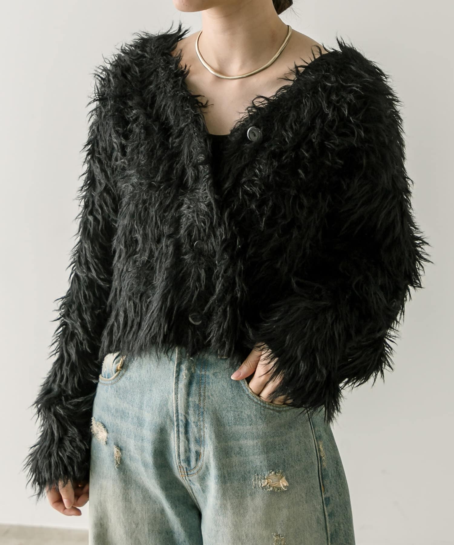 ・毛足が長くボリューム感がありながら、Vネックなので首回りはすっきり。