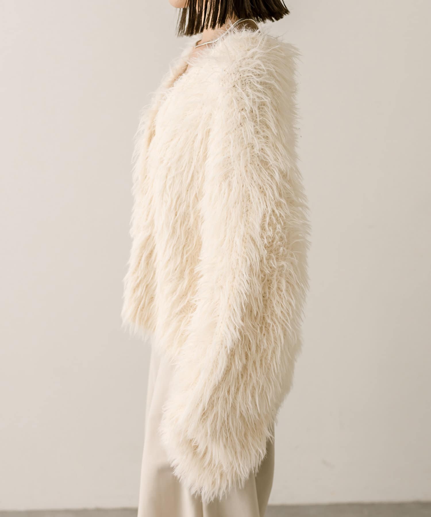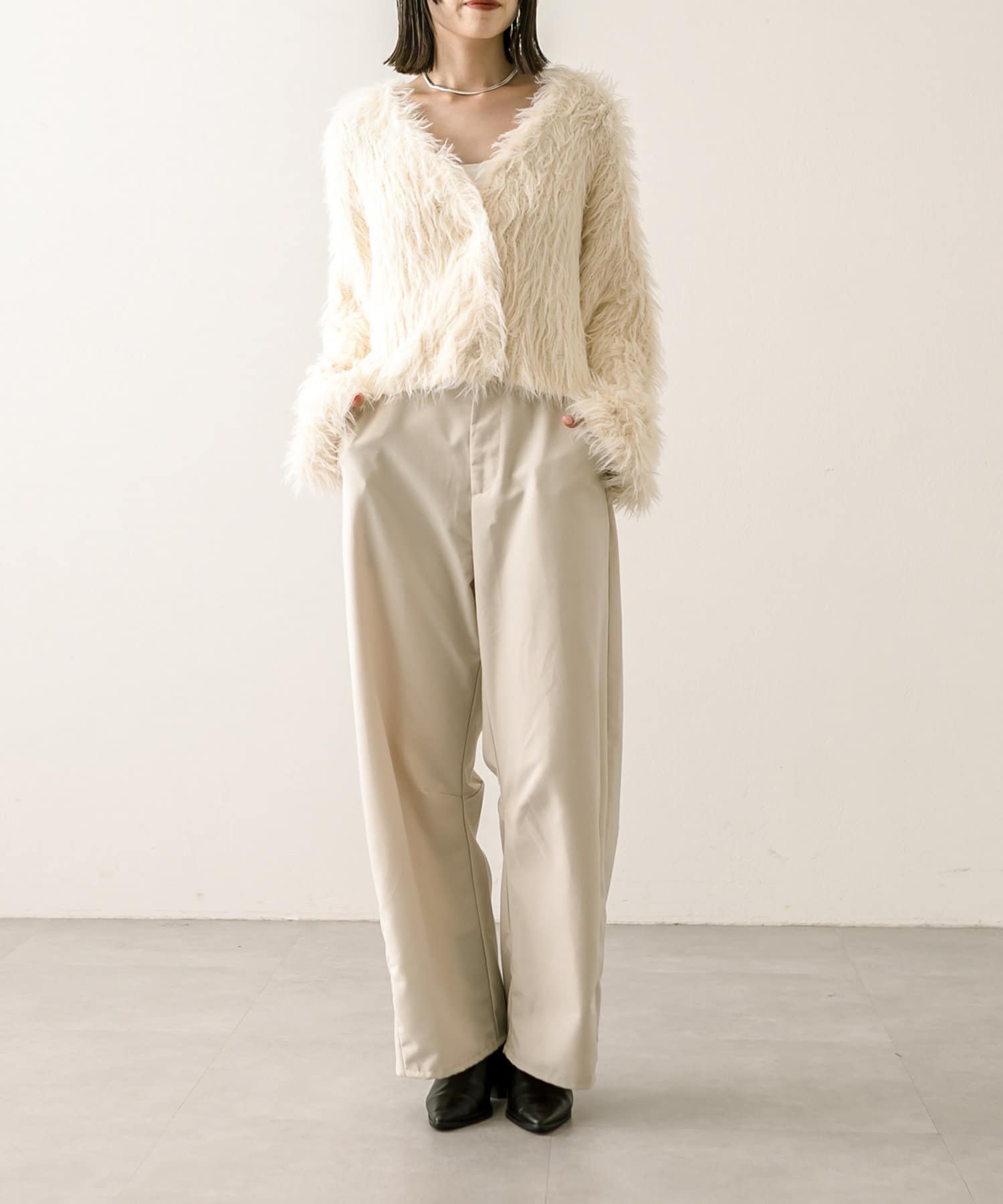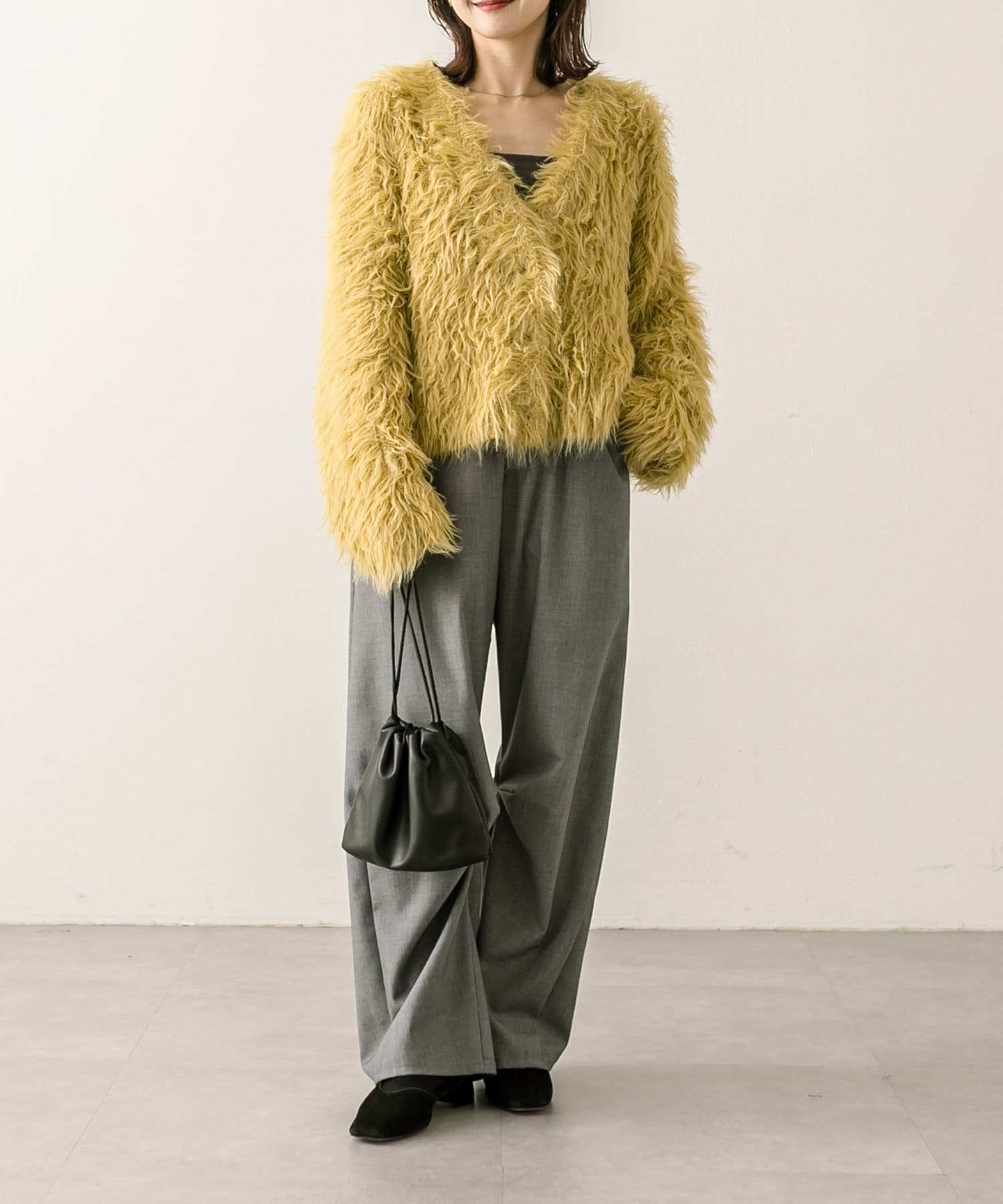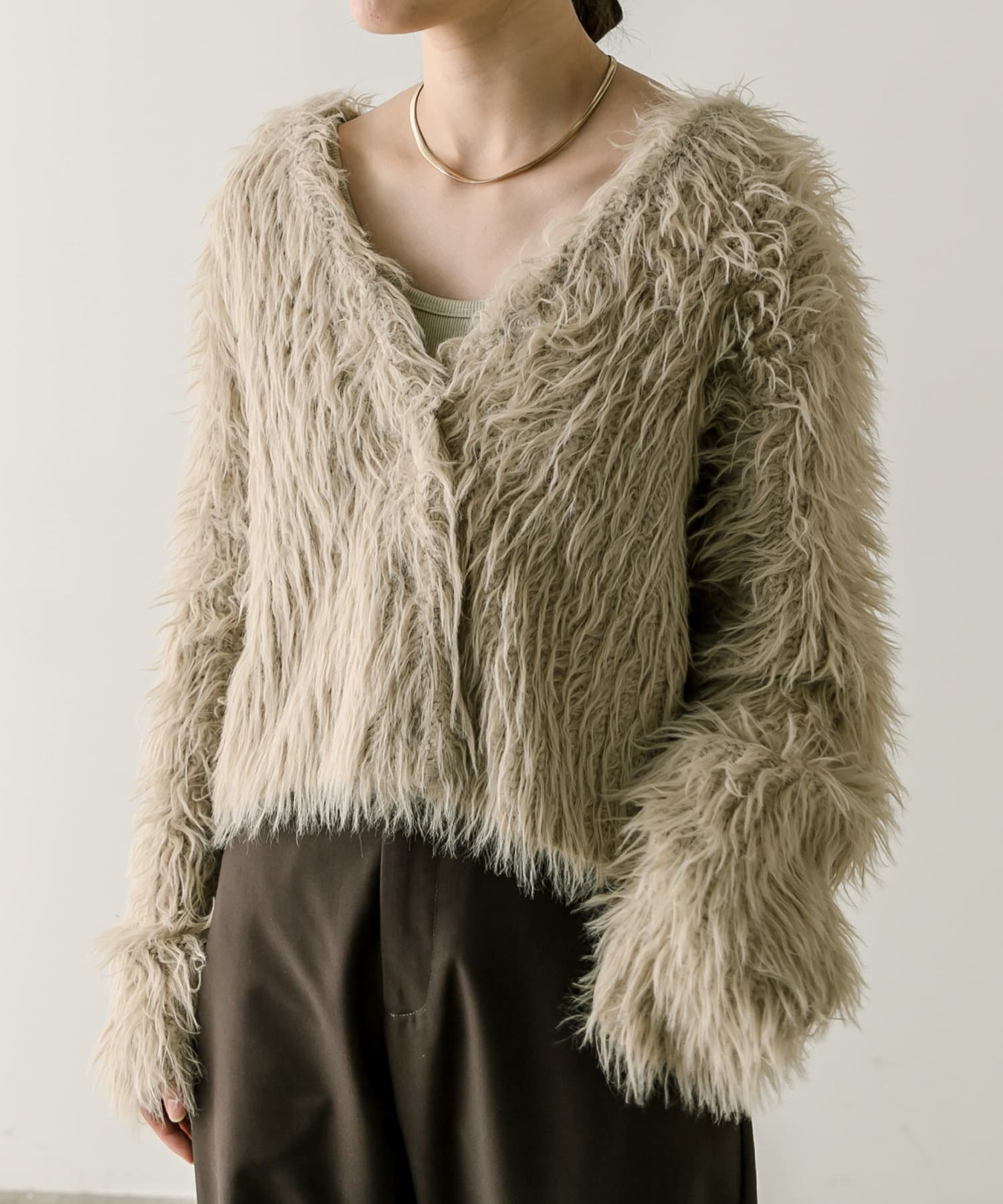 ・毛足が長くボリューム感がありながら、Vネックなので首回りはすっきり。