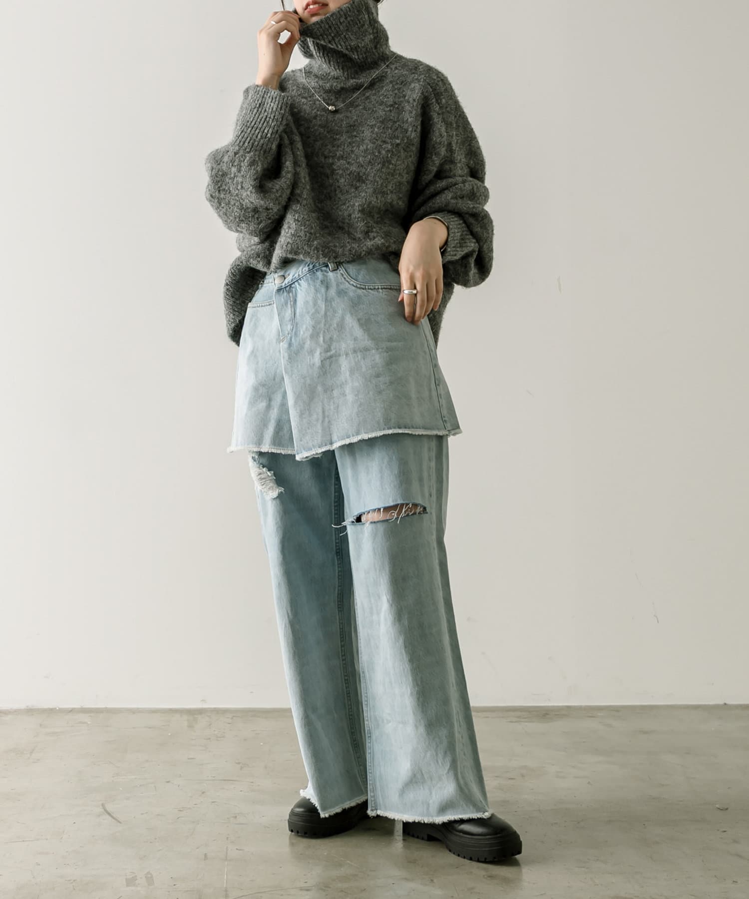・ややボリューム感のあるシルエットなので、ミニ丈ボトムで脚見せすることですっきり決まります。