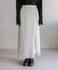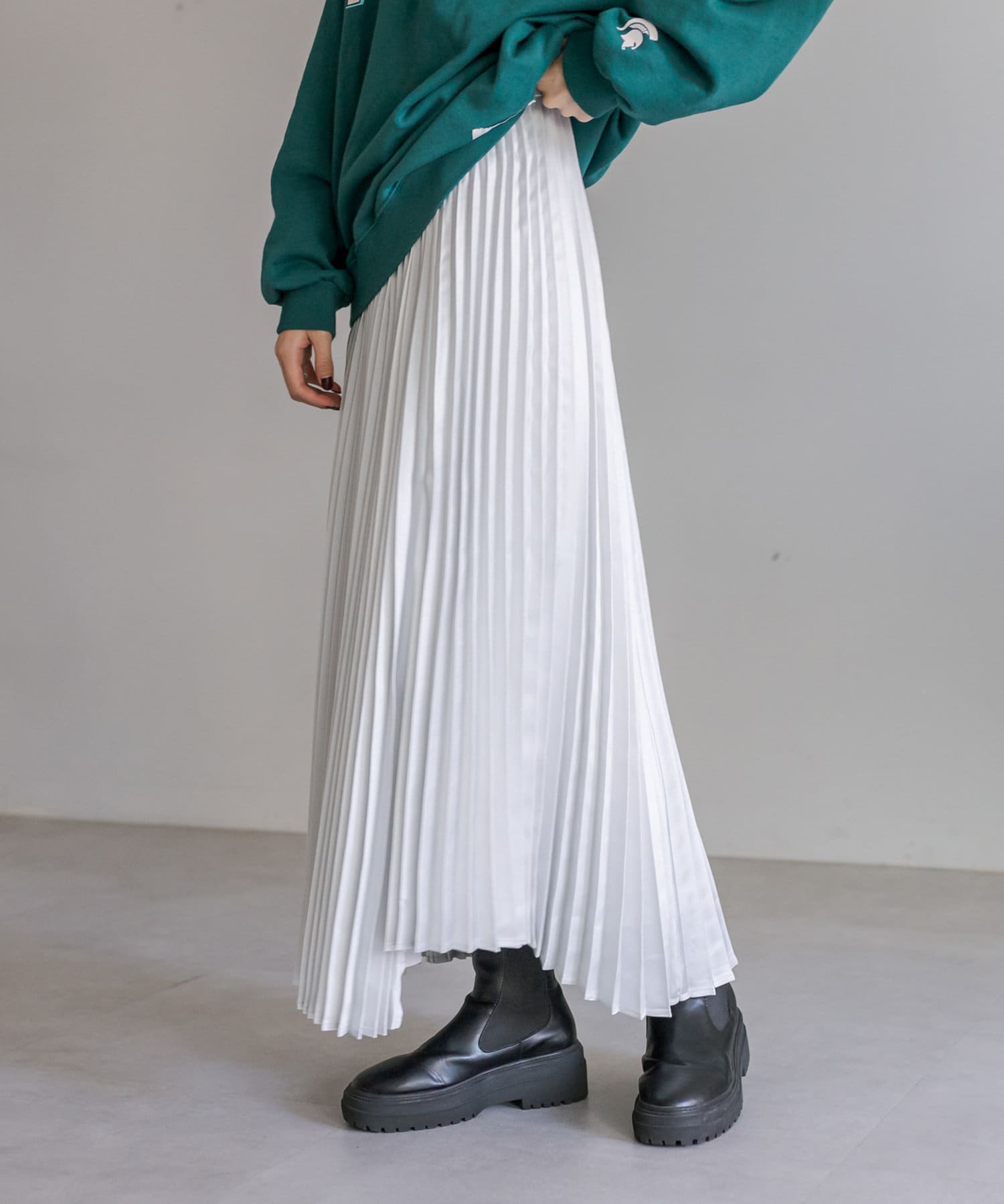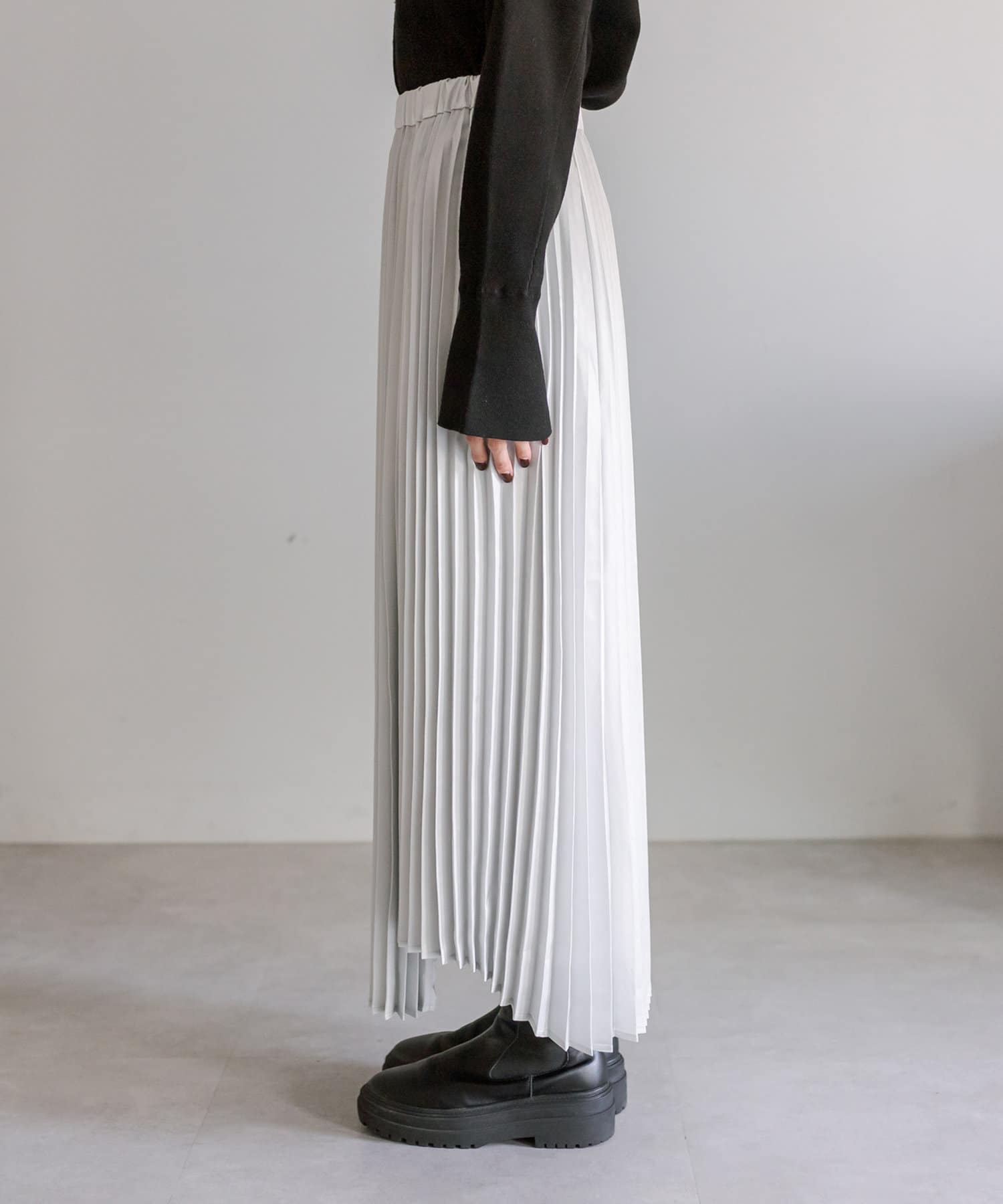 深めのスリットから動くたび目を惹くアシンメトリーなプリーツスカート