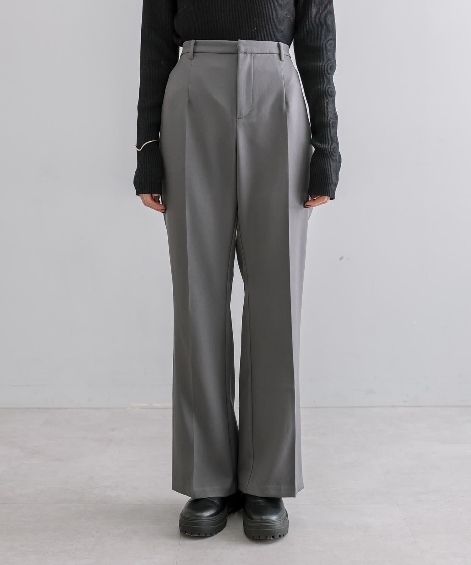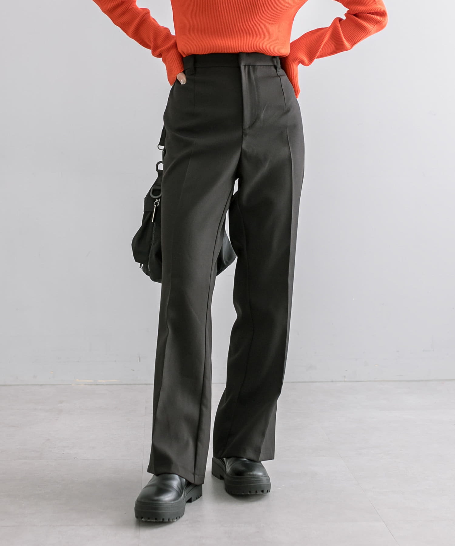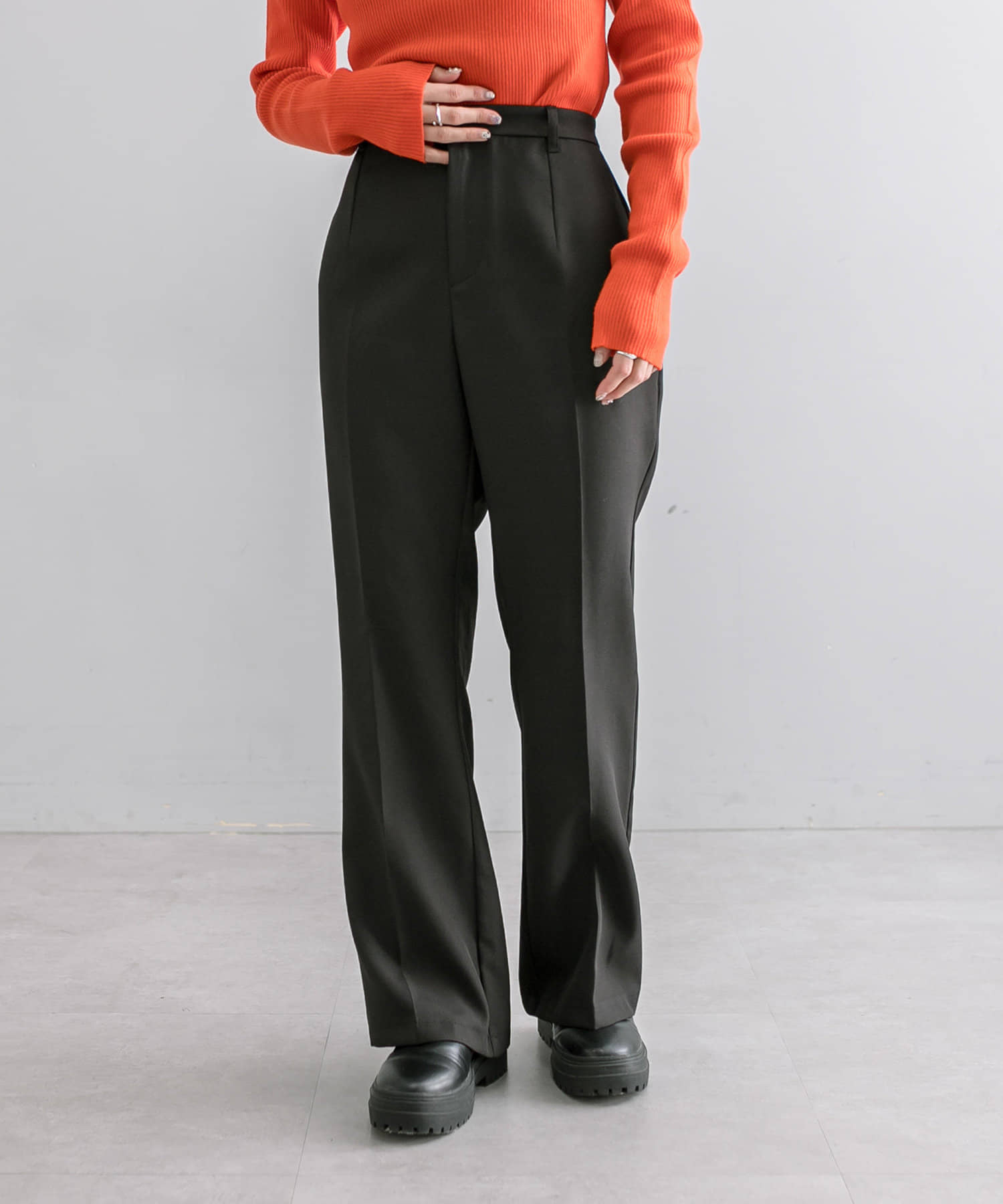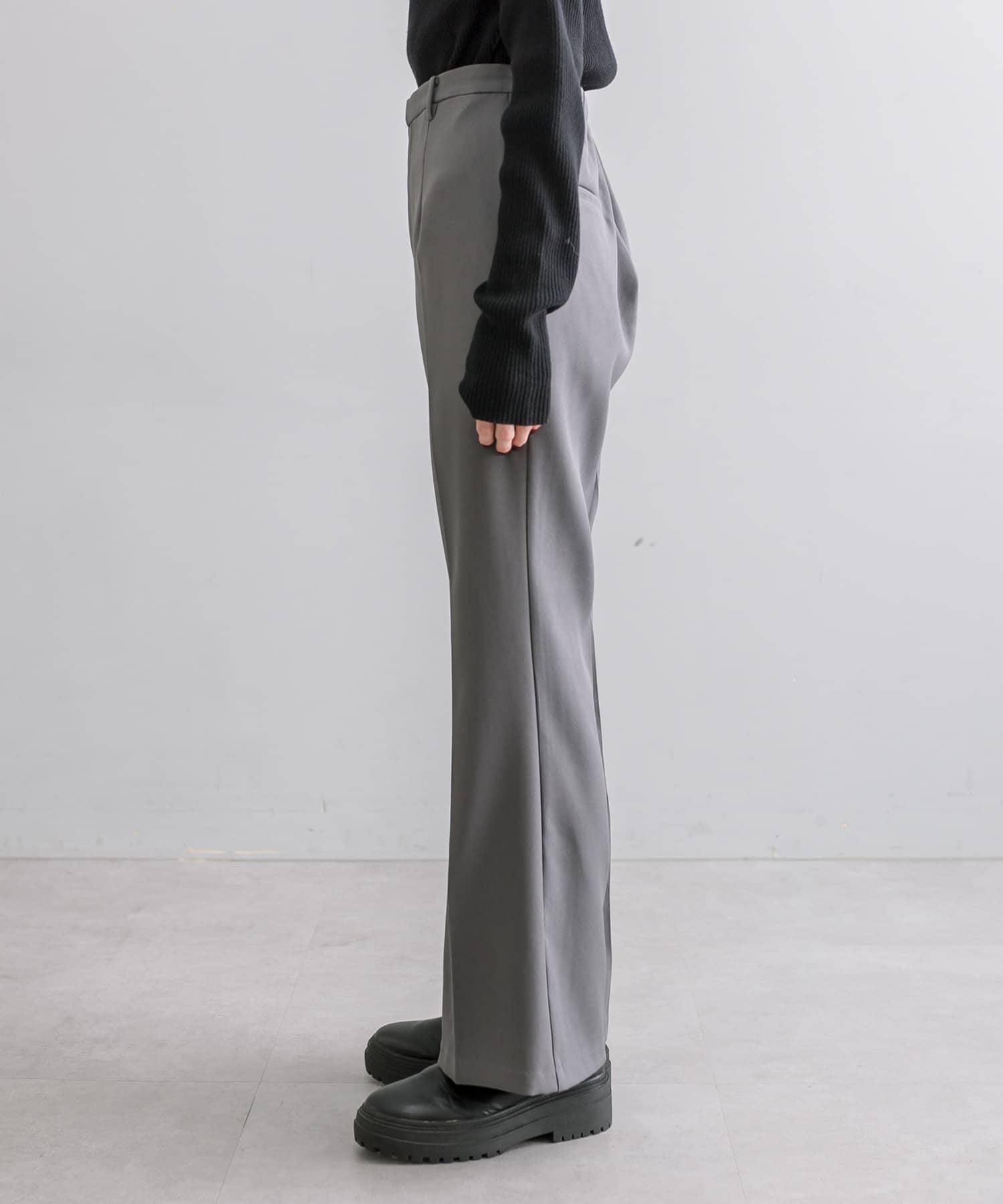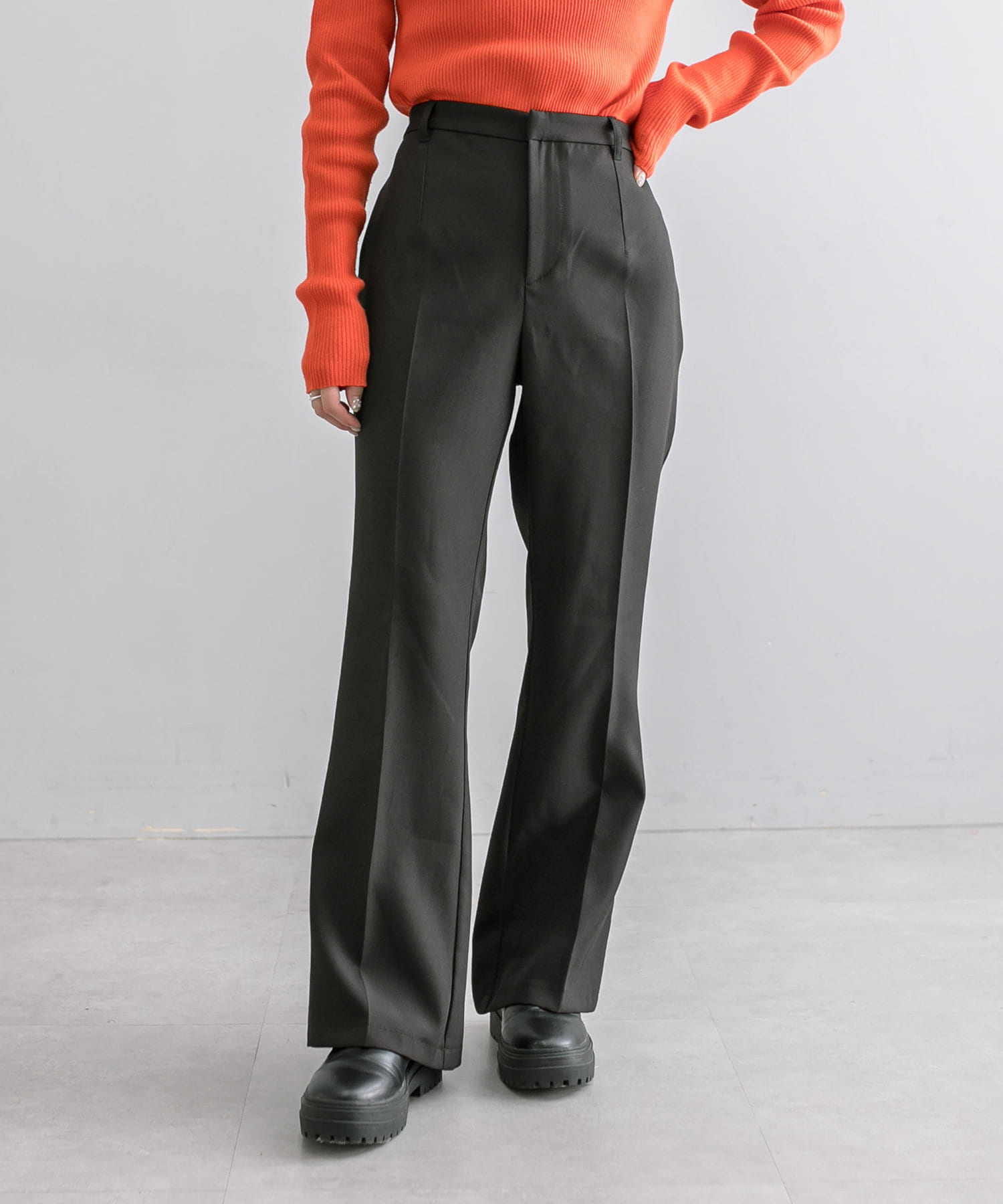 ・センタープレスライン×フレアシルエットがより美脚効果を発揮するスラックスパンツ。