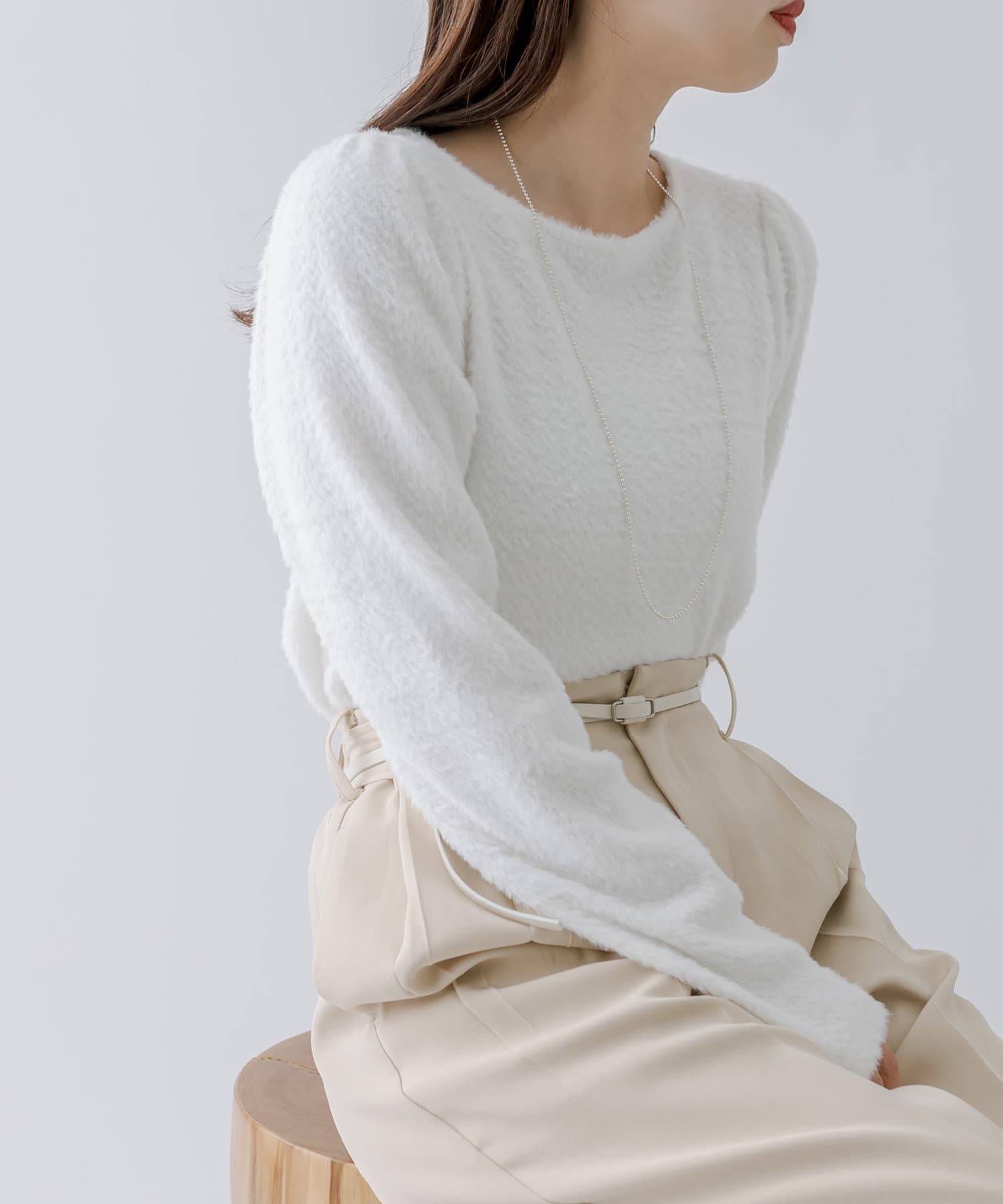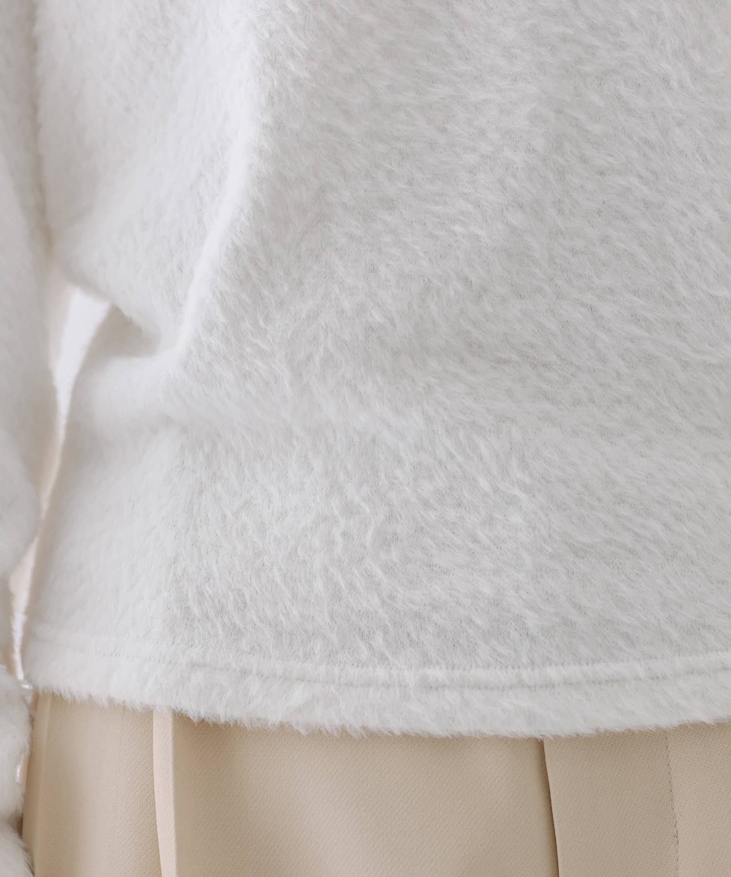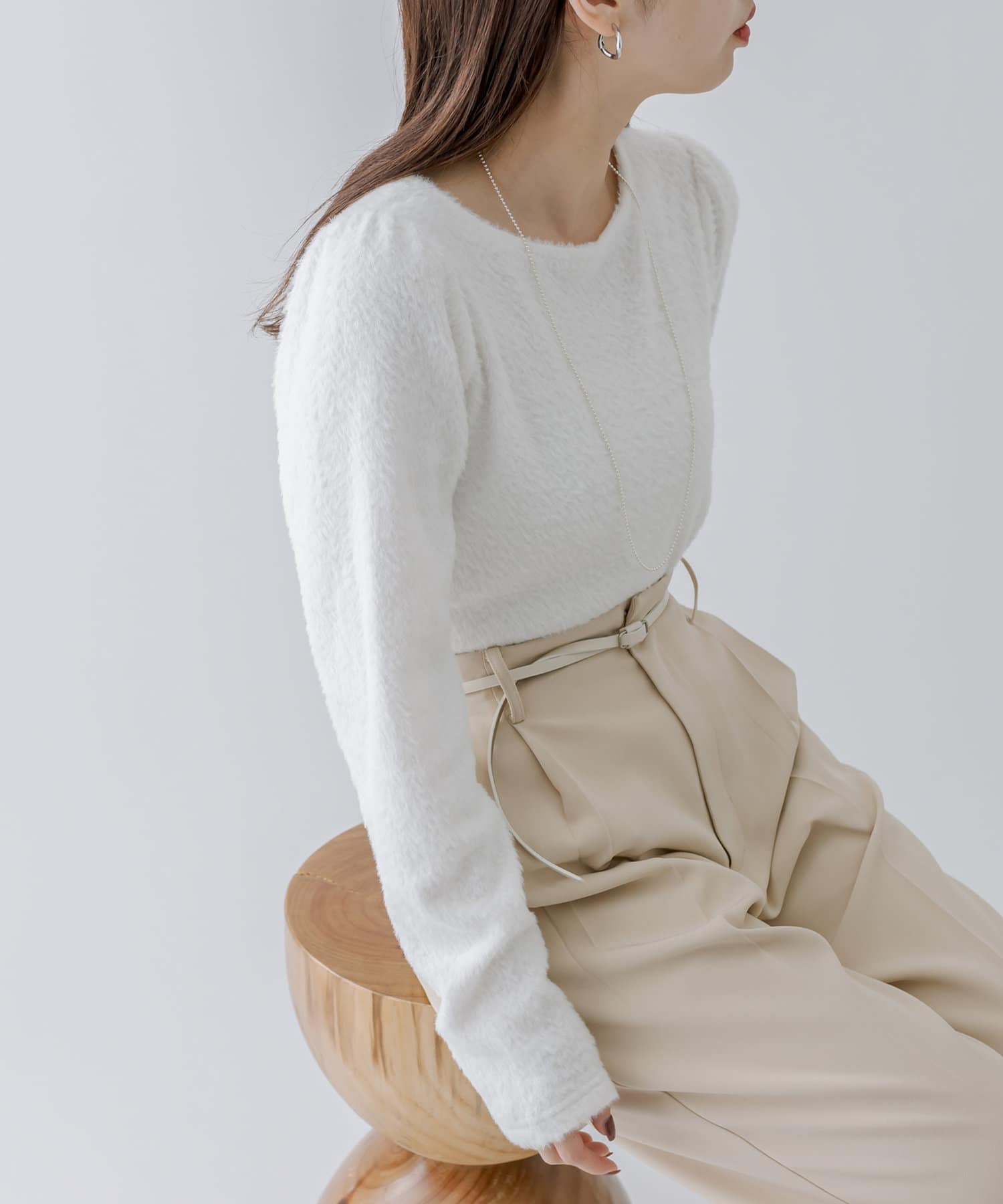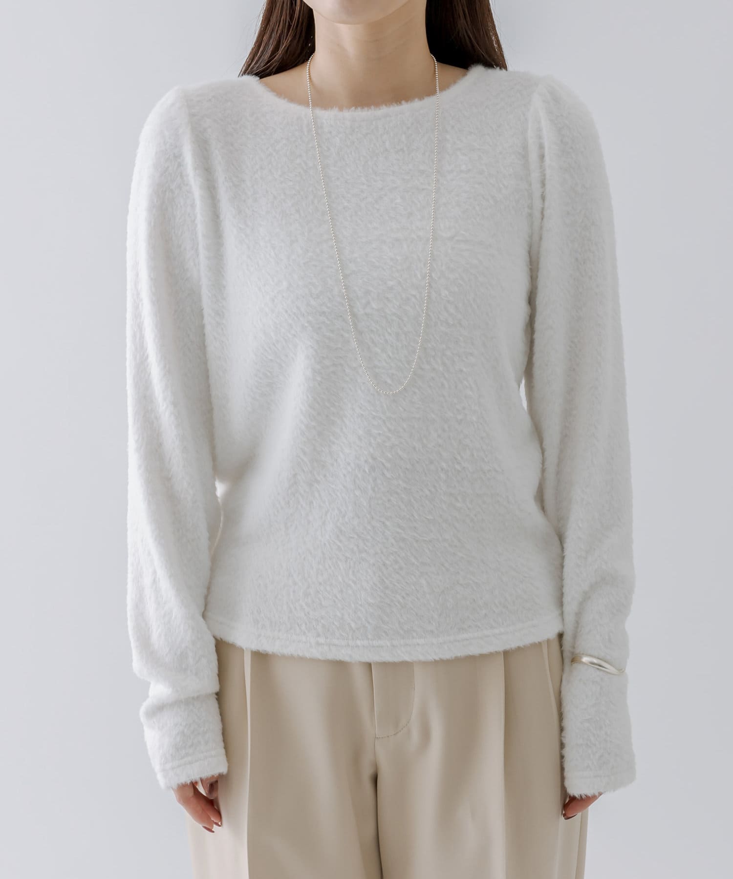 シャギー素材がスタイリングを華やかに見せてくれるシンプルトップス。